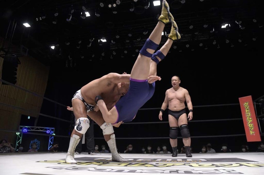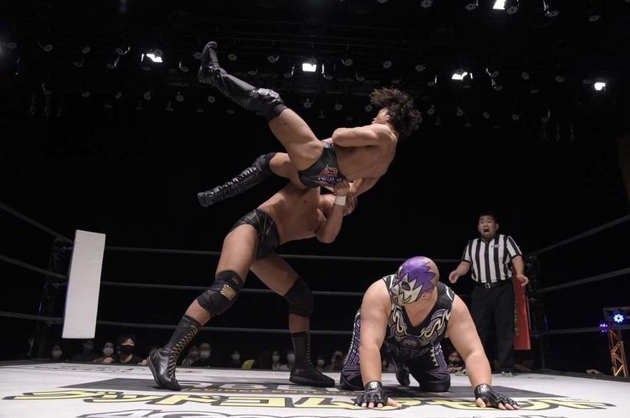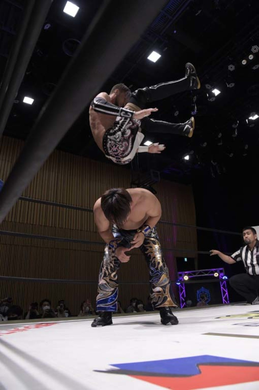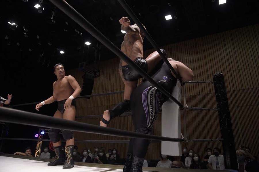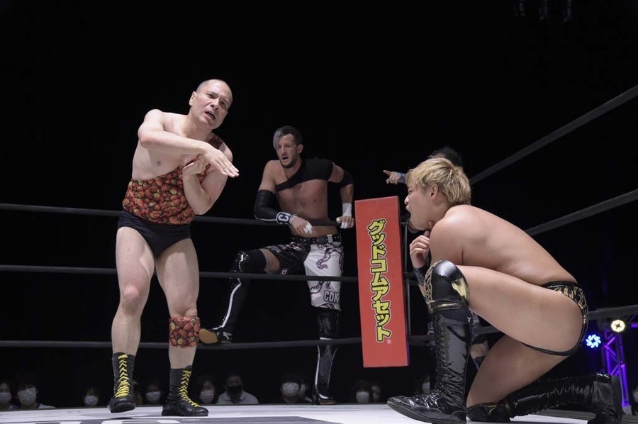 遠藤と樋口で開始のゴング。樋口が腕を取って優位に試合を進めるも、遠藤は髪を掴んで脱出。樋口がチョップを放つと、遠藤は場外に退避。距離を取っていく。ポーリーと坂口にタッチ。坂口が打撃のラッシュを見せると、ポーリーも打撃勝負。蹴り足を掴んだポーリーがぶっこ抜いてフィッシャーマンバスター。ここからDAMNATIONが代わる代わる坂口を捕まえる展開に。坂口がダッシュミドルを決めて樋口にタッチするも、ポーリーがレフェリーの視界を塞いでおりタッチ成立ならず。坂口の苦しい時間が長くなる。坂口が再度ポーリーにダッシュミドルを決めてようやく樋口にタッチ。樋口がタックルでポーリーを吹っ飛ばすと、打撃の打ち合い。しかしポーリーはカウンターのテーズプレス。ポーリーから遠藤にタッチ。遠藤は樋口をコーナーに振ろうとするが、力で逆に振り返し。突っ込む樋口に遠藤は丸め込み、そこからゆりかもめへ。樋口が潰すもカウント2。ポーリーが飛び込み、遠藤がポーリーを踏み台にムーンサルトを狙うも、樋口がフェイスバスターでポーリーに遠藤を叩き付ける。遠藤が場外に退避するが、坂口が攻撃を加えリング内に戻すと、樋口のチョップが遠藤を捕らえる。串刺し攻撃からカナディアン・バックブリーカー。ポーリーがカット。坂口が入ってポーリーを蹴散らすも、遠藤が2人まとめてハンドスプリング・オーバーヘッドキック。ポーリーにタッチ。ポーリーが串刺しボディアタックからボディプレスもカウント2。さらにSTFで樋口を捕らえる。坂口がカットに入ると、遠藤が飛び込み坂口を場外へ。今度こそポーリーを踏み台にムーンサルトを放つが樋口がかわし自爆。樋口が遠藤をチョークスラムでポーリーに叩き付ける。樋口がエプロンからロープを使ってのエルボードロップ。カウント2。さらにブレーンバスターを狙うがポーリーが投げ返す。ポーリーと樋口がラリアット相打ち。坂口が飛び込み、ポーリーの後頭部に神の右膝。樋口がラリアットもカウント2。樋口がパワーボムの体勢に入るも、ポーリーは脱出。ハンマーを連発し、ロープに走ると、樋口は強烈なぶちかまし。ポーリーも返せず3カウント。試合後樋口と遠藤が視殺戦を展開した。