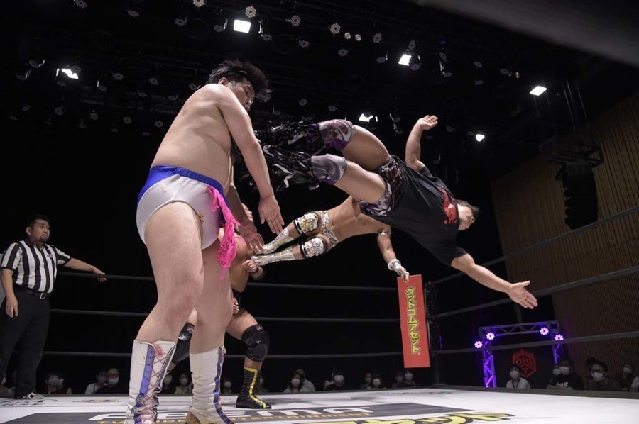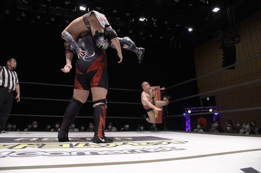 T-Hawkと彰人で試合開始。彰人が足攻めを見せようとすれば、T-Hawkは逆水平を狙い、互角の攻防を展開。竹下と佐々木にタッチ。竹下は「ブルアッ!」と欠場した飯野のポーズを連発する。佐々木がタックルで向かって行くが、逆に竹下がタックルで倒すと、ハカエルボーを狙ってハカを始めるが、佐々木は退避。竹下は「1分間くらいの記憶が無い……」と言って勝俣にタッチ。佐々木も高尾に代わる。勝俣がコーナーに上ったところをT-Hawkがチョップで落とし、勝俣は大ダメージ。ここから#DAMNHEARTSが勝俣を代わる代わる捕まえる展開に。竹下も助けに飛び込むが、T-Hawkにアギラで蹴散らされてしまう。勝俣の苦しい時間が長くなるが、T-HawkにスイングDDTを決め、竹下にタッチ。T-Hawkも高尾にタッチ。竹下がフライング・ラリアットで高尾をなぎ倒すと、再びハカを開始。うろ覚えのハカをしてからハカエルボーもカウント2。ハカアピールからスピア狙いも、高尾がカウンターのエルボー。高尾が飛び付きのDDTを決め、佐々木にタッチ。佐々木が飯野のようにアピールしてから竹下にスピアを放つも、竹下はかわして彰人にタッチ。彰人が佐々木にアンクルホールド。佐々木はクロス・フェースロックで切り返すも、さらに彰人は複合関節技で切り返す。アンクルホールドに移行すると、佐々木は脱出し、飛び付いてクロス・フェースロック。彰人が押さえ込みカウント2。彰人が足横須賀から、膝殺し。アンクルホールドへ。彰人のバックドロップを着地すると、佐々木が彰人をロープに据え置きドロップキック。T-Hawkに代わると、彰人は足殺しと見せかけ水車落とし。彰人が竹下を呼び込み連携を狙うも、ラリアットが彰人に誤爆。T-Hawkが竹下にナックルからスパインバスター。彰人から勝俣にタッチ。勝俣が丸め込みを連発するがカウント2。T-HawkがBTボムを決めるもカウント2で勝俣返す。ならばとT-Hawkがナイトライド決めると、勝俣も返せず3カウント。