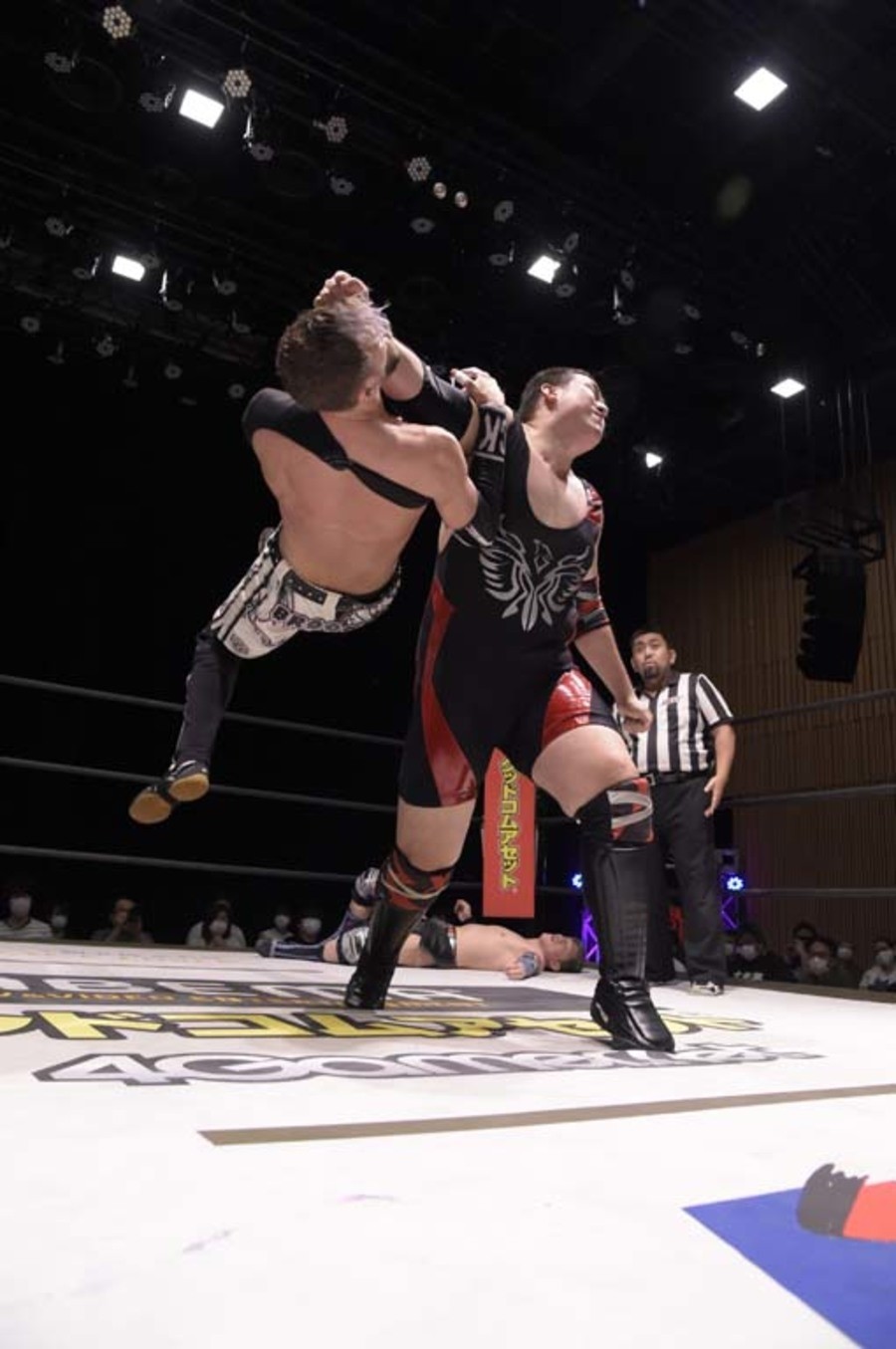 T-Hawkがマイクを持ち「23日、彰人、準決勝前に出し惜しみか? そんなんじゃな、俺には敵わんぞ。全部出して来いよ。前哨戦じゃねぇんだぞ、いつでも本番だ。全部出して来い」と言うと、彰人はエプロンに上がりマイクで「ていうかよ、何かちょっと勘違いしてんじゃねぇか? 決戦は後楽園ホールだろ? 今日出し惜しむに決まってんじゃねぇか。わざわざ対戦相手のあんたに手の内、見せるなんて俺は馬鹿なことしないよ。手の内は! 後楽園で全部出すからな」と言うと彰人は退場。T-Hawkが改めてマイクを持ち「まぁいい、結果がすべてだ。このトーナメント、俺は#DAMNHEARTSの一員でもあるし、#STRONGHEARTSを背負ってやってんだよ。今回のトーナメント、優勝するのはこの俺だ」と言い放った。