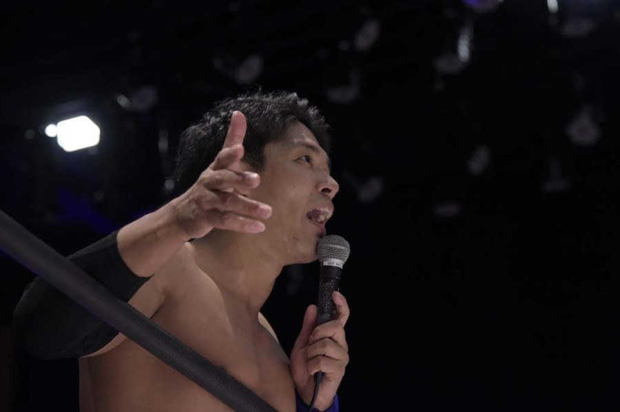 上野 うーわ、気持ち悪い……。防衛出来たわけなんですけども、一発殴られて気持ち良くなりました。吉村君なんかも何回も殴られて、僕も殴られて。このベルトを持ってるだけで色んな強い面白い人たちと試合2人でさせてもらえて、嬉しいです。どこで負けてしまうかわからないその中で、トーナメントも負けてしまいましたけど、このベルトでもっと楽しめるんじゃないかと思います。次の挑戦者はまだ決まってないですけど、誰でもいいです。どんな人でも、ヤバい人でも、ヤバくない人でも、もっともっとこれ(ベルト)で楽しみたいです。