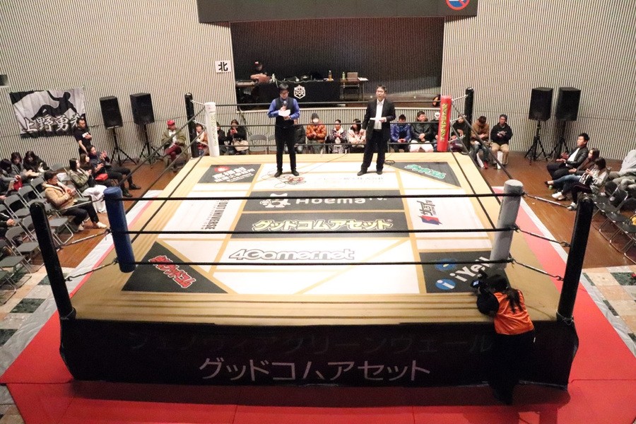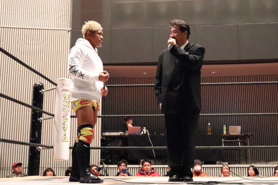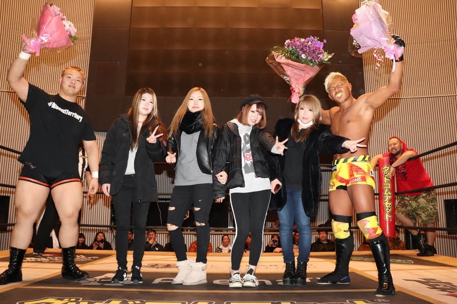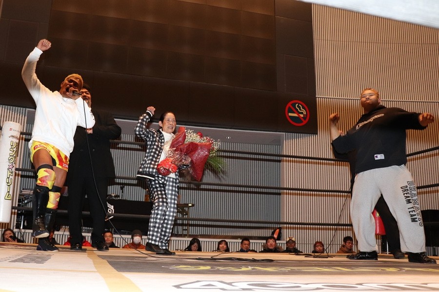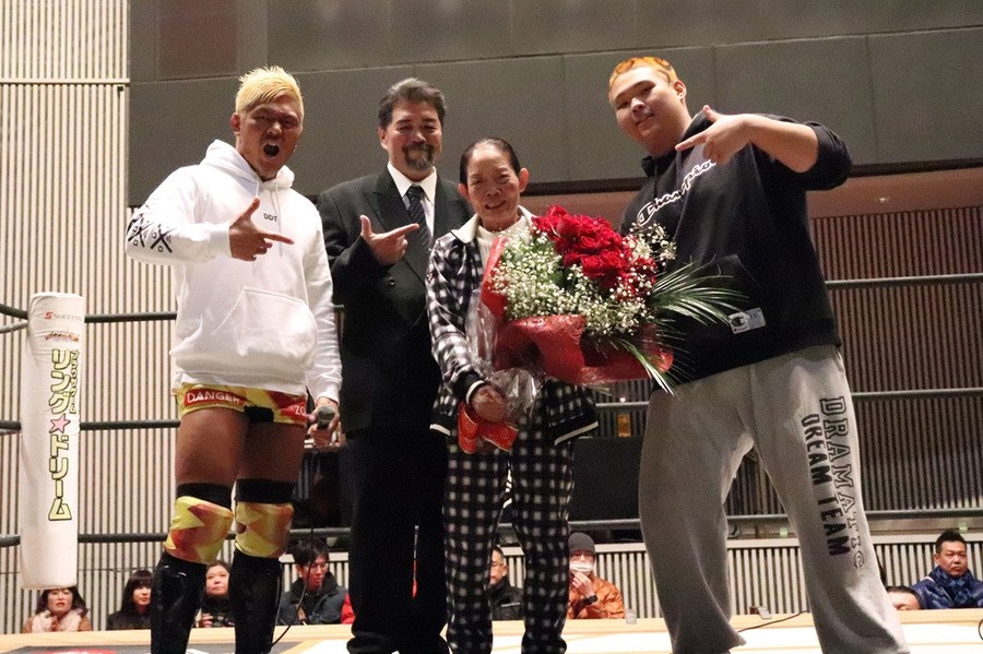 今林APの前説には地元出身の奥田と、メインで奥田とタッグを組む吉村が登場。奥田は「メインで樋口、梅田と最高に熱い試合をやるんでよろしくお願いします」と挨拶すると、津大会の協力者である中井さんをリングに上げて紹介。さらに中井さんのお母さんが誕生日だということで花束が贈呈された。最後は4人で「DDT津大会スタート!」とオープニングコール。