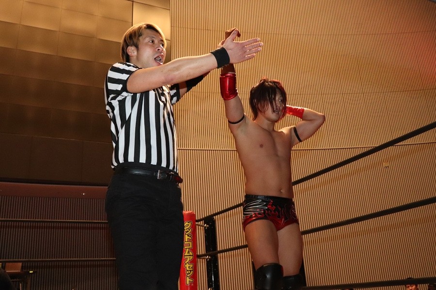 平田のダンス入場を高木が飛び蹴りで潰して試合スタート。リング内では大石が赤井にクロスボディーで攻勢に出る。平田が出てくるも大石との連係を誤爆させてやり返すと、平田にミドルキック連打。平田もラリアットでやり返して大石にタッチするとみせかけてメガネを手にして踊ろうとするが赤井が阻止。高木が出てきて平田に攻め込む。平田は高木にドロップキックで返して大石とタッチ。大石が一気呵成に攻め込む。赤井もコルバタからリーマン銀河でやり返す。赤井ダイビング・ボディーアタックをかわした大石が平田を交替。平田は高木、赤井に手刀。大石とともにメガネを装着しダンスも、踊り切ったところで赤井と高木が丸め込む。さらに赤井は平田に舞台「Fate/Grand Order THE STAGE -絶対魔獣戦線バビロニア-」でも披露した変形の逆打ちで勝利した。