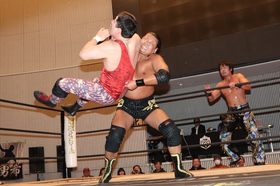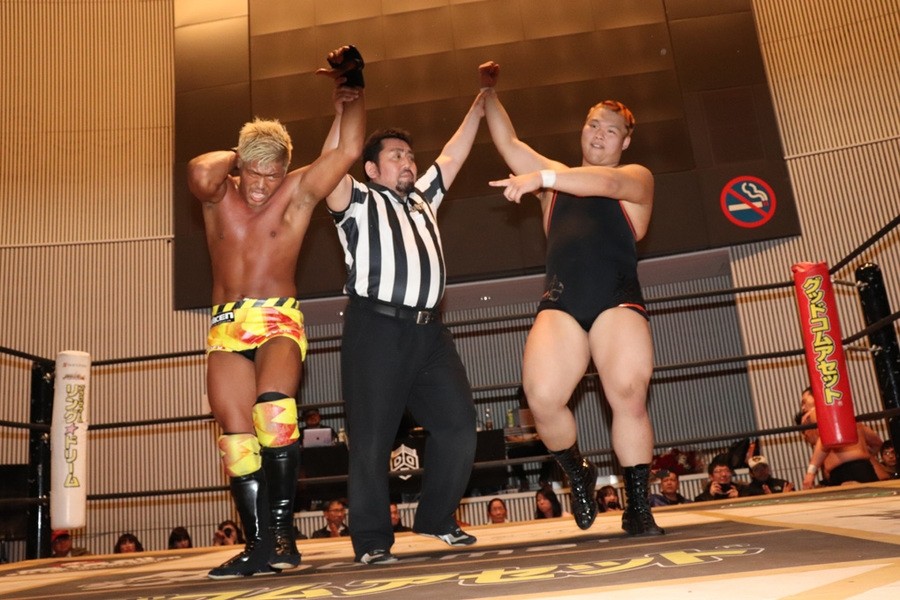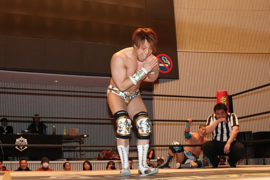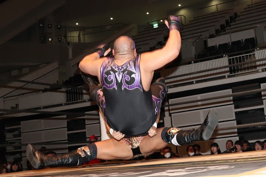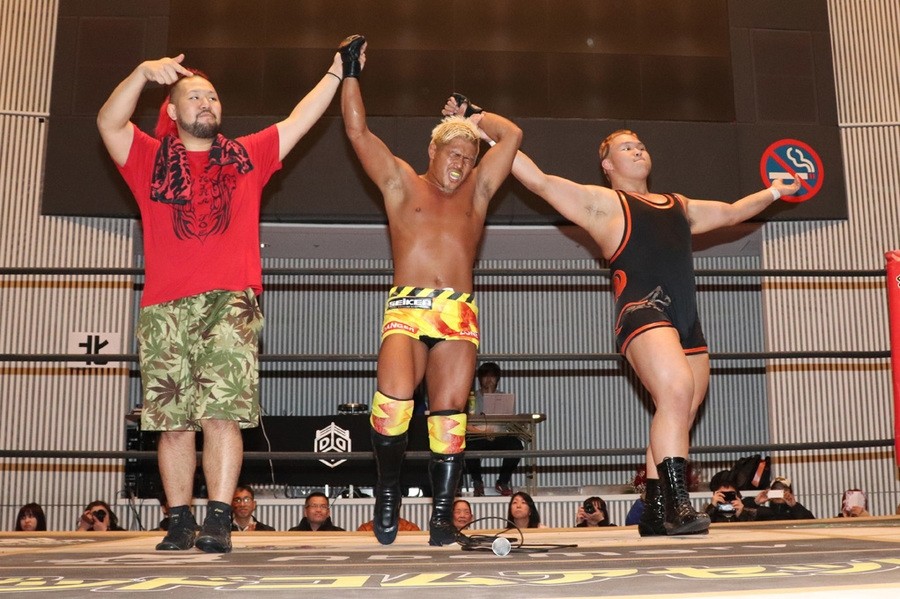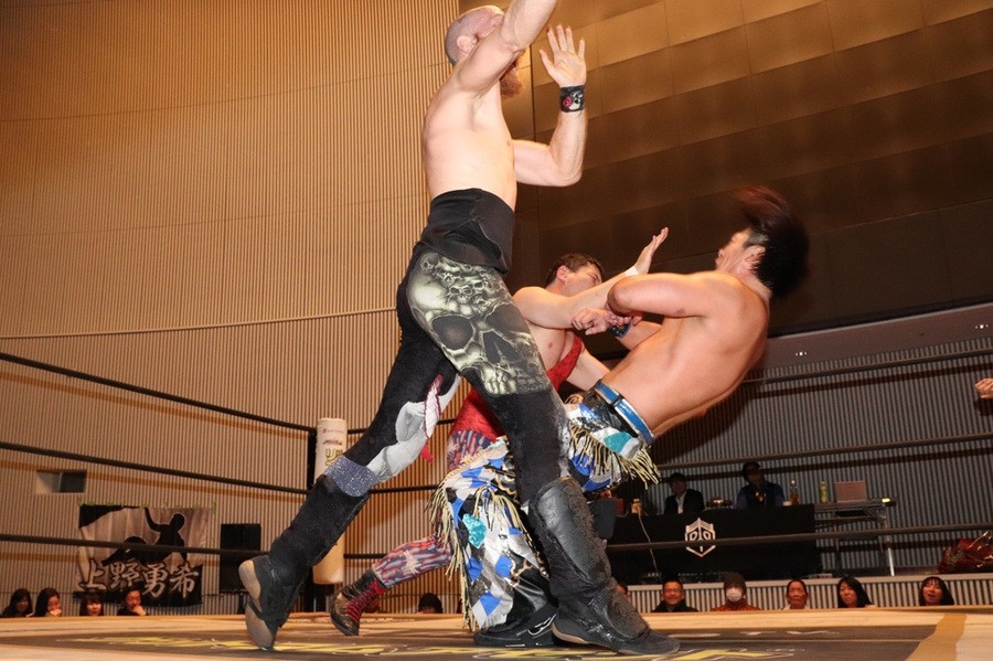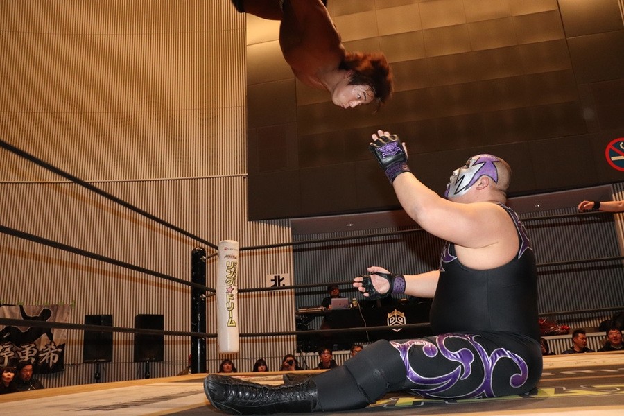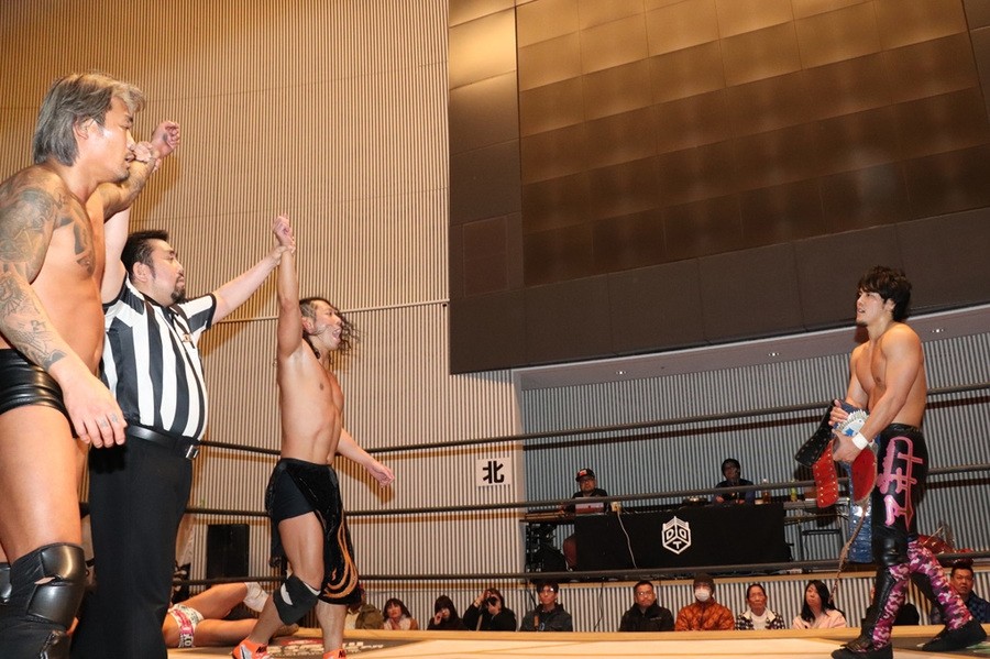 酒呑童子に捕まってローンバトルを強いられた上野。高梨をボディースラムで叩きつけるも、高梨に足を取られてタッチは阻止されてしまう。高梨のドロップキックをカウント2で返した上野は打点の高いドロップキックを決めてようやくMAOとタッチ。MAOは高梨、救出に入った坂口を重ねてハリウッドスタープレス式のセントーン。高梨も低空ドロップキックで反撃して坂口とタッチ。MAOのコブラツイストを坂口が抜け出す。MAOはサイドエフェクト式Hエッジでやり返して上野に託す。上野はミサイルキックからバックブリーカー、逆エビ固めで攻め込むが、アンクルホールドで切り返されてしまう。坂口がスリーパー、ハイキック、神の右膝と畳みかけて勝利。