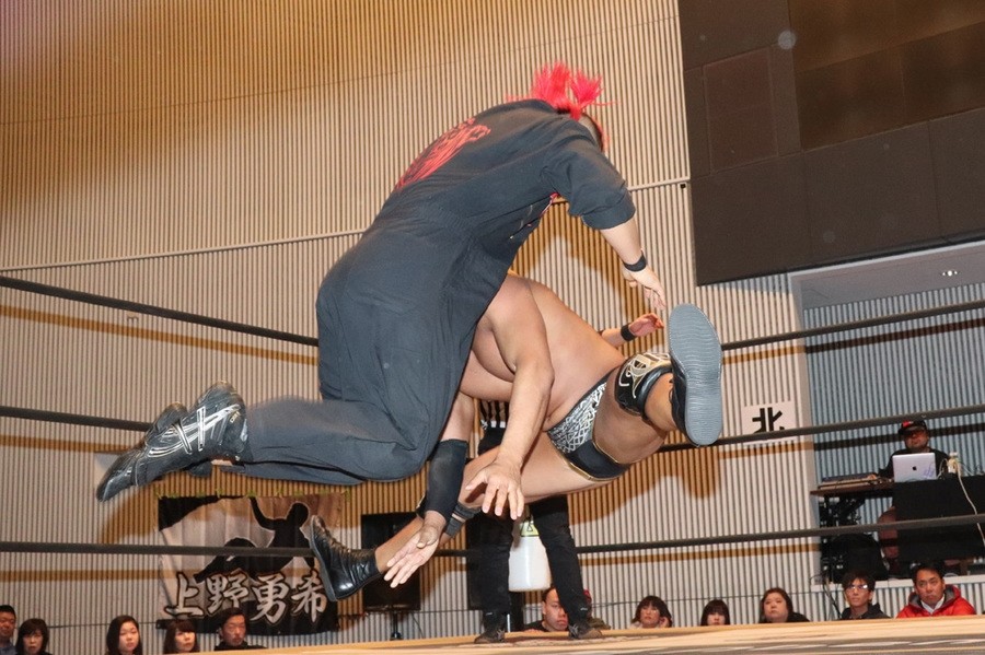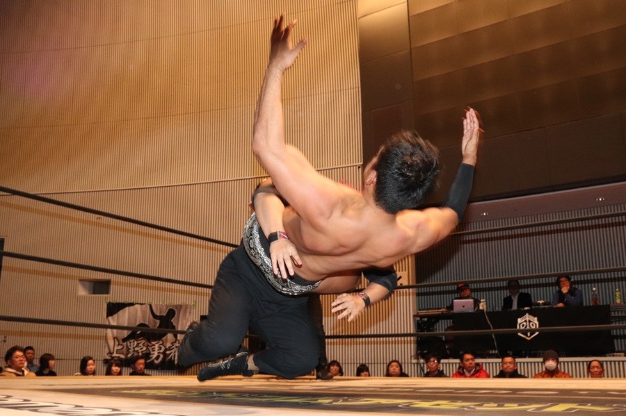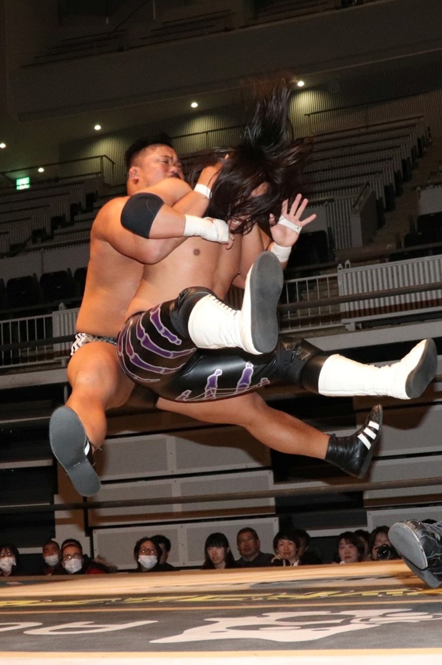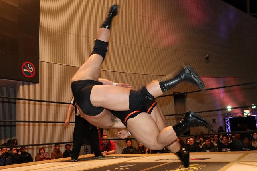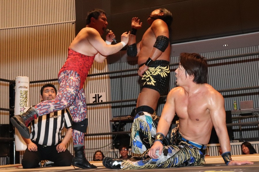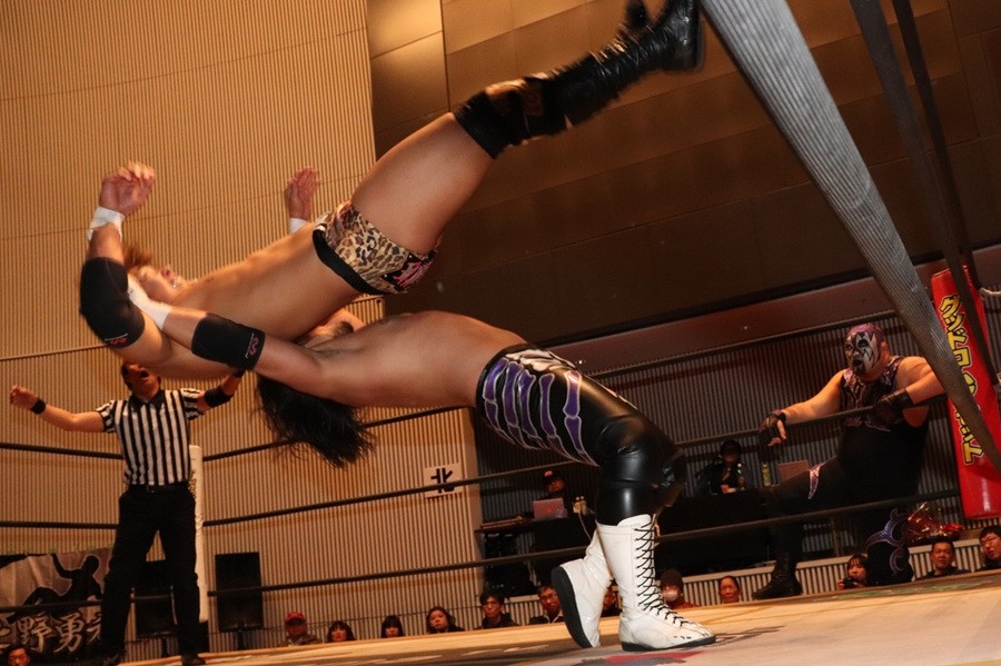 酒呑童子に捕まってローンバトルを強いられた上野。高梨をボディースラムで叩きつけるも、高梨に足を取られてタッチは阻止されてしまう。高梨のドロップキックをカウント2で返した上野は打点の高いドロップキックを決めてようやくMAOとタッチ。MAOは高梨、救出に入った坂口を重ねてハリウッドスタープレス式のセントーン。高梨も低空ドロップキックで反撃して坂口とタッチ。MAOのコブラツイストを坂口が抜け出す。MAOはサイドエフェクト式Hエッジでやり返して上野に託す。上野はミサイルキックからバックブリーカー、逆エビ固めで攻め込むが、アンクルホールドで切り返されてしまう。坂口がスリーパー、ハイキック、神の右膝と畳みかけて勝利。