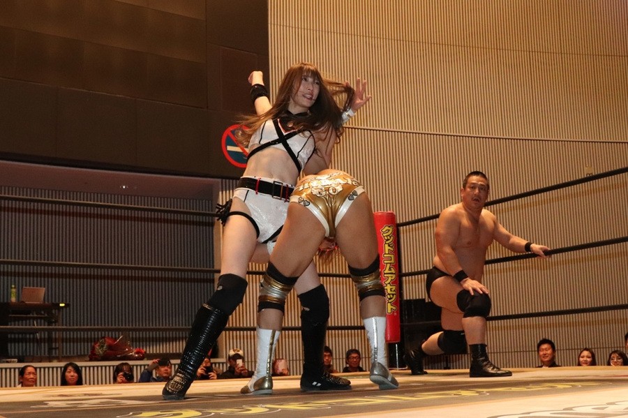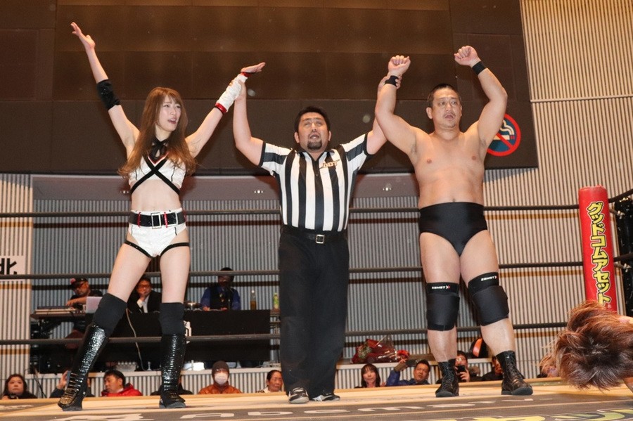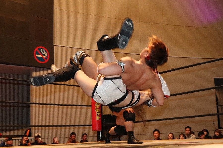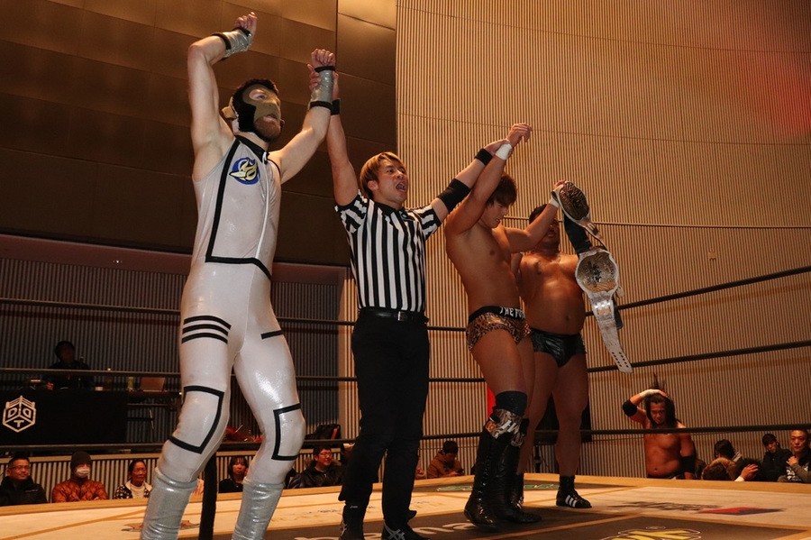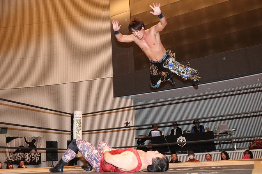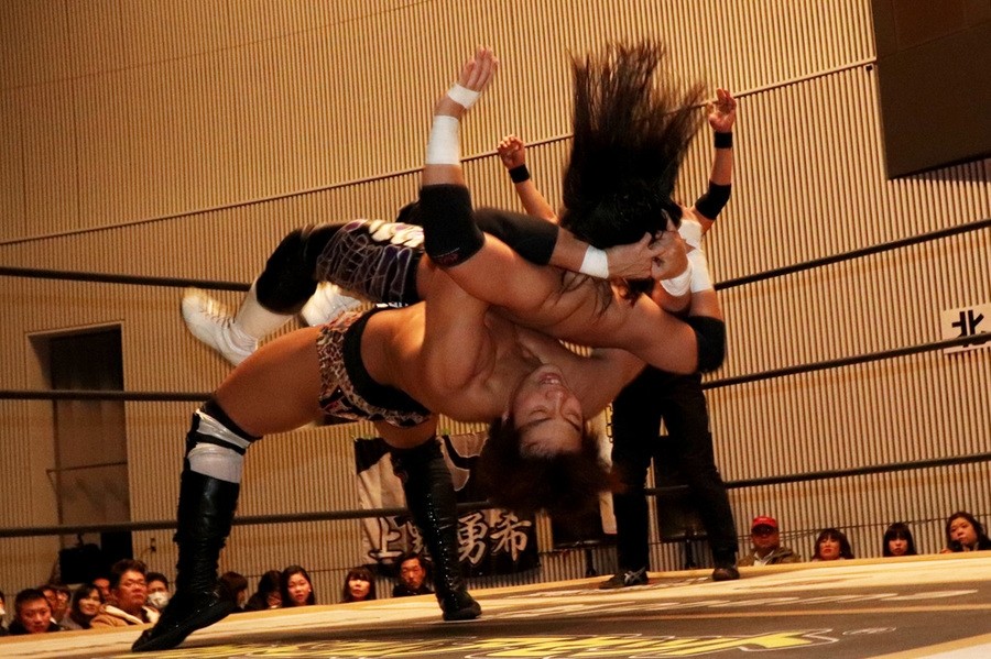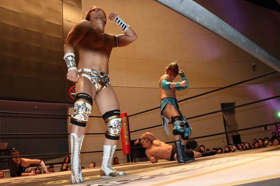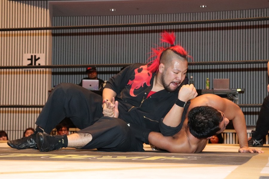 酒呑童子に捕まってローンバトルを強いられた上野。高梨をボディースラムで叩きつけるも、高梨に足を取られてタッチは阻止されてしまう。高梨のドロップキックをカウント2で返した上野は打点の高いドロップキックを決めてようやくMAOとタッチ。MAOは高梨、救出に入った坂口を重ねてハリウッドスタープレス式のセントーン。高梨も低空ドロップキックで反撃して坂口とタッチ。MAOのコブラツイストを坂口が抜け出す。MAOはサイドエフェクト式Hエッジでやり返して上野に託す。上野はミサイルキックからバックブリーカー、逆エビ固めで攻め込むが、アンクルホールドで切り返されてしまう。坂口がスリーパー、ハイキック、神の右膝と畳みかけて勝利。