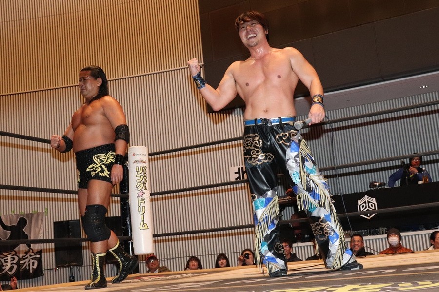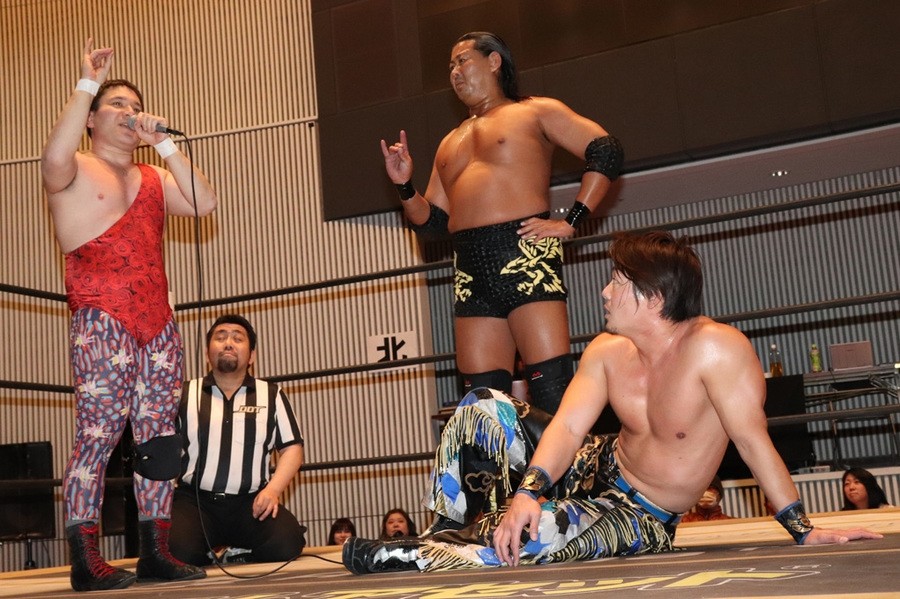 奥田と吉村には花束が贈呈されるも、それを使って奥田と吉村が樋口&梅田に襲い掛かって開始のゴング。セコンドの定も手を出す荒々しい場外戦。リングに戻ると奥田が樋口に水車落とし。樋口は奥田にショルダーアタック。梅田がミドルキックで続く。ローンバトルを強いられた奥田は延髄斬りでようやく逆転。替わった吉村がショルダーアタック。救出に入った樋口もまとめてコーナースプラッシュ。梅田にはベアハッグ・スープレックスもカウント2。マフラーホールドは梅田がロープに逃げる。梅田は吉村に顔面フロントハイキックでやり返す。樋口が出てきて吉村とラリアットの打ち合い。吉村がバックドロップを決めれば、返す刀で樋口がラリアット。戦況は奥田vs梅田。スナップメイヤーからローキックを打ち合うと梅田が串刺しミドルからランニング串刺しドロップキック。梅田のソバット → 樋口がアトミックドロップからダブルチョップ。さらに梅田がPKにつなぐ。これは吉村がカット。奥田が卍固め。樋口がアイアンクローからダブルチョップでカット。吉村が樋口を蹴散らすと梅田に奥田のスペース・トルネード・オクダ+吉村のマッケンロー。奥田と梅田でミドルのラリー。梅田がジャーマンからニーアタック。奥田もファイアーマンキャリー → ハイキックをブチ込むと最後はジャーマンで地元凱旋を白星で飾った。