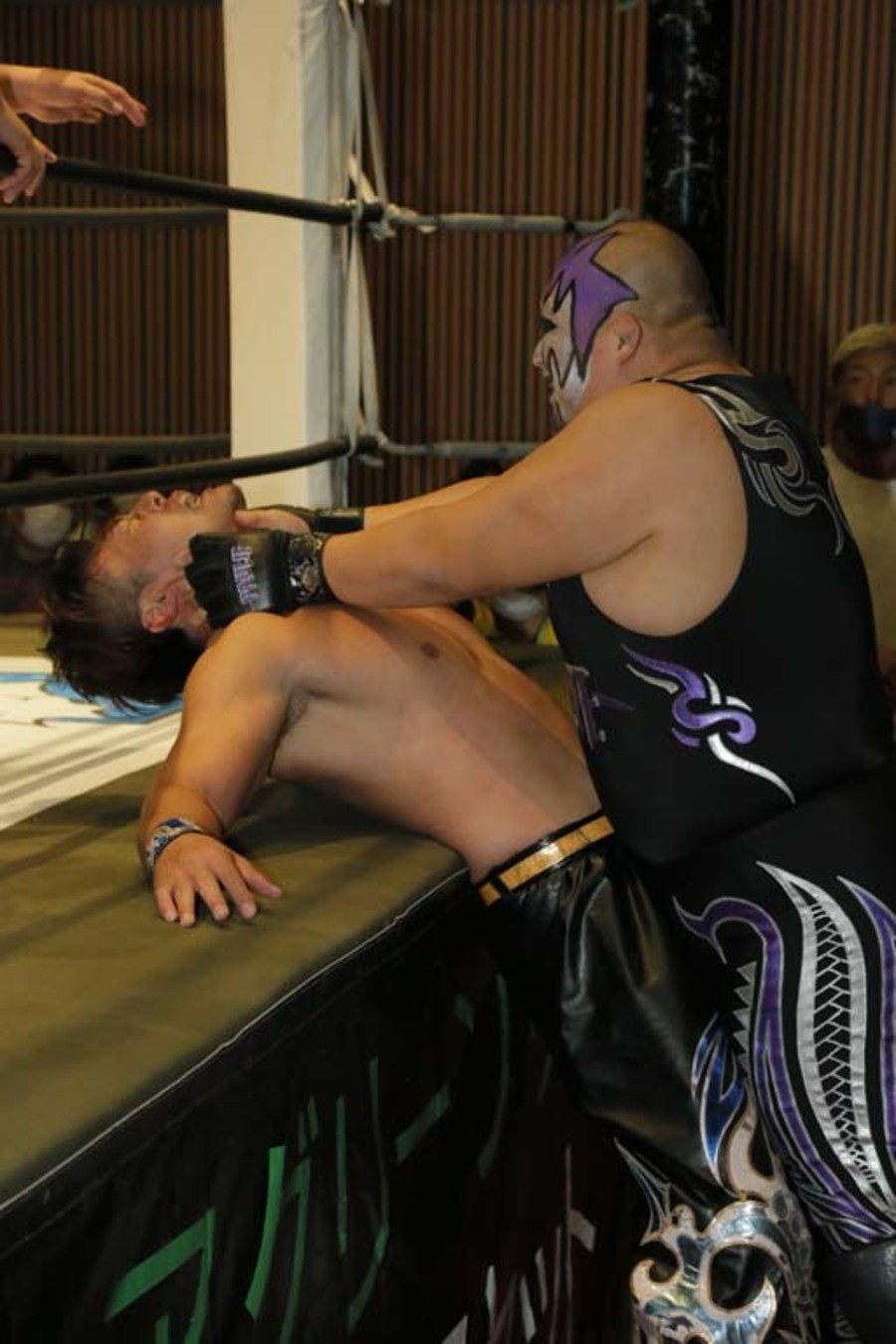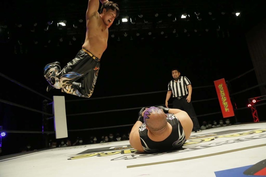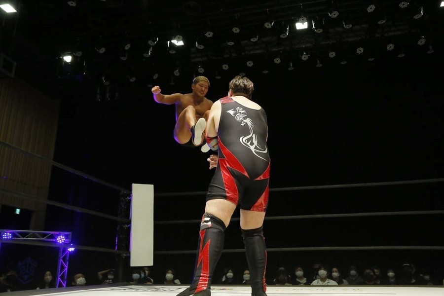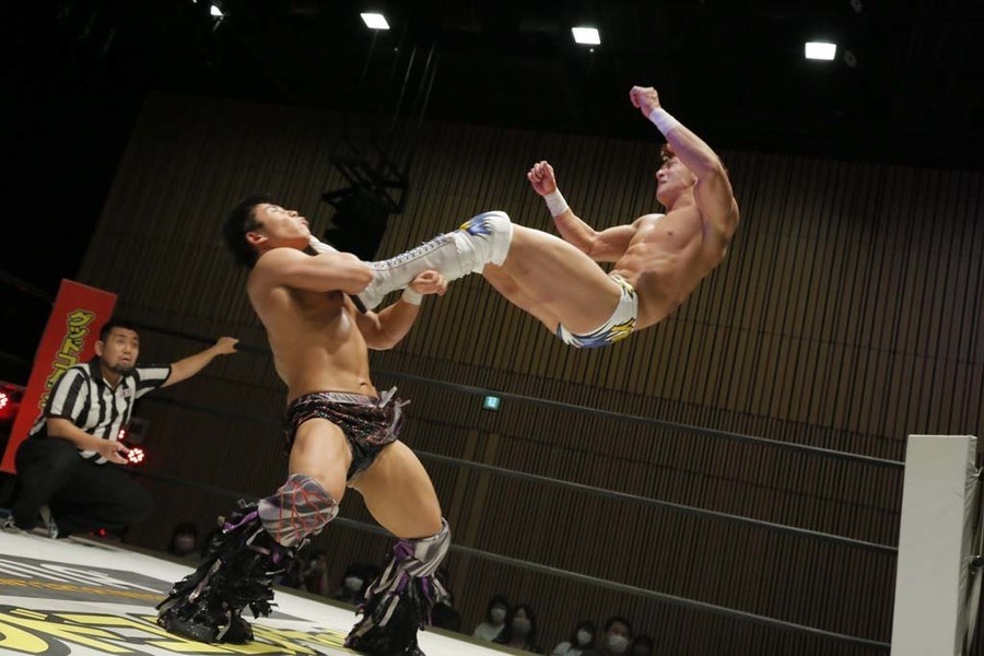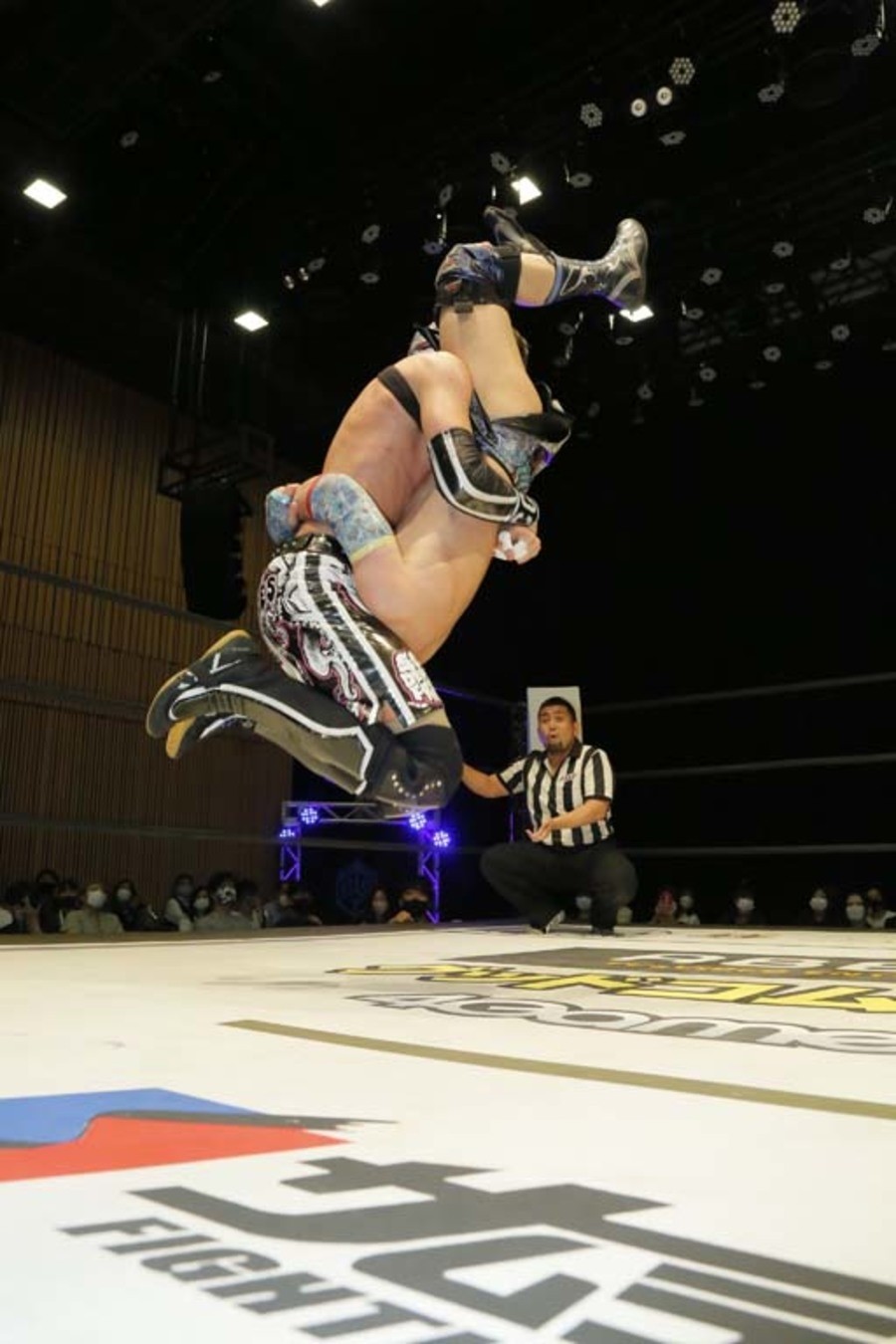 島谷が開始前に握手を求めると、上野も応える。島谷はクリーンに離れて開始のゴング。バックの取り合いからロープを走ってのスピーディな攻防、ドロップキックも交錯。会場から拍手が巻き起こる。しかし突如島谷がサミングから丸め込みもカウント2。しかし上野がドロップキックで場外に落とすと、上野がプランチャを放つも島谷は看板で迎撃。島谷が「このグリーンボーイが!」と場外で蹂躙しリング内に戻す。島谷はサミング。奇声を上げながら島谷が反則を交えながら優勢の状態が続く。島谷はランニング・エルボー、バックドロップで追い込む。変形のキャメルクラッチは上野が何とかロープへ。島谷のブレーンバスター狙いは上野がぶっこ抜いてブレーンバスターで投げていく。上野のおっぴろげアタックは島谷が回避。コーナーで宙づりにしてドロップキック。島谷の飛び付きスイングDDTは途中で止めた上野がブレーンバスターで投げる。背面へのおっぴろげアタックから上野がコーナーへ。島谷も追いかけコーナー上での攻防になると、上野がサドンインパクトでコーナーに叩き付けると、ミサイルキック。カウント2。島谷がサミングをすれば、上野はエルボー。ここで両者エルボー合戦。島谷が飛び付いてのスイングDDTからフィッシャーマンバスターは上野がカウント2で返す。逆打ちを狙うも、上野は耐える。上野がドロップキックからブリザード・スープレックス・ホールド、カウント2。ならばと上野はBME。これが決まると島谷も返せず3カウント。