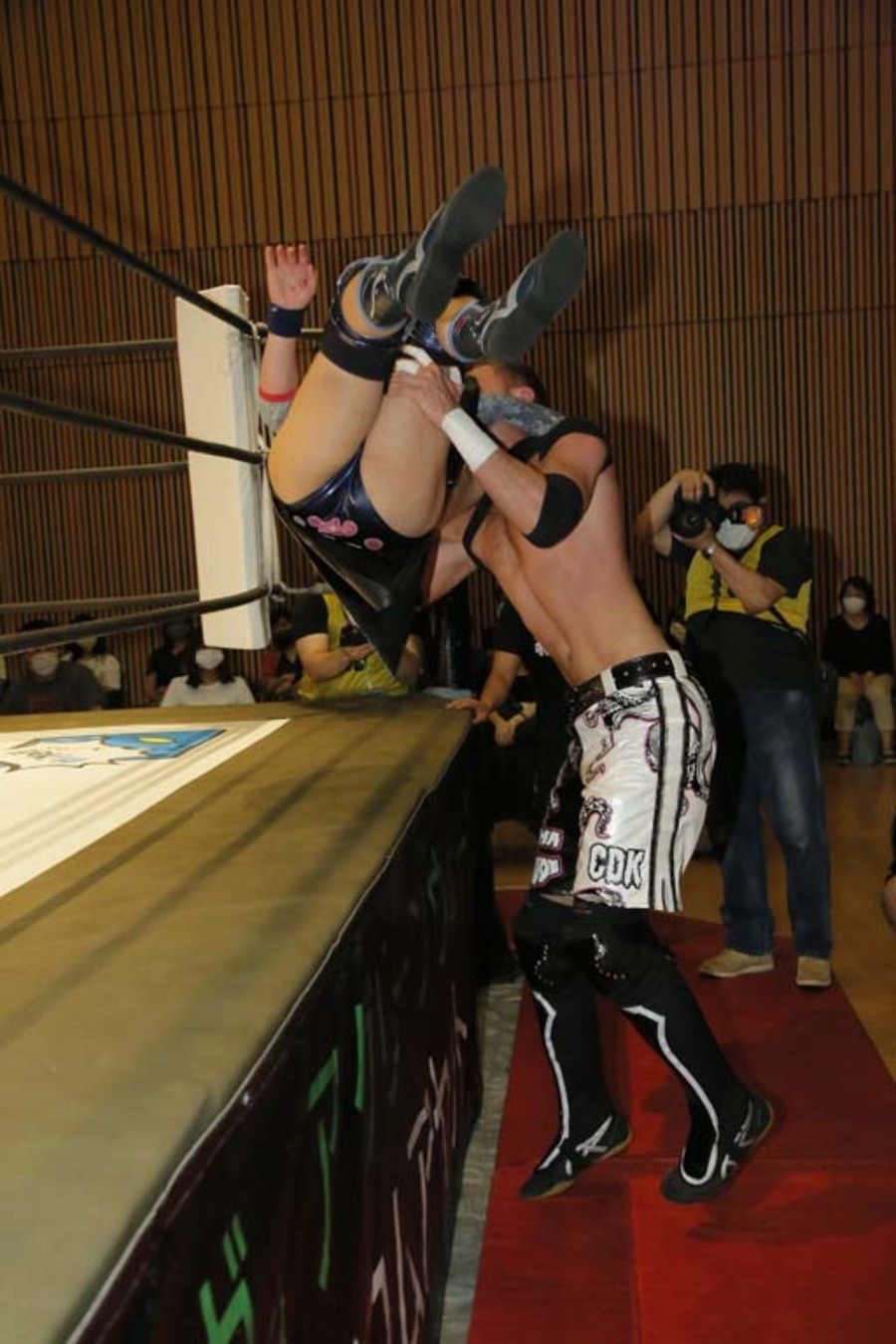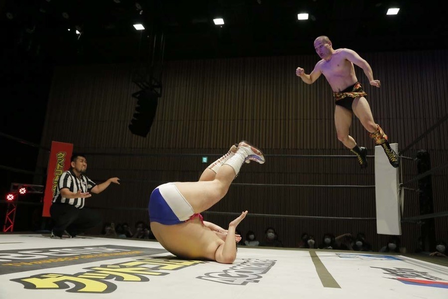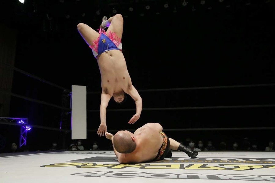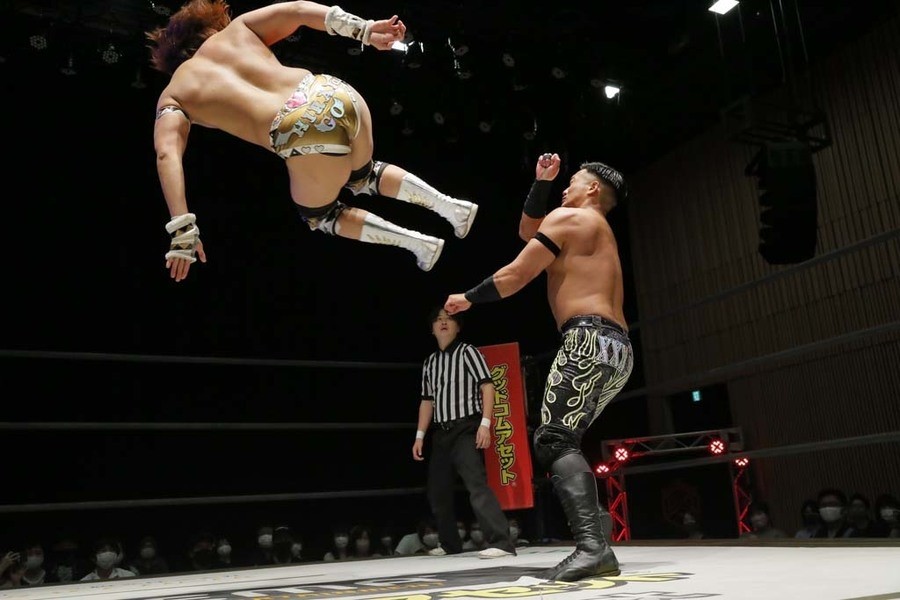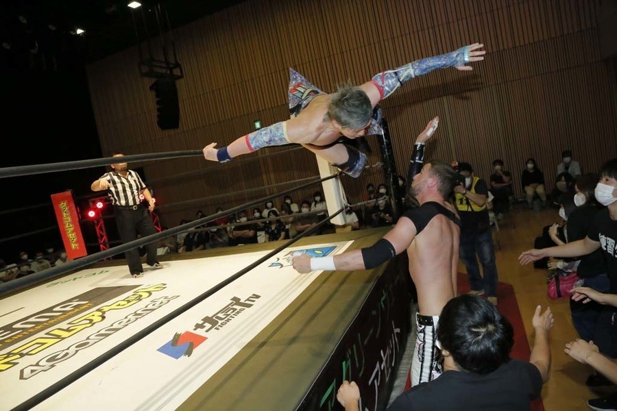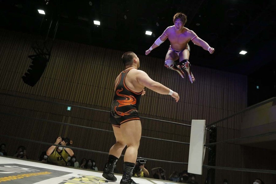 島谷が開始前に握手を求めると、上野も応える。島谷はクリーンに離れて開始のゴング。バックの取り合いからロープを走ってのスピーディな攻防、ドロップキックも交錯。会場から拍手が巻き起こる。しかし突如島谷がサミングから丸め込みもカウント2。しかし上野がドロップキックで場外に落とすと、上野がプランチャを放つも島谷は看板で迎撃。島谷が「このグリーンボーイが!」と場外で蹂躙しリング内に戻す。島谷はサミング。奇声を上げながら島谷が反則を交えながら優勢の状態が続く。島谷はランニング・エルボー、バックドロップで追い込む。変形のキャメルクラッチは上野が何とかロープへ。島谷のブレーンバスター狙いは上野がぶっこ抜いてブレーンバスターで投げていく。上野のおっぴろげアタックは島谷が回避。コーナーで宙づりにしてドロップキック。島谷の飛び付きスイングDDTは途中で止めた上野がブレーンバスターで投げる。背面へのおっぴろげアタックから上野がコーナーへ。島谷も追いかけコーナー上での攻防になると、上野がサドンインパクトでコーナーに叩き付けると、ミサイルキック。カウント2。島谷がサミングをすれば、上野はエルボー。ここで両者エルボー合戦。島谷が飛び付いてのスイングDDTからフィッシャーマンバスターは上野がカウント2で返す。逆打ちを狙うも、上野は耐える。上野がドロップキックからブリザード・スープレックス・ホールド、カウント2。ならばと上野はBME。これが決まると島谷も返せず3カウント。