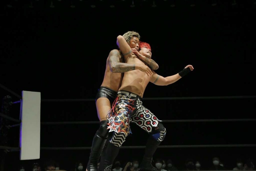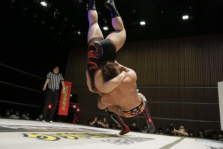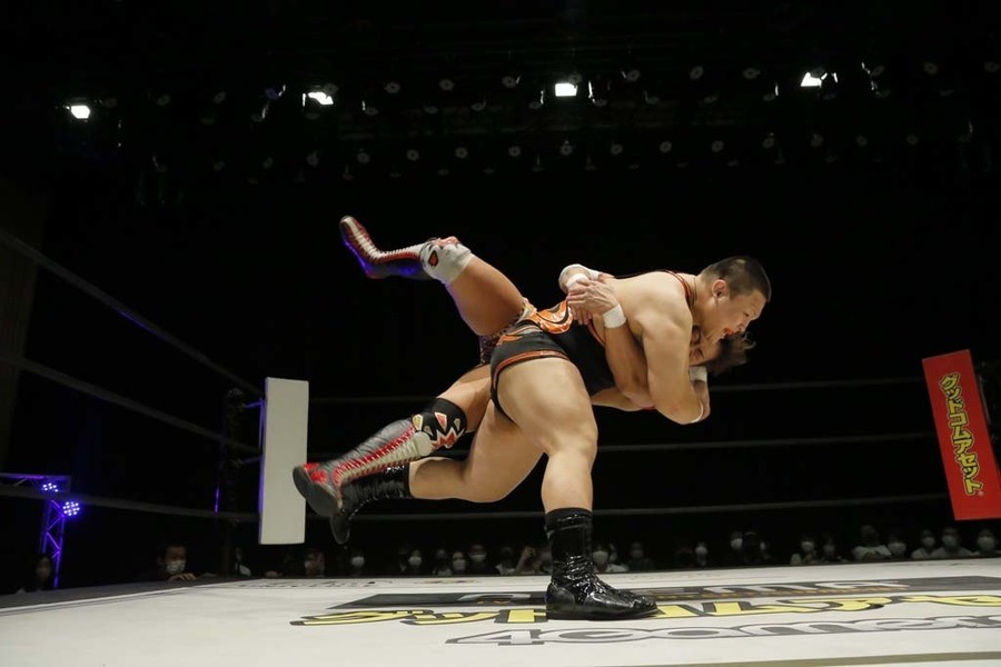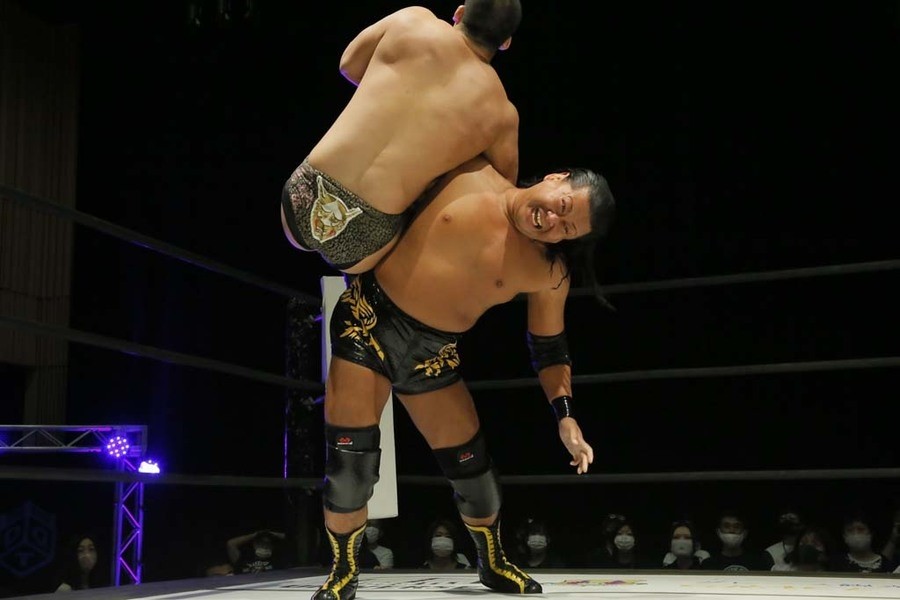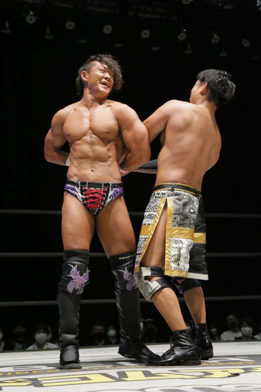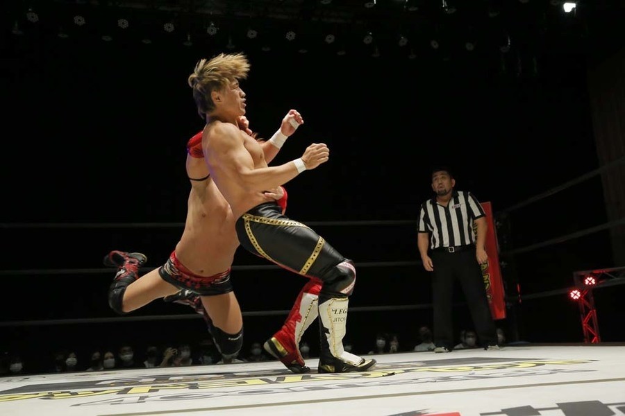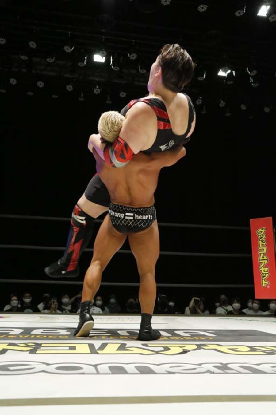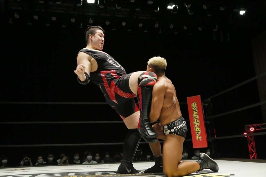 竹下 たぶん僕は今日一発一発……吉村も僕を敵対視してるけど、もっと火をつけたいという気持ちがあったんですよ。だからホンマにラリアットでもエルボーでも一発一発魂込めて打ったし、ザーヒーもバコーンと顔面にいったったから。その上で、もしかしたらヒザとかでカバージョいってたら、勝てたかもしれへん。でもジャーマンは僕の意地ですかね。いまの僕がいかに調子がいいかというのを見せつける。ぎっくり腰にもならないと思いますんで。メチャクチャ鍛えてるから。去年と比較するなら去年の3倍は鍛えてる、いま。自信あります。