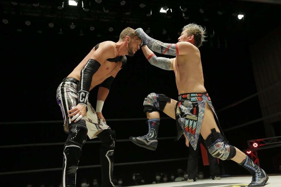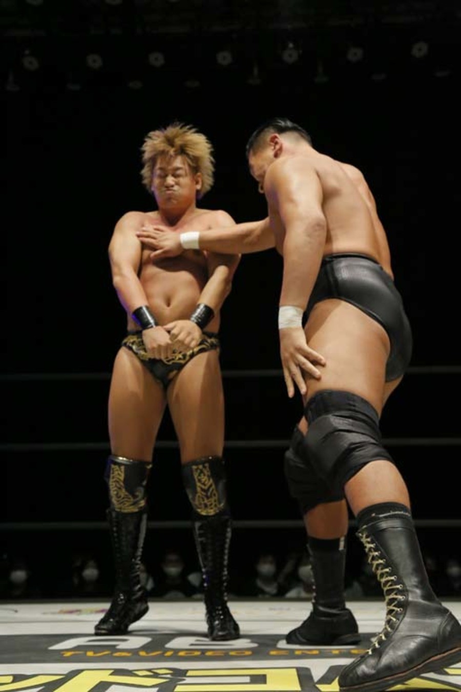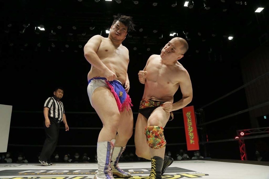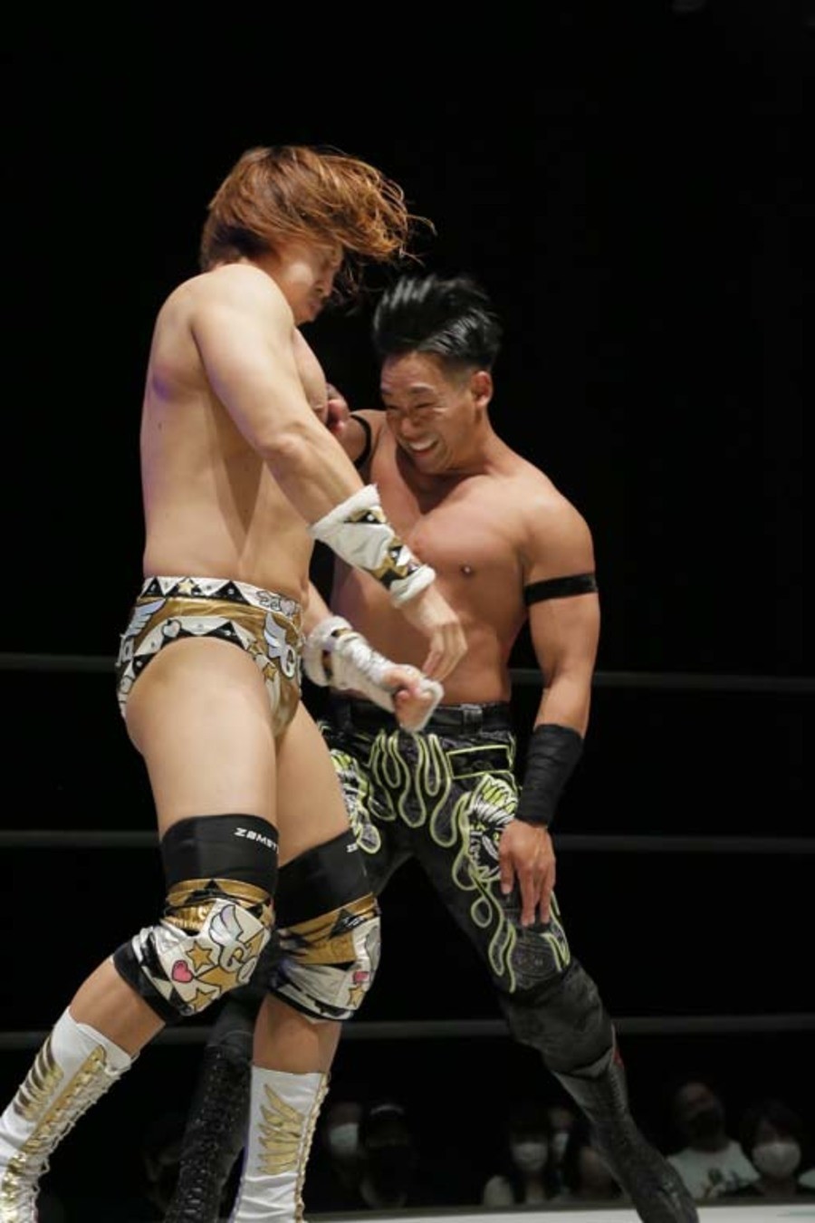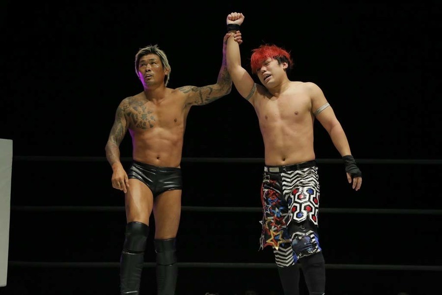 上野 僕を踏み台に3分? 何か男色さんらしいというか、そこは3秒じゃないのかとふと思ったんですけど(苦笑)。でも3分を目指してもらって、僕も最大限苦手な男色ディーノに対して作戦を1日で練って、何とか明日を迎えて、勝ってトーナメントの決勝・優勝を目指したいと思います。