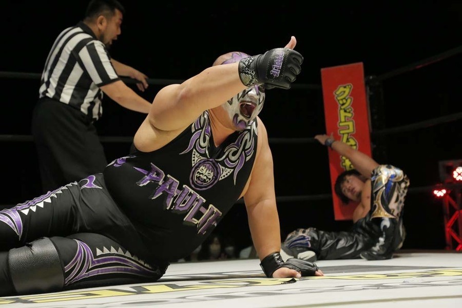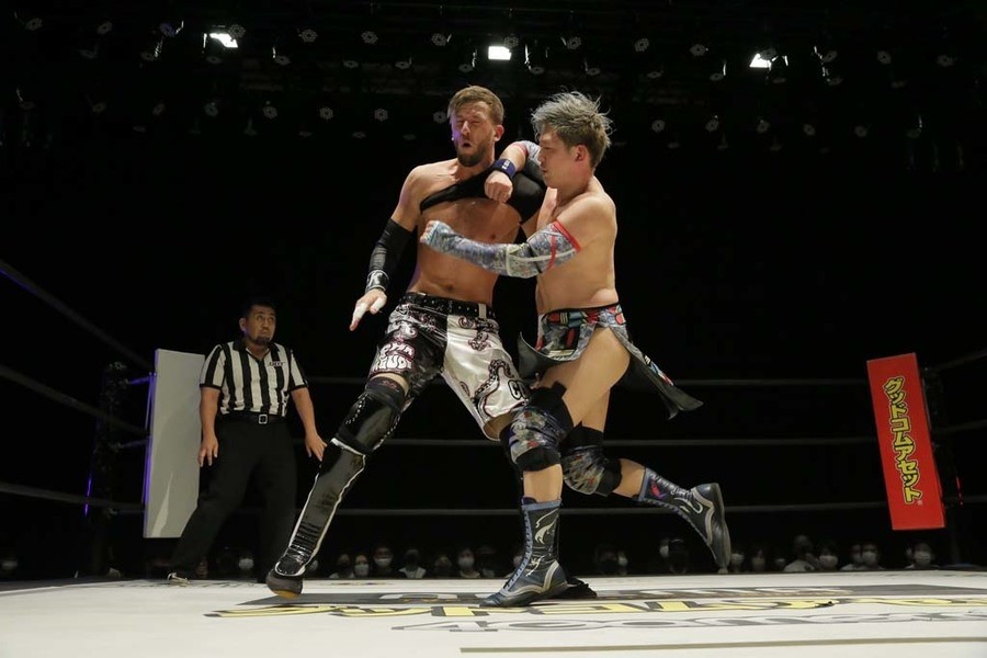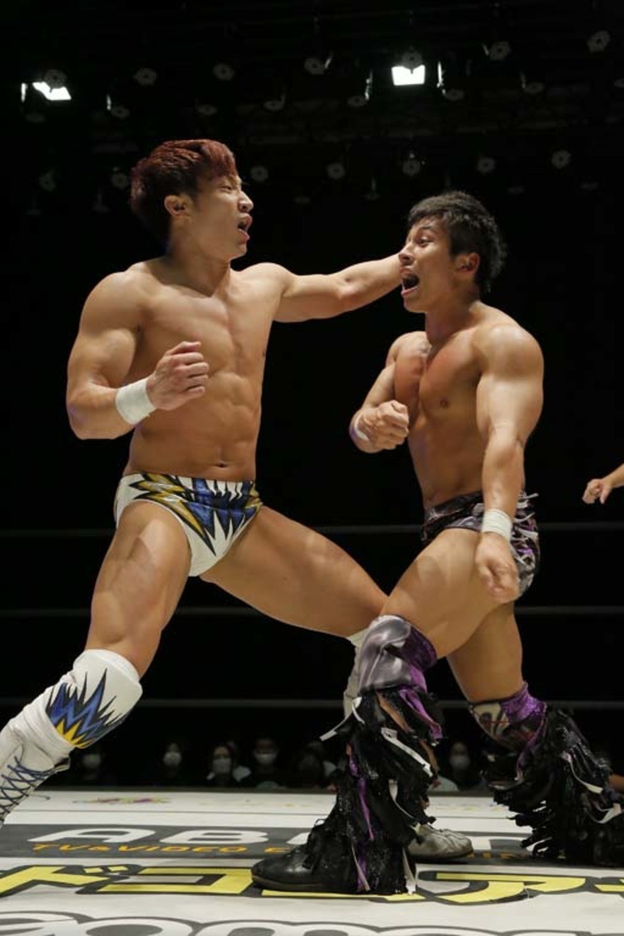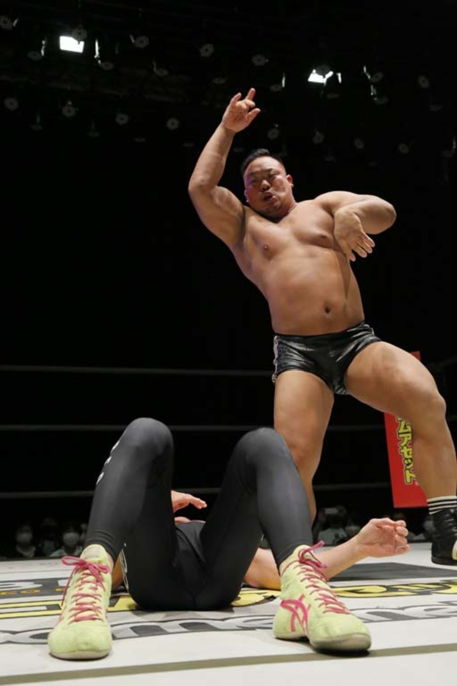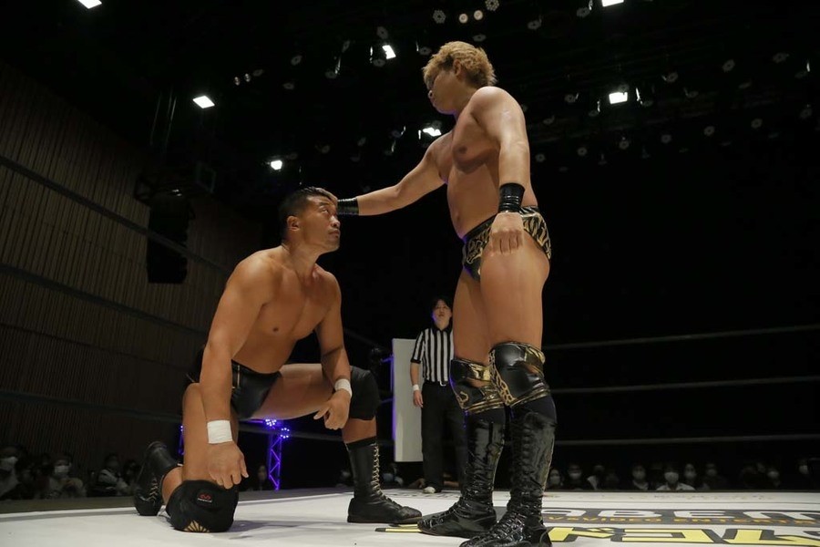 上野 僕を踏み台に3分? 何か男色さんらしいというか、そこは3秒じゃないのかとふと思ったんですけど(苦笑)。でも3分を目指してもらって、僕も最大限苦手な男色ディーノに対して作戦を1日で練って、何とか明日を迎えて、勝ってトーナメントの決勝・優勝を目指したいと思います。