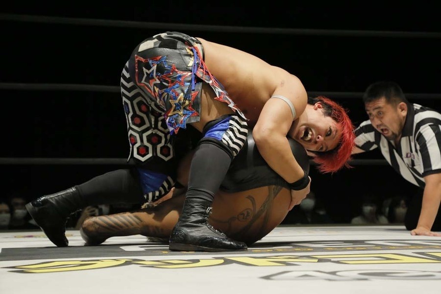 飯野は入場するなりいきなりスピアで奇襲。ゴングと同時にカウント2。続けてエルボードロップ。さらにショートバージョンのハカからエルボードロップ。カウント2。追撃を狙おうとした飯野の腕を捕らえると一気に青木ワキ固めで極めると飯野はギブアップ。青木が秒殺勝利した。