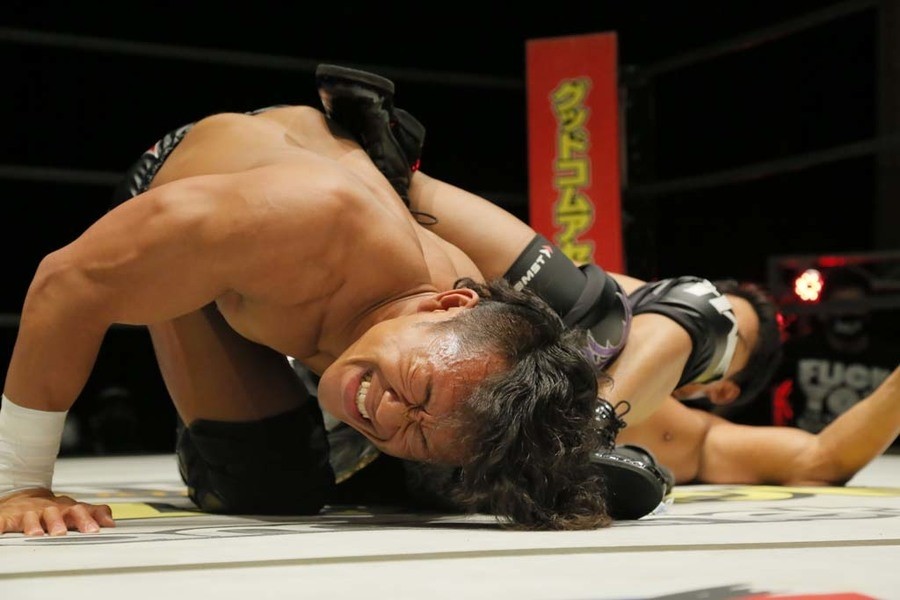 飯野 イッテー! クソ! 最初に畳みかけたのに……クソ、やられた! さすがだ。あー、悔しい。これで終わりじゃないから! でも負けたことは今日、反省して明日また敗者復活戦があるので、それ頑張っていきます! でも青木真也、強烈です。まぁ自分が油断していた部分もあったのかもしてない。悔しいです!