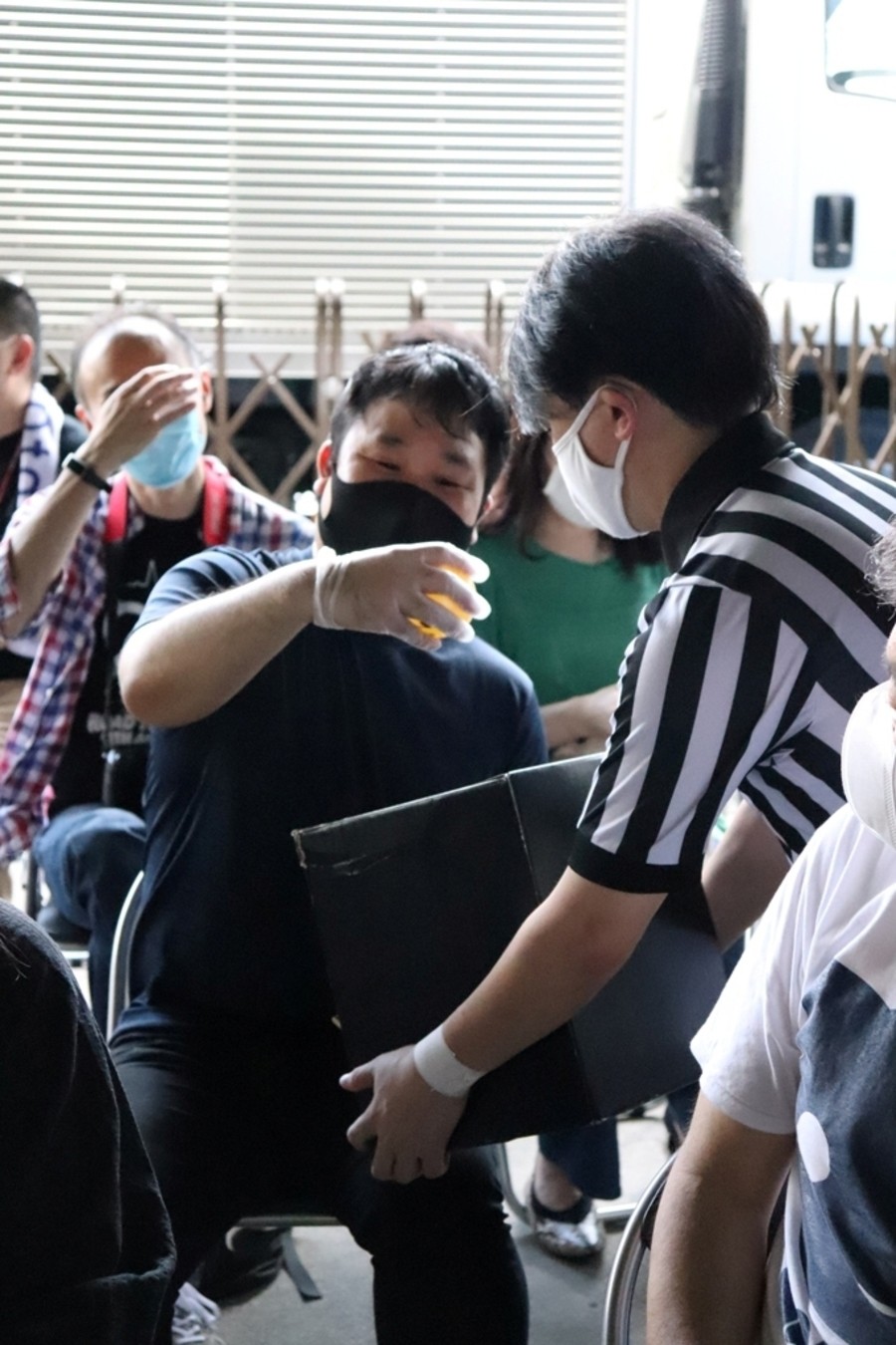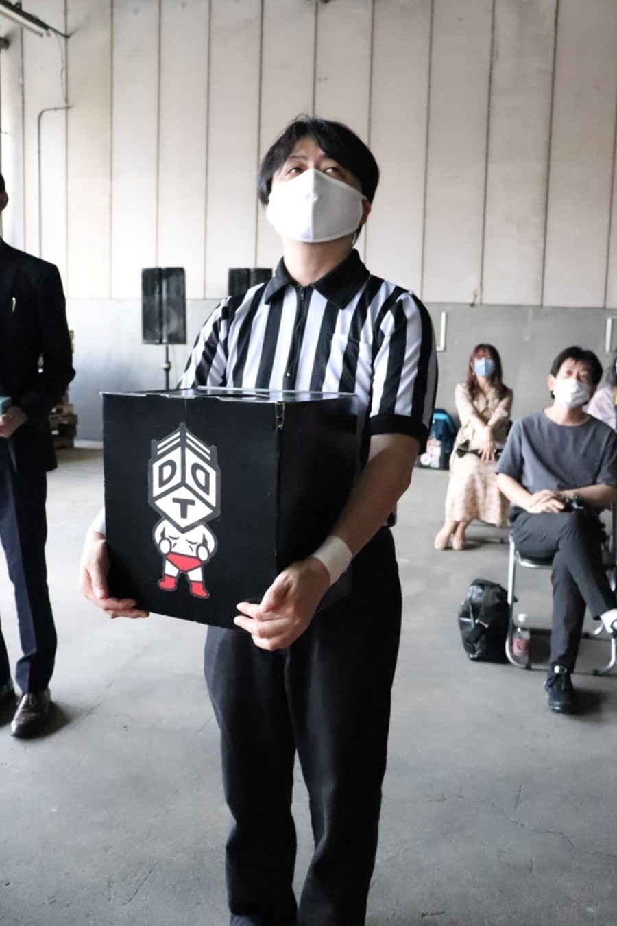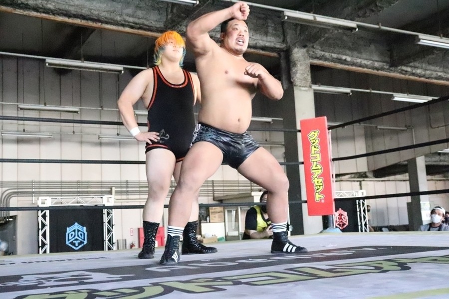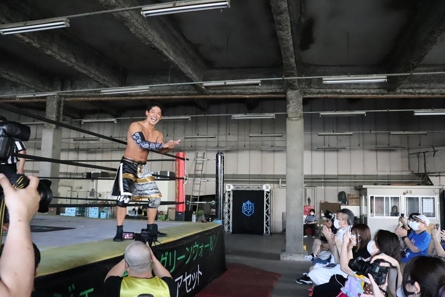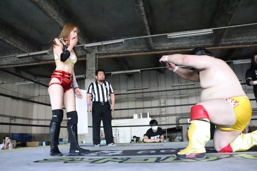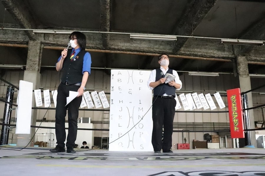 今林久弥APと井上マイクリングアナウンサーがリングに登場。観戦にあたっての諸注意と今後の大会スケジュールをアナウンス。そしてお客様抽選により全対戦カードが決定した。メインに選ばれた納谷&渡瀬がリングに登場。メインということで緊張しドギマギする2人。何と叫んでいいのかテンパる納谷の「絶対に勝つぞー! 鶴見大会スタート!」の掛け声で大会スタートした。
