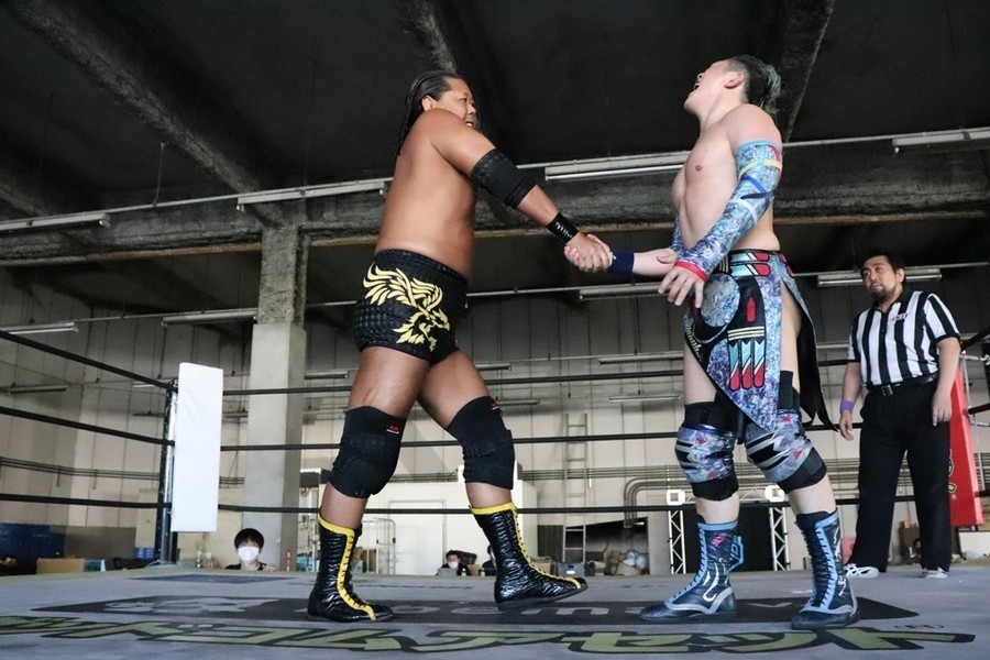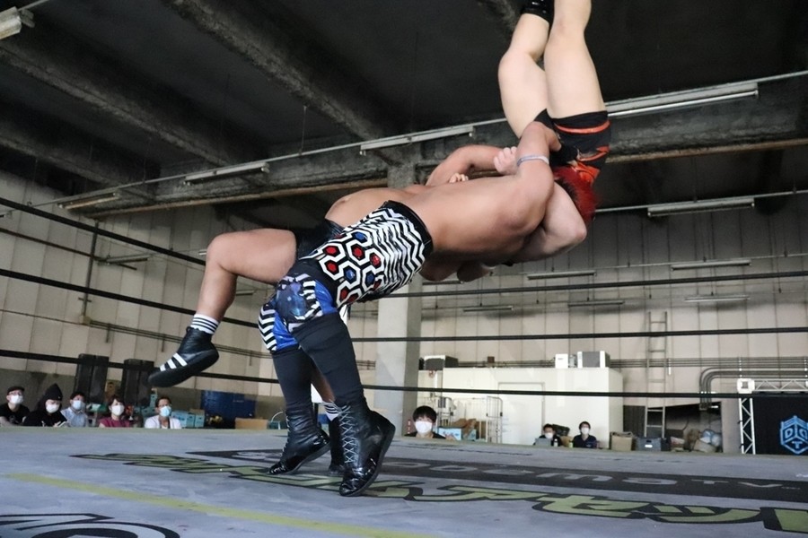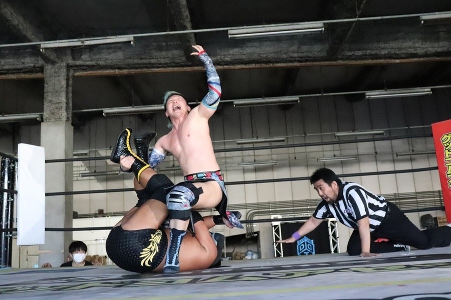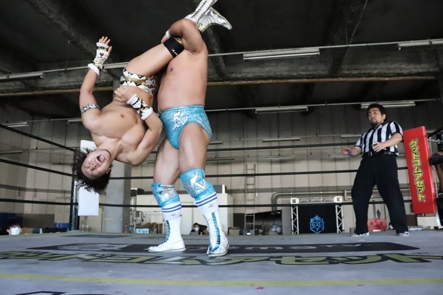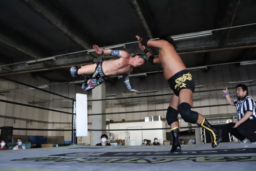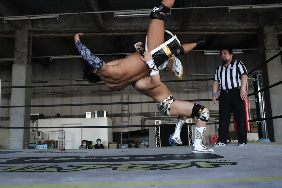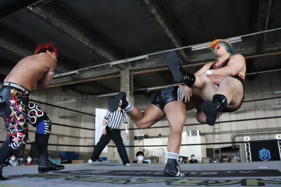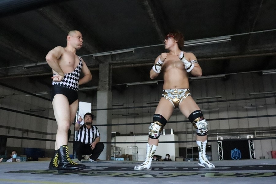 ゴングが鳴るとグラウンドで互いの出方を伺う両者。大石の素早いグラウンドに大鷲も対応。大石が握手を求めると、大鷲が握力で圧倒。ロープを走っての攻防になると、大石がタックルで向かって行くが大鷲は微動だにしない。大石が大鷲をロープの走らせると、巧みに大石がタックルで倒していく。大鷲は「大石と大鷲紛らわしいんだよ! 二度と青果市場から出られないようにしてやる!」と言い放ち、セコンドの平田を呼び込み、ルチャで2人同時に投げ飛ばしていく。ここから大石が果敢に向かって行くが、大鷲の猛攻に防戦一方の展開が続く。大石がランニング・フォアアームで一矢報いると、ボディスラムで大鷲を投げ切る。大石はコーナーからスイングDDTを決めてデルフィンクラッチを決めるもカウント2。大石がミラクルエクスタシーを狙うが、大鷲はのど輪落としからボディプレス。カウント2。続けて大鷲は延髄斬りからブレーンバスターも大石はカウント2で返す。大鷲がコーナーに上るが大石が阻止。デッドリードライブでマットに叩き付けると、ダイビング・クロスボディを放つが自爆。そこに大鷲がラ・マヒストラルを決めるがカウント2。大石が逆さ抑え込み狙いも、大鷲は脱出。大鷲のラ・マヒストラルを大石はラ・マヒストラルで返すが、これを大鷲がさらにラ・マヒストラルで切り返しガッチリ押さえ込むと大石も返せず3カウント。
