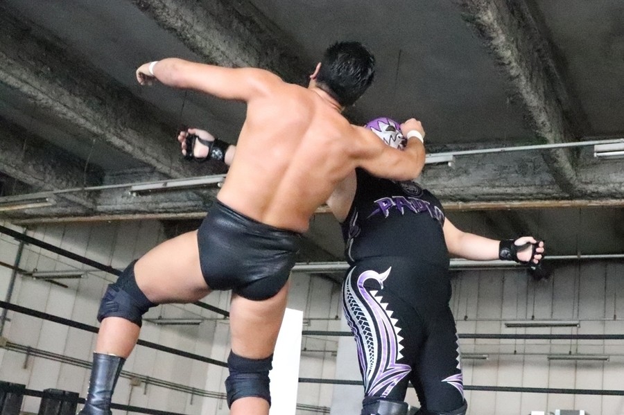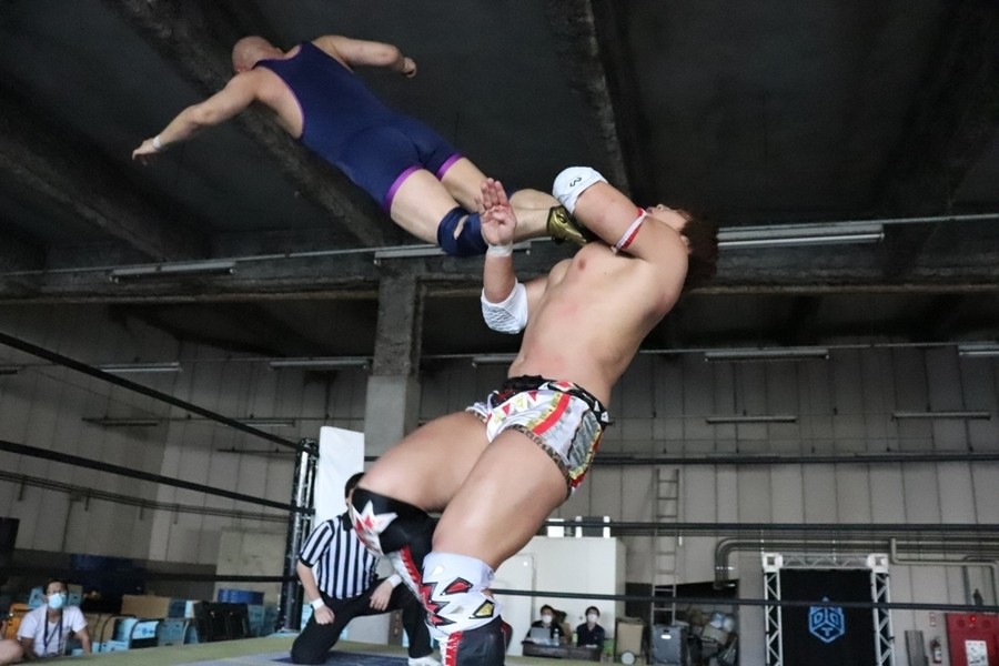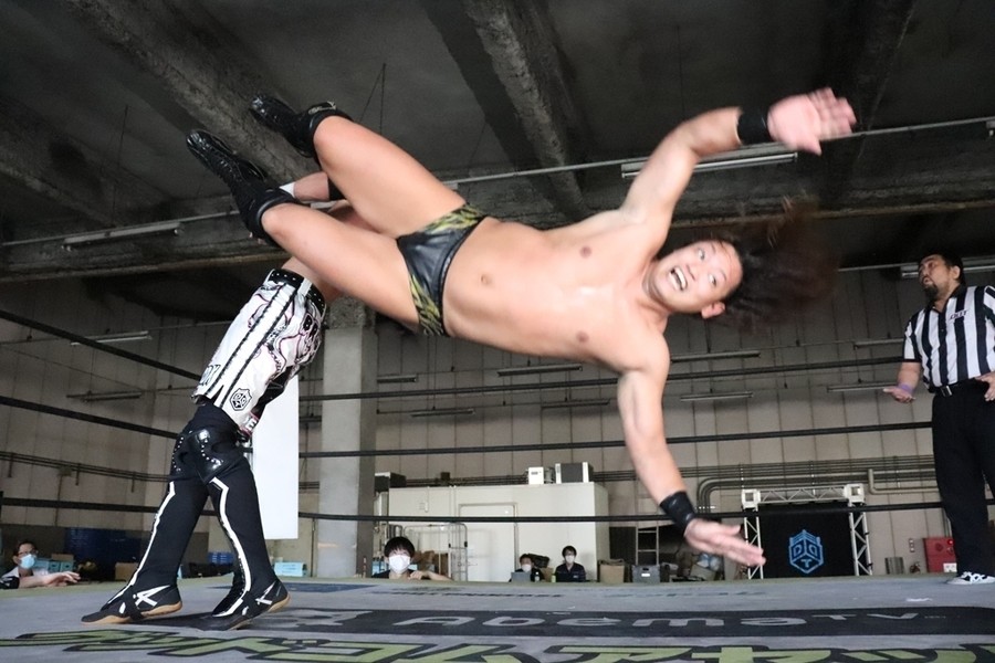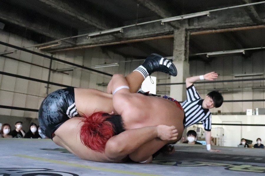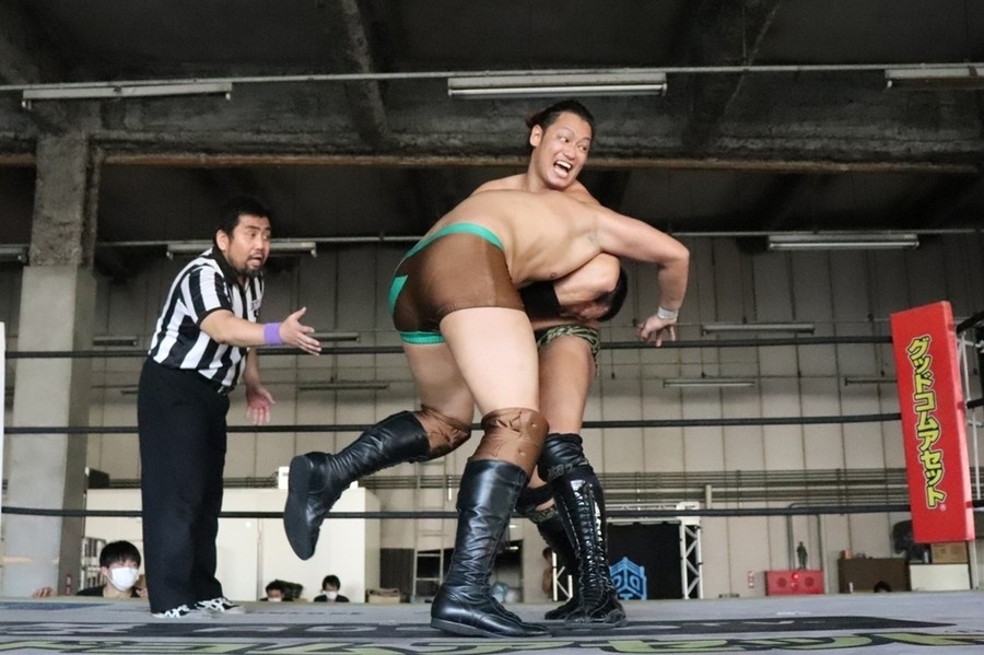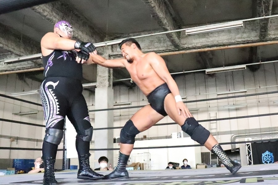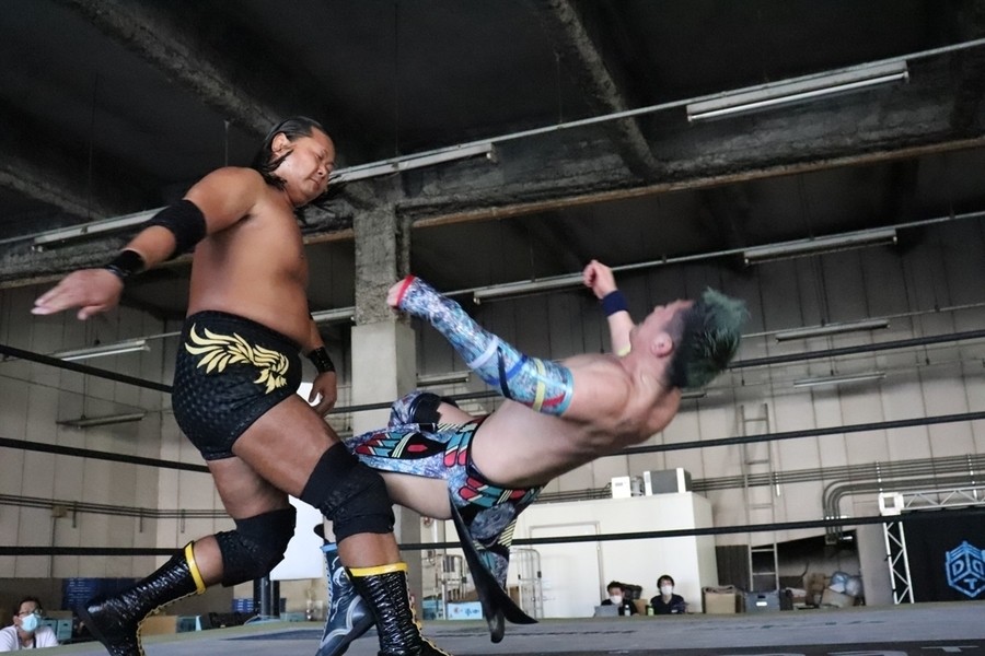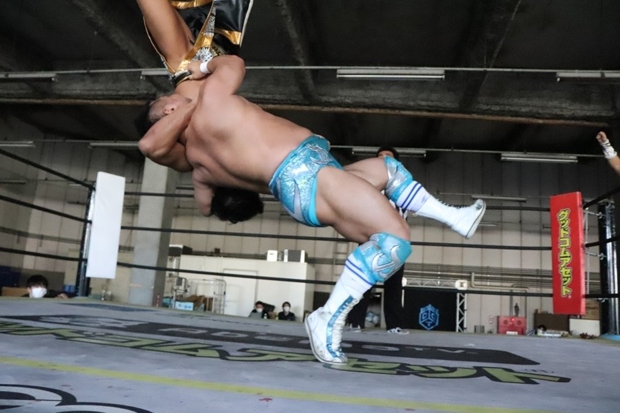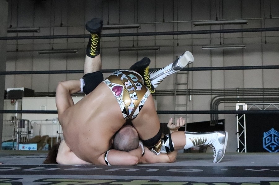 ゴングが鳴るとグラウンドで互いの出方を伺う両者。大石の素早いグラウンドに大鷲も対応。大石が握手を求めると、大鷲が握力で圧倒。ロープを走っての攻防になると、大石がタックルで向かって行くが大鷲は微動だにしない。大石が大鷲をロープの走らせると、巧みに大石がタックルで倒していく。大鷲は「大石と大鷲紛らわしいんだよ! 二度と青果市場から出られないようにしてやる!」と言い放ち、セコンドの平田を呼び込み、ルチャで2人同時に投げ飛ばしていく。ここから大石が果敢に向かって行くが、大鷲の猛攻に防戦一方の展開が続く。大石がランニング・フォアアームで一矢報いると、ボディスラムで大鷲を投げ切る。大石はコーナーからスイングDDTを決めてデルフィンクラッチを決めるもカウント2。大石がミラクルエクスタシーを狙うが、大鷲はのど輪落としからボディプレス。カウント2。続けて大鷲は延髄斬りからブレーンバスターも大石はカウント2で返す。大鷲がコーナーに上るが大石が阻止。デッドリードライブでマットに叩き付けると、ダイビング・クロスボディを放つが自爆。そこに大鷲がラ・マヒストラルを決めるがカウント2。大石が逆さ抑え込み狙いも、大鷲は脱出。大鷲のラ・マヒストラルを大石はラ・マヒストラルで返すが、これを大鷲がさらにラ・マヒストラルで切り返しガッチリ押さえ込むと大石も返せず3カウント。