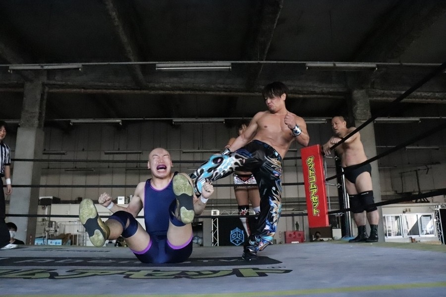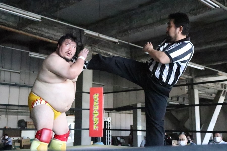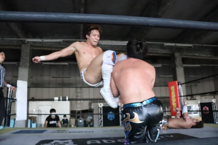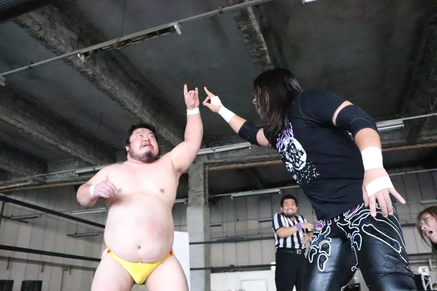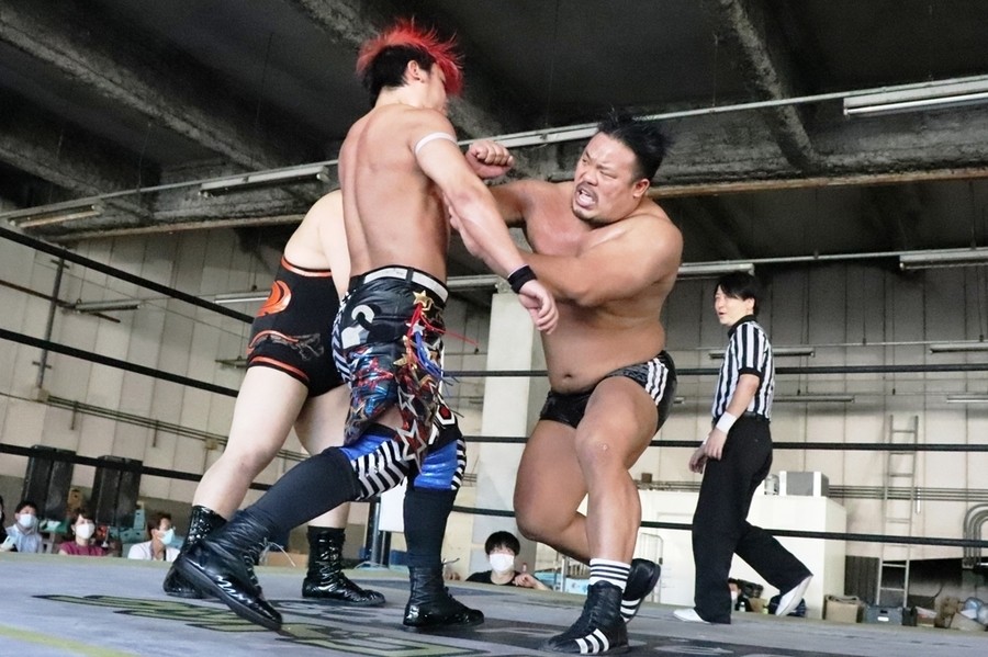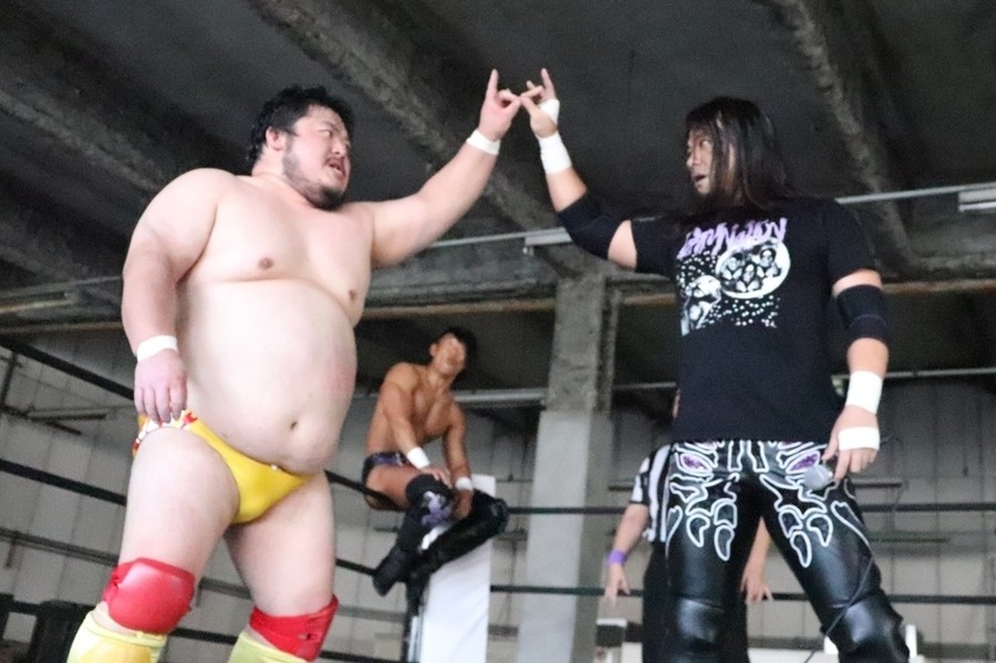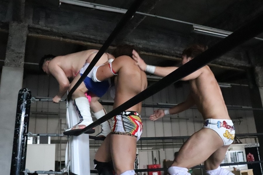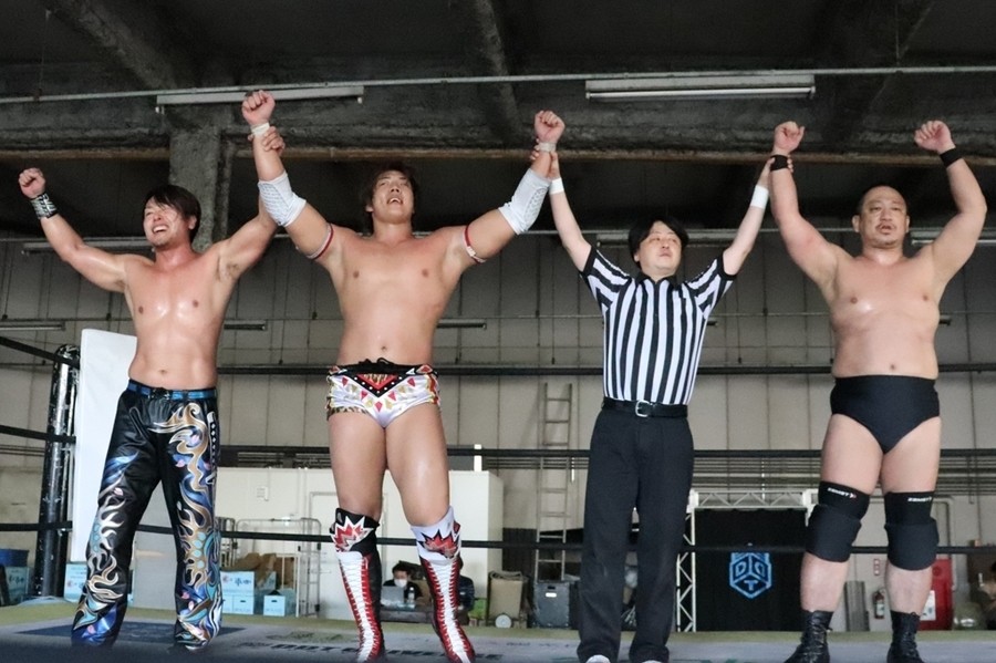 ゴングが鳴ると3人は手四つの攻防になるが、勝俣一人圧倒される。勝俣は体格差がおかしいとこの試合に抽選で選んだお客さんにいちゃもんをつけていく。勝俣は飯野に対し「ALL OUTだ」「タッグチャンピオンの吉村を倒せばタッグに挑戦できるかもしれない」と懐柔。2人で吉村に猛攻をしかける。飯野がカバーすると勝俣がカット。勝俣は木曽レフェリーのせいだと言って再び吉村に2人がかりで攻撃を加えるが、勝俣のカバーは飯野がカット。飯野のラリアットが勝俣に当たり、吉村がタックルで飯野を吹き飛ばす。ここから吉村が勝俣に一気に攻撃をしかけると、勝俣は防戦一方の展開に。吉村がブレーンバスターを決めてカバーも飯野がカット。吉村を場外に追放すると、飯野が勝俣に猛攻をしかける。飯野がハカエルボーを狙うがハカの最中に吉村が勝俣を場外に落とす。吉村が飯野の背後に回り、飯野がハカを終えるとチョップ一閃。飯野に串刺しラリアット。ここで飯野と吉村が強烈なチョップの打ち合い。飯野がボディアタックからパワースラム、エルボードロップを落とすもカウント2。飯野が吉村を羽交い絞めにすると、勝俣がミサイルキックで飛び込むも、これは飯野を直撃。ここで3人が入り乱れ、トリプルダウン状態に。3人で打ち合いになるが、勝俣が飯野と吉村からチョップとハンマーパンチを浴びてしまう。勝俣の延髄斬りが吉村に、飯野が吉村にチョップ。勝俣と飯野がダブルのブレーンバスター、2人でカバーも吉村は返す。勝俣が飯野ロケットを狙うが、吉村が一度は返すも、勝俣が改めて飯野を吉村に直撃させる。喜ぶ飯野を勝俣が丸め込み3カウント。試合後飯野は勝俣に怒りをあらわにした。