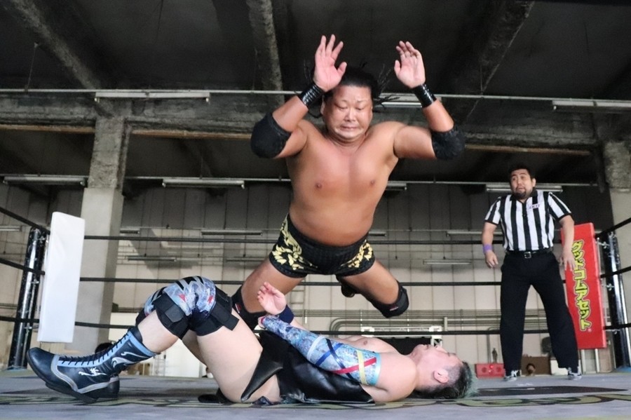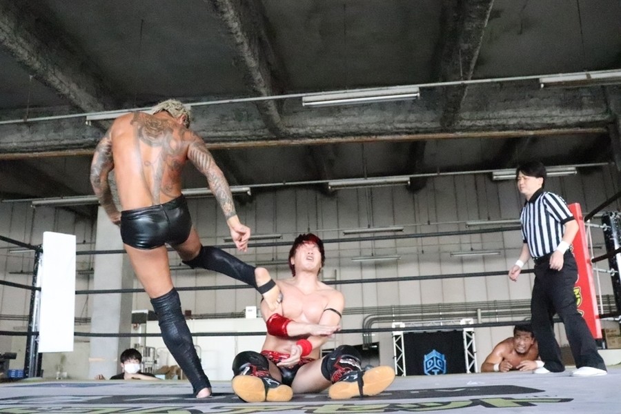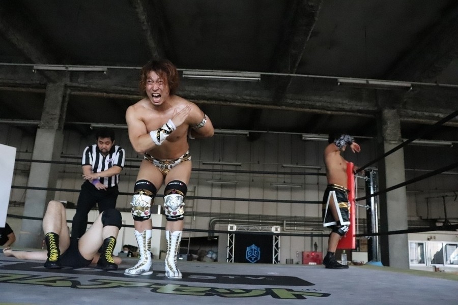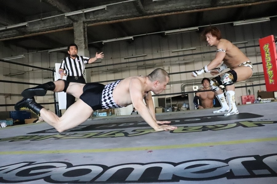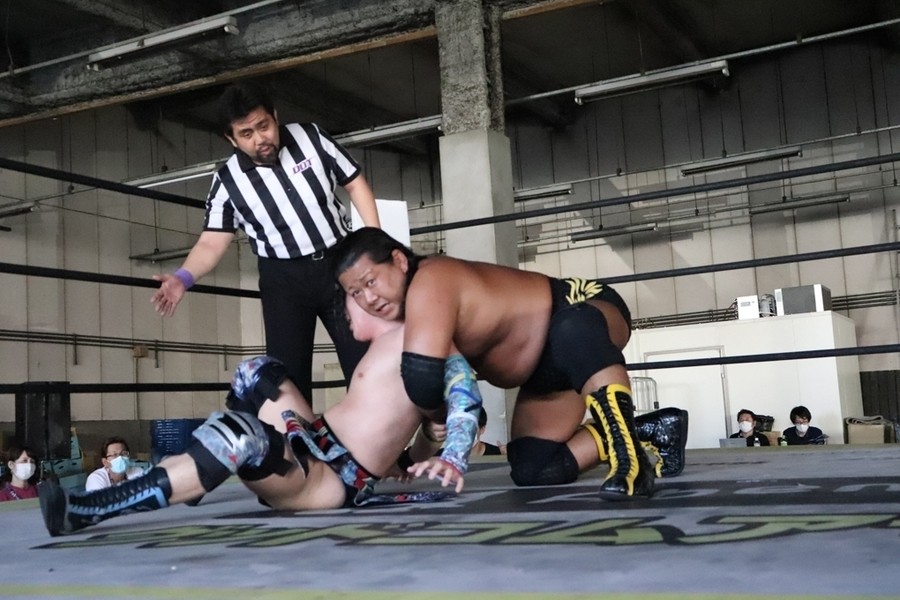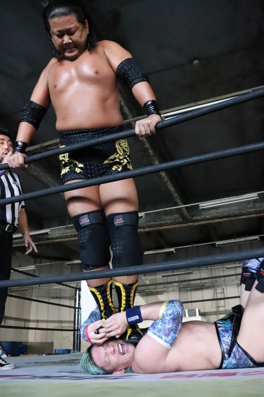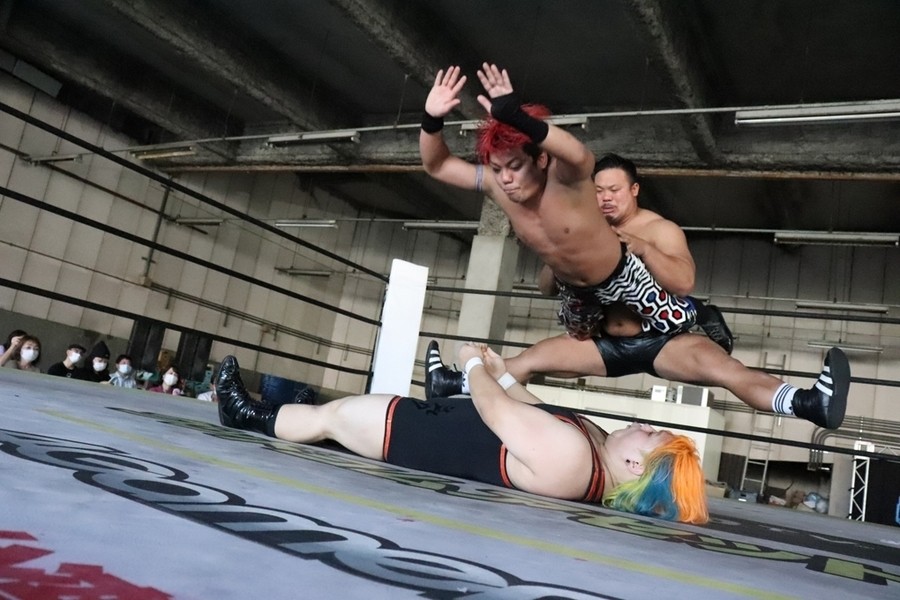 ゴングが鳴ると3人は手四つの攻防になるが、勝俣一人圧倒される。勝俣は体格差がおかしいとこの試合に抽選で選んだお客さんにいちゃもんをつけていく。勝俣は飯野に対し「ALL OUTだ」「タッグチャンピオンの吉村を倒せばタッグに挑戦できるかもしれない」と懐柔。2人で吉村に猛攻をしかける。飯野がカバーすると勝俣がカット。勝俣は木曽レフェリーのせいだと言って再び吉村に2人がかりで攻撃を加えるが、勝俣のカバーは飯野がカット。飯野のラリアットが勝俣に当たり、吉村がタックルで飯野を吹き飛ばす。ここから吉村が勝俣に一気に攻撃をしかけると、勝俣は防戦一方の展開に。吉村がブレーンバスターを決めてカバーも飯野がカット。吉村を場外に追放すると、飯野が勝俣に猛攻をしかける。飯野がハカエルボーを狙うがハカの最中に吉村が勝俣を場外に落とす。吉村が飯野の背後に回り、飯野がハカを終えるとチョップ一閃。飯野に串刺しラリアット。ここで飯野と吉村が強烈なチョップの打ち合い。飯野がボディアタックからパワースラム、エルボードロップを落とすもカウント2。飯野が吉村を羽交い絞めにすると、勝俣がミサイルキックで飛び込むも、これは飯野を直撃。ここで3人が入り乱れ、トリプルダウン状態に。3人で打ち合いになるが、勝俣が飯野と吉村からチョップとハンマーパンチを浴びてしまう。勝俣の延髄斬りが吉村に、飯野が吉村にチョップ。勝俣と飯野がダブルのブレーンバスター、2人でカバーも吉村は返す。勝俣が飯野ロケットを狙うが、吉村が一度は返すも、勝俣が改めて飯野を吉村に直撃させる。喜ぶ飯野を勝俣が丸め込み3カウント。試合後飯野は勝俣に怒りをあらわにした。