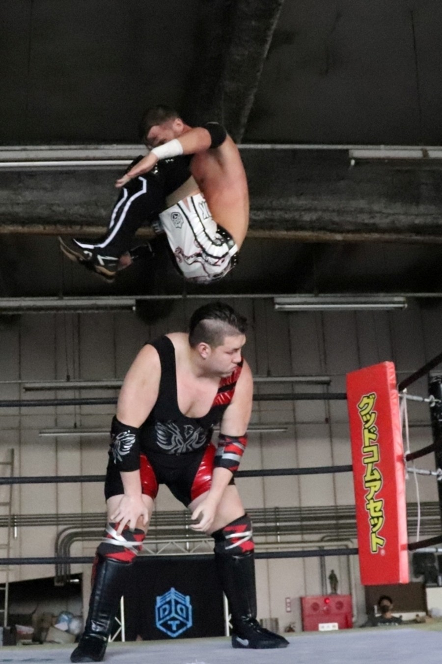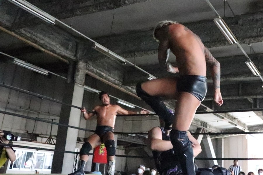 樋口と坂口が高尾を捕まえる展開。しかしポーリーが場外から坂口の足を引っ張り妨害すると逆にDAMNATIONが坂口を捕まえる展開となる。坂口が高尾にダッシュミドルを決めて逆転し樋口に繋ぐ。樋口がチョップとラリアット、オクラホマスタンピードで高尾を追い込む。カナディアン・バックブリーカーで捕らえるが高尾は脱出。コーナーから飛び付きDDTを決めてポーリーにタッチ。ポーリーと樋口がド迫力の打ち合い。ポーリーがブレーンバスターを狙うも、逆に樋口がブレーンバスターを決める。樋口がパワーボムの体勢もポーリーがリバース。再び打ち合いになるが、ポーリーのテーズプレスを樋口がキャッチ。コーナーに強烈な串刺しラリアット。リング中央で何度もラリアットの相打ち。両者ダウン。両チームタッチ。高尾が坂口にセカンドからダイビング・ダブルフットスタンプ。坂口は高尾にスリーパーも高尾は脱出し延髄斬り。高尾がリバースゴリーを狙うも坂口は着地しスリーパー。坂口が自ら外しPK。カウント2。坂口と高尾がエルボーの打ち合い。坂口が飛び付きの腕十字も高尾が丸め込み。ラ・マヒストラルもカウント2。坂口の神の右膝を避けた高尾が串刺しハイキック。ポーリーにタッチし高尾と連係攻撃。樋口がカットに入る。ポーリーが坂口にフィッシャーマン・バスター。カウント2。続いてポーリーはSTF。坂口はロープへ逃げる。ポーリーがリバーススプラッシュを放つも自爆。そこに樋口がダイビング・ボディプレスで援護。坂口がPKを決めるもカウント2。続けてロープに走って神の右膝を叩き込むとポーリーも返せず3カウント。