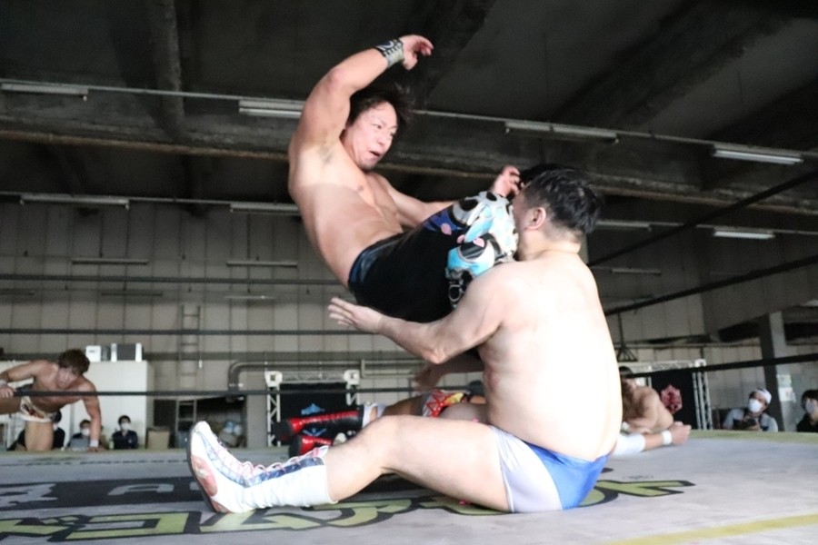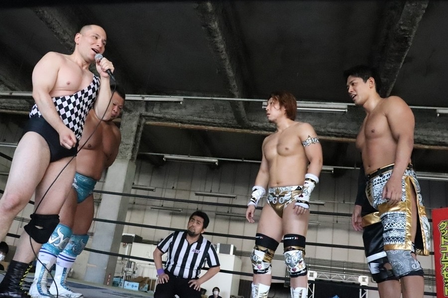 渡瀬と岡谷で試合開始のゴング。腕の取り合いからグラウンドの攻防になっても互いに譲らず。納谷とクリスが出てくると、納谷がパワーでクリスを圧倒。クリスが低空ドロップキックを決め岡谷にタッチするとトレイン攻撃。岡谷が納谷にボディスラムを狙うと、重くて上がらず。クリスがアシストし、納谷に岡谷を投げ付けていく。納谷が岡谷に強烈なボディスラムを決めると、渡瀬が岡谷を場外に連れ出しコンクリート上にブレーンバスターで叩き付けリング内に戻す。ここから岡谷が防戦一方の捕まる展開になってしまう。岡谷がなんとか納谷にランニング・エルボーを連発し、納谷を倒しクリスにタッチ。クリスは納谷にコーナーでチョップ連発し、コーナーの渡瀬にはビッグブーツ。納谷の背中にダイビング・セントーンを落としていく。納谷にプレイングマンティスボムを狙うが、納谷がリバース。納谷が串刺しボディアタックからカバーもカウント2。納谷がチョークスラム狙いもクリスは脱出。チョップの打ち合いから納谷がニーリフト、クリスもビッグブーツ。納谷がバックドロップを決めると、それぞれパートナーにタッチ。渡瀬が串刺しエルボー、岡谷も串刺しエルボーからランニング・ブルドッグ。カウント2。岡谷がノーザンライトを狙うが、渡瀬は耐えてフロントネック。岡谷はロープに逃げる。渡瀬と納谷がトレイン攻撃。渡瀬がコーナーから岡谷にセグウェイからカバーもクリスがダイビング・フットスタンプでカット。渡瀬が強烈なエルボーからカバーも岡谷はロープに手を伸ばす。渡瀬のバックドロップ狙いを岡谷が丸め込むがカウント2。渡瀬がロープに走ると、エプロンからクリスがカッターで飛び込み、岡谷がランニング・エルボーの連係。カウント2。岡谷からクリスにタッチ。クリスが渡瀬にプレイングマンティスボム狙いも渡瀬がサムソンクラッチで丸め込むもカウント2。渡瀬が延髄斬りからコーナーに上るも、クリスが追いかけ雪崩式ダブルアーム。カウント2。岡谷が納谷にランニング・ネックブリーカー。ここから両チームが入り乱れ4人がダウン。クリスと渡瀬にダブルダウンカウントがとられる。両者膝立ちでエルボーを打ち合い、立ち上がってのエルボーの打ち合い。クリスがカウンターのニー。続けて助走をつけてのランニング・ニーで渡瀬がダウン。ロープに走ったクリスに渡瀬がカウンターのドロップキック。渡瀬がバックドロップで投げようとすると、クリスが丸め込むようにグラウンドのオクトパスストレッチへ。一気に絞り上げると渡瀬もギブアップ。