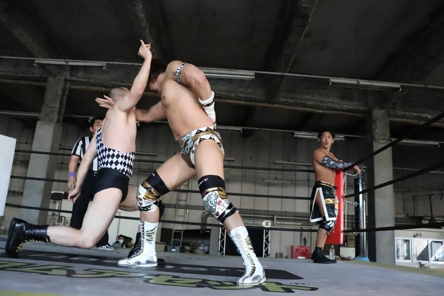 ディーノ組はスイカを食べながら入場。一方の高木組はそれぞれの曲に乗り個別入場。HARASHIMAとディーノで試合開始のゴング。ディーノはいきなりリップロック狙いもHARASHIMAは防御。ディーノがバックを取ると、HARASHIMAも取り返す。ディーノが股間を掴みに行けば、HARASHIMAは蹴りを放つが、互いに攻撃をさばき合う。ディーノから上野に代わると、しっかりと握手からスピーディなグラウンドの攻防。HARASHIMAが押し込み竹下にタッチ。竹下が「高木イズムを受け継いでますから!」といって「オイッ! オイッ! オイッ!」と観客を煽っていく。タックルで上野を倒しボディスラムを決めると、高木にタッチ。高木はボディスラムから「オイッ! オイッ! オイッ!」と叫びHARASHIMAにタッチ。HARASHIMAも「オイッ! オイッ! オイッ!」と叫びボディスラム。再び高木が出てくると「オイッ! オイッ! オイッ!」からボディスラムを狙うも逆に上野にボディスラムで投げられてしまう。上野から代わった中村が高木に「僕にもルチャを教えてください!」というと会場はルチャコール。高木とルチャの攻防を見せるが、高木のフライング・クロスチョップは失敗。中村が逆にフライング・クロスチョップを決めていく。ここか中村が赤コーナーサイドに捕まる展開に。中村が竹下をロープに振ると、場外の上野が足を引っ張り、ディーノが場外で竹下を掘っていく。ここから一気に攻守が交代。青コーナーサイドが代わる代わる竹下を捕まえる展開となる。竹下は「俺も強くなったんだぞ!」と言ってディーノにケツを差し出すが、ディーノに掘られダウンしてしまう。ここでディーノが男色ナイトメア。救出に入ろうとしたHARASHIMAとコーナーの高木も蹴散らされてしまう。ディーノがTバックを下ろし、生ナイトメアを敢行するも、竹下が阻止。竹下がディーノの股間を掴むが、逆にディーノが股間で絞め上げる。竹下が掟破りの男色スープレックスでディーノを投げ捨てる。竹下からタッチを受けた高木がドラゴンリングインから、フライング・クロスチョップ。続けて放った619はディーノが避けて男色スクリュー。ディーノが上野に「俺ごと掘れ!」と指示するが上野は拒否。代わりに中村が掘るが、ディーノは首をかしげる。中村が「次は僕ごと掘ってください!」と高木のバックを取るが、ディーノが怒りの一撃。ディーノはたまたまDDTの体勢になっていた中村にチョップを叩き込んで結果DDTの状態に。ディーノがコーナーに上がると、高木が追いかけ雪崩式のぶっこ抜きブレーンバスター。それぞれHARASHIMAと上野にタッチ。上野がおっぴろげアタック。上野が雪崩式ブレーンバスター狙いもHARASHIMAはブロックしてコーナーからチェストー。改めて雪崩式ブレーンバスターを決めようとするが、上野は耐える。上野が「チェストー!」と言いながらミサイルキック。上野がブリザード狙いもHARASHIMAは脱出。エルボーの打ち合いになる。上野がランニング・エルボーでダウンを奪うが、HARASHIMAがミドルキックを連射。ミドルキックでダウンを奪う。HARASHIMAから竹下にタッチ。竹下がものすごい勢いの串刺しエルボーを放ち、フライング・ラリアット。コーナーの中村に行くと見せかけてフェイント。上野がドロップキックを決めると、竹下もドロップキック。竹下のブレーンバスター狙いを上野が投げ返す。中村にタッチ。気合の入った中村がリングに入り、引き起こすと竹下が強烈なエルボー。赤コーナーが飛び出し、中村にトレイン攻撃。高木が中村にスピコリドライバーからHARASHIMAはスワンダイブ式ボディプレス。竹下がその場飛びボディプレス。カウント2で青コーナーサイドがカット。エプロンの中村が竹下にフェイントからのスワンダイブ式ミサイルキック。ディーノと上野を呼び込み、コーナーのディーノの地獄門に竹下を送り、上野はすぐさまハーフネルソン・スープレックス。上野とディーノが中村を竹下に投げ付ける連係攻撃。カウント2。中村が竹下にファイト一発からディーノがリップロック。続けて男色ドライバーを決めると、すぐさまHARASHIMAがディーノに蒼魔刀。上野もHARASHIMAに蒼魔刀。高木が上野にラリアットから市っとダウンひまわりボムを狙うも、上野がウラカンラナで切り返す。中村がコスチュームのショルダーを下し、ミドルキック連発。竹下はエルボーを返す。中村の蹴り足をキャッチした竹下が中村を抱え上げるが、中村は高速のウラカンラナ。カウント2。中村がブラジリアンキックを決めロープに走ろうとするが、竹下がタイツを掴み、ブルーサンダーの入り方から途中で止めるや、顔面からマットに叩き付ける荒技。そのまま一気にカバージョ2020で絞め上げると中村もすぐさまタップ。強力トリオが勝利を飾った。