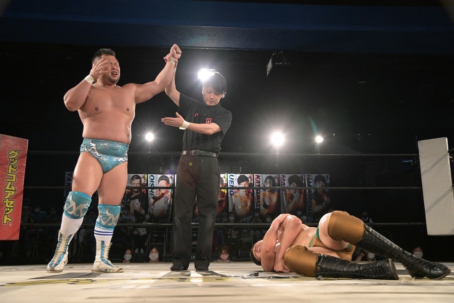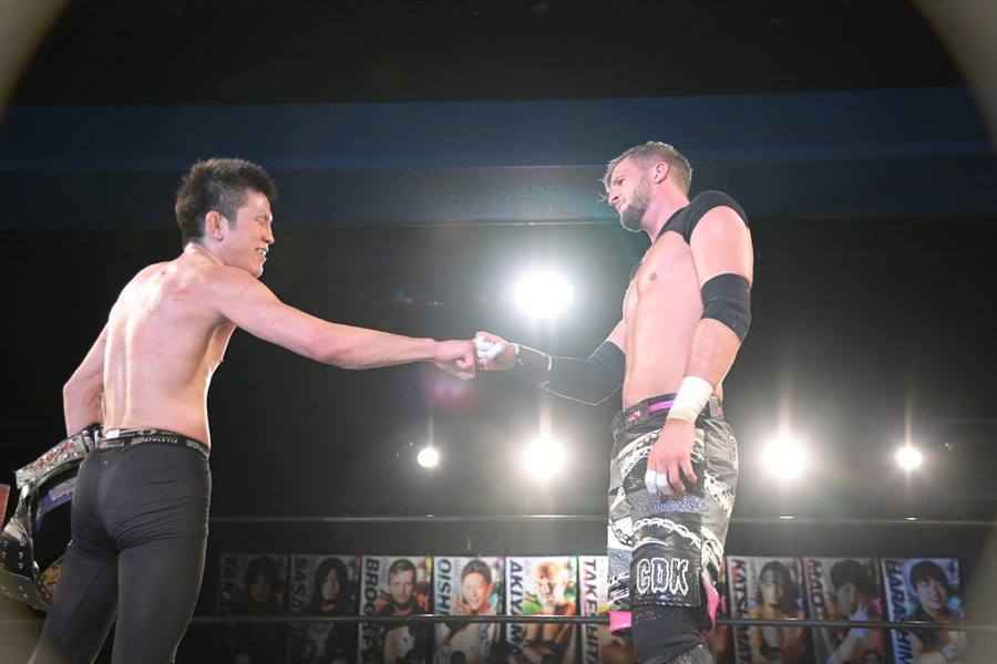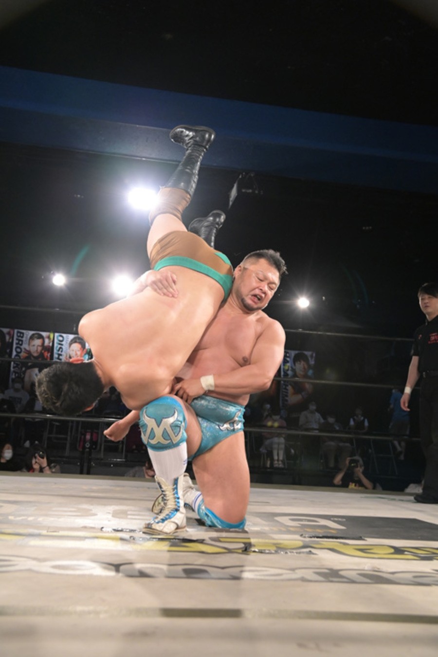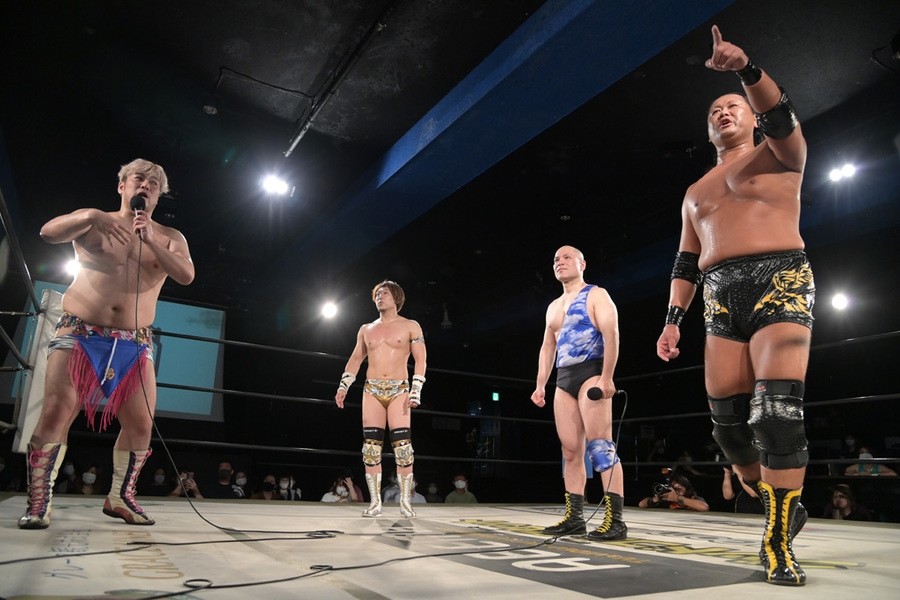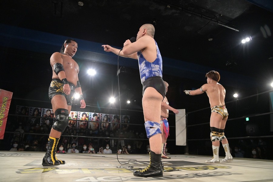 勝利した大石がマイクを持ち退場していく3人を呼び止める。大石は「勝俣瞬馬から勝ったぞ? おい、そこの熱波WER!!(勝俣「俺は勝俣だぞ」)てめぇは何のチャンピオンだ? おい、熱波WER!!(勝俣「勝俣だって言ってんだろ!」)この大石真翔がタッグチャンピオンに勝ったぞ。情けねぇな、オイッ! 俺と秋山さんがもう一回タッグのベルト、狙ってやりましょう! やってやりましょう! おい、タッグチャンピオン!(秋山「俺?」)うるせー! 今林なんか言ってみろ、タッグチャンピオンに大石&秋山が勝ったんだぞ!(秋山「岡田もいるぞ」)うるさい!」とKO-Dタッグに挑戦表明。今林GMがチャンピオンの意向を確認すると、竹下が「富士通の前、どこでもいいんで、そこで組んでください。いいか、秋山さん、富士通前に……(秋山「富士通前はダメだろ!」)負けて、富士通ではそのベルト獲って2連敗させたるからな!」と挑戦を受託。これを受けて今林GMが8月15日後楽園ホール大会での竹下&勝俣vs秋山&大石によるKO-Dタッグ戦を正式決定した。すると秋山は「(富士通の)6日前じゃねぇか……! わかったわかった、やってやるよ!」と力強く宣言。大石が「8月15日、あいつの熱波WER!!叩いて8月21日の富士通は秋山さんを二冠王にしてあげます。(秋山「絶対勝てよ?」)任せてください! 今日は新宿大会、ありがとうございました!」と大会を締めくくった。