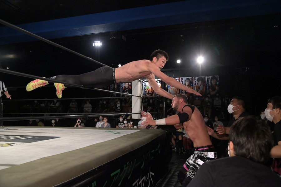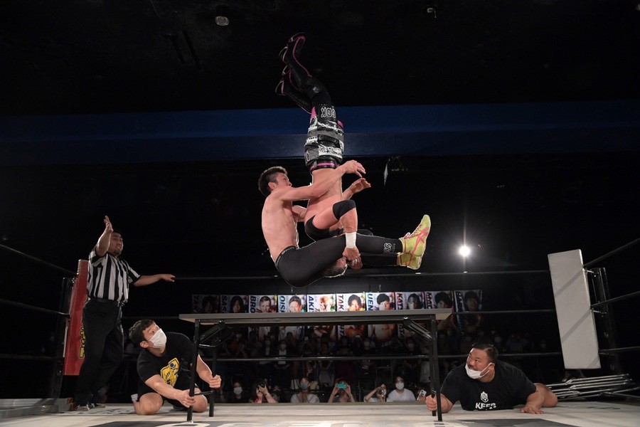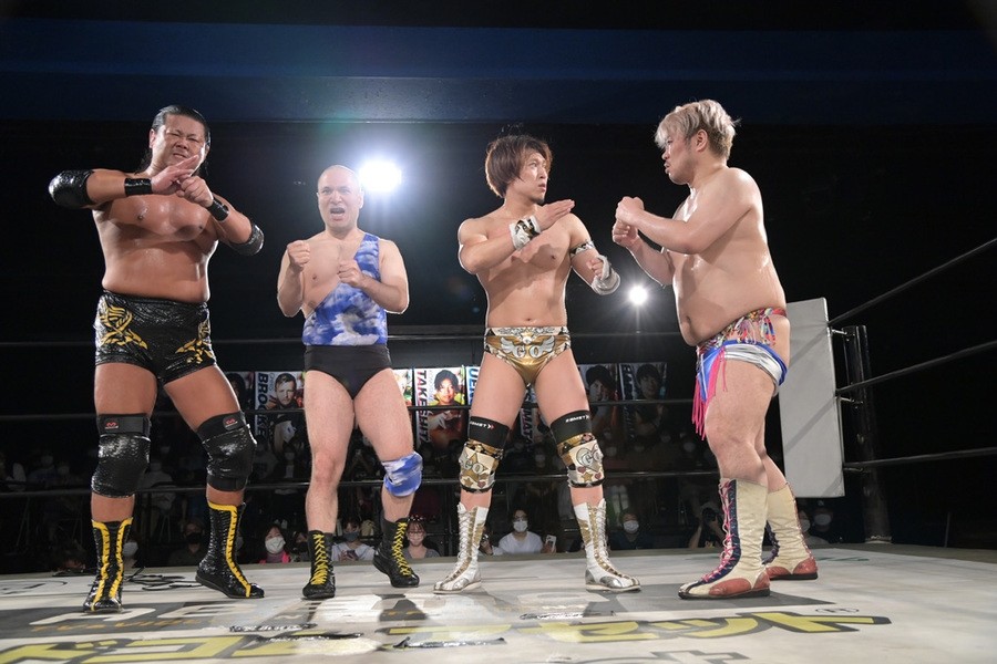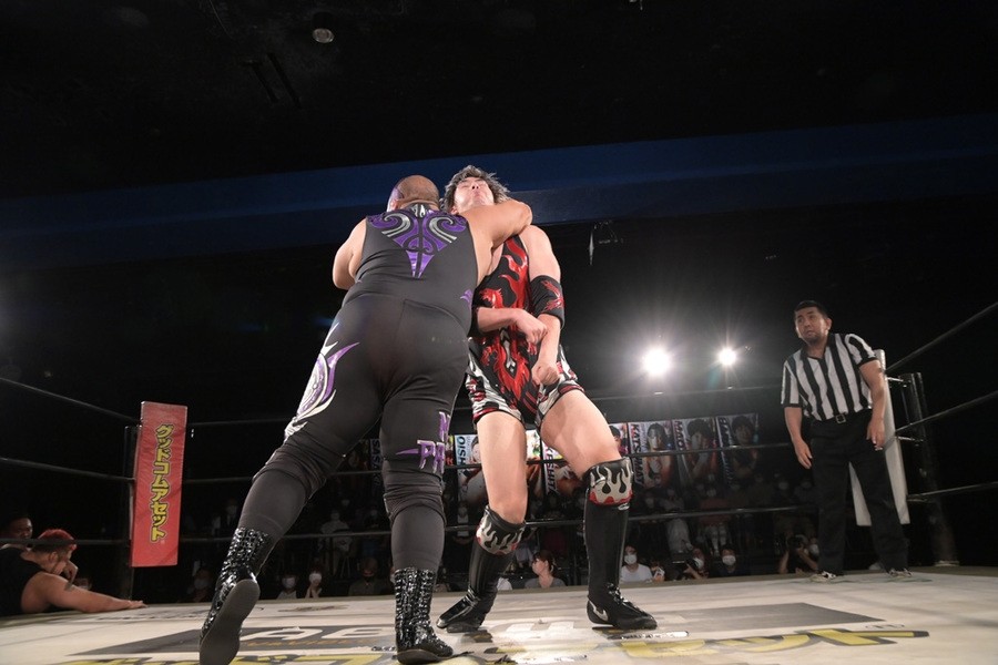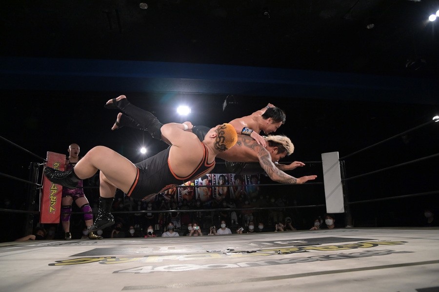 8・21富士通スタジアム川崎でのKO-D無差別戦の前哨戦。試合前勝俣とMAOが「熱波WER!!」を決めると、秋山は拍手。秋山と竹下で試合開始のゴング。いきなり激しいショルダータックル合戦。竹下が倒す。竹下が秋山の腕を取っていくと、秋山が取り返し岡田にタッチ。岡田がタックルを狙うと、竹下が自陣に引き込みMAOにタッチ。MAOがヘッドロックで岡田を追い込む。ビッグブーツの蹴り合いになるがMAOが蹴り勝つ。MAOから勝俣に代わるとコーナーからタオルを使ってのハンマーパンチ。竹下に代わると、岡田がエルボー連打で向かって行くが、竹下はエルボーから強烈なボディスラム。勝俣に代わると、勝俣はタオルで何度も殴打。岡田が自陣へ勝俣を引き込むと、秋山にタッチ。ここで勝俣を場外に出すと、秋山がビッグブーツから大石とハイジャック式のパイルドライバーを決める。勝俣は大ダメージ。ここから秋山組がタッチを繋ぎながら勝俣を捕える展開となる。秋山は「熱波WER!!」と言いながらエルボースマッシュをぶち込む。苦しい勝俣だったが、秋山にミサイルキックを決めると逆転に成功。竹下にタッチを繋ぐ。竹下が串刺しのエルボーを連発しフライング・ラリアットを決める。さらに秋山にDDTから変形チキンウィングの体勢に入ると大石と岡田がカット。向かって来る竹下を捕らえた秋山がエクスプロイダー2連発。カウント2でMAOがカット。ここで岡田がタッチを求めて秋山に代わり飛び込むと、竹下にエルボー連打からランニングエルボー。カウント1で竹下が返す。岡田のヘッドバット連発に竹下は強烈なエルボー。それでも耐えた岡田がブレーンバスターを決める。カウント2。岡田がバックを取るも、抜け出した竹下がジャーマン狙い。岡田も抜け出す。竹下が高角度のショルダースルーからラリアットを決める。MAOに代わると、串刺しの掌底からハリウッドスター・プレス。カウント2。みちのくドライバー狙いは岡田が着地。エルボーの打ち合いになるが、MAOはストレートナックル。MAOがムーンサルトダブルニー狙いも、岡田が回避しバックを取る。しかしMAOが体をくねらせ抜け出るが、岡田がドロップキックを決める。代わった大石がナックル連発。MAOがミラクルエクスタシーを狙うが、大石がウラカンラナ。これをヘッドスプリングで抜け出たMAOは控える秋山に一撃。突っ込む大石をマトリックスで回避すると、後方回転エビ固め。大石が返した勢いで勝俣にブラインドタッチ。MAOと勝俣がダブルのスワンダイブ式ミサイルキックを決める。竹下が飛び込み串刺しのブーツから投げっ放しジャーマン。MAOのフロッグ・スプラッシュから勝俣がととのえスプラッシュ。カウント2で岡田がカット。再度のカバーは秋山がカット。勝俣がムーンサルトを狙うと、大石は回避し勝俣着地。大石の低空ドロップキックから秋山がランニング・ニーバット。岡田がダイビング・ヘッドバット。大石がブルーダリアを決めるもカットされカウント2。ならばとミラクルエクスタシーの体勢も勝俣が脱出。バックの取り合いから、竹下が飛び込み眉山の体勢もこれは未遂。勝俣のトラースキックが竹下に誤爆。秋山が竹下を排除すると、大石が裏拳からミラクルエクスタシー。カウント2で勝俣が返すと、大石がフジヤマ・ニーロックの体勢。勝俣が押さえ込み、カウント2。すると向かって来る勝俣を大石がローリングクレイドルで捕らえる。カウント2で勝俣が返すとそのままフジヤマ・ニーロックへ。ガッチリと決まると勝俣もなすすべなくギブアップ。