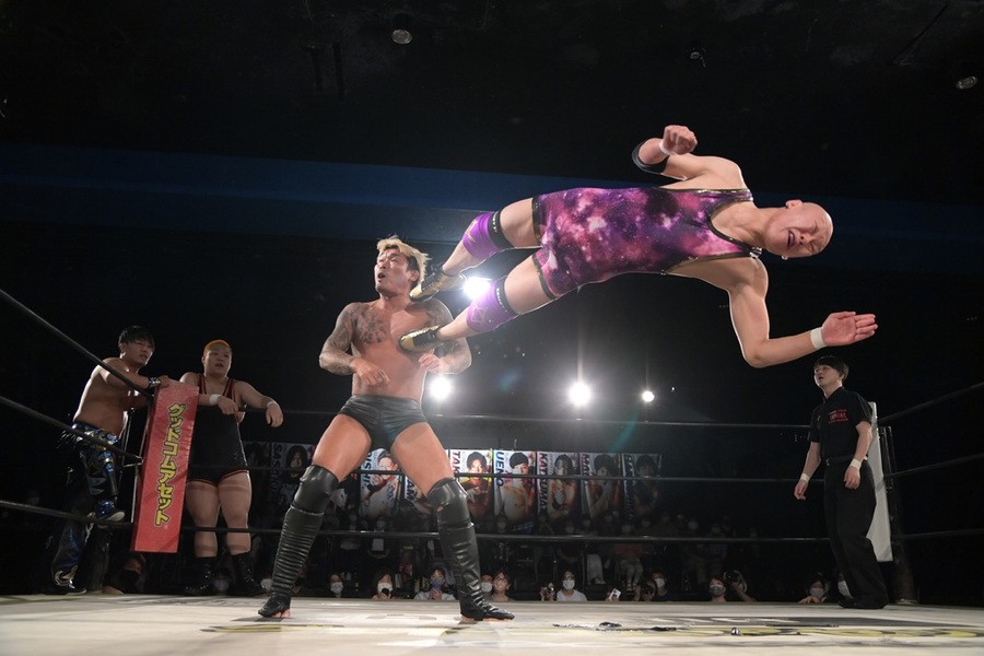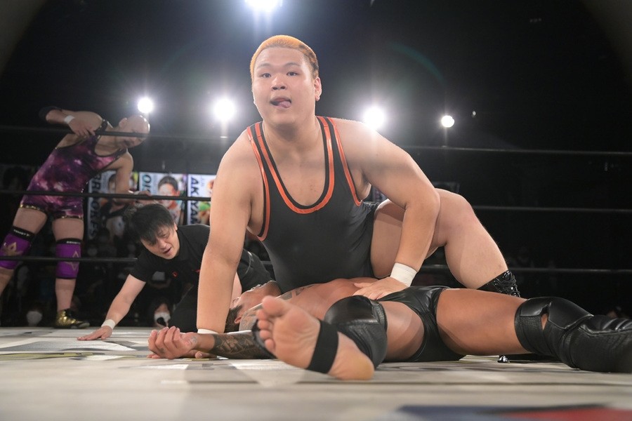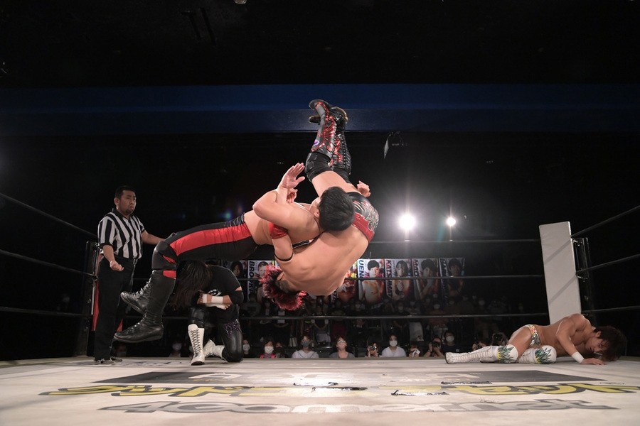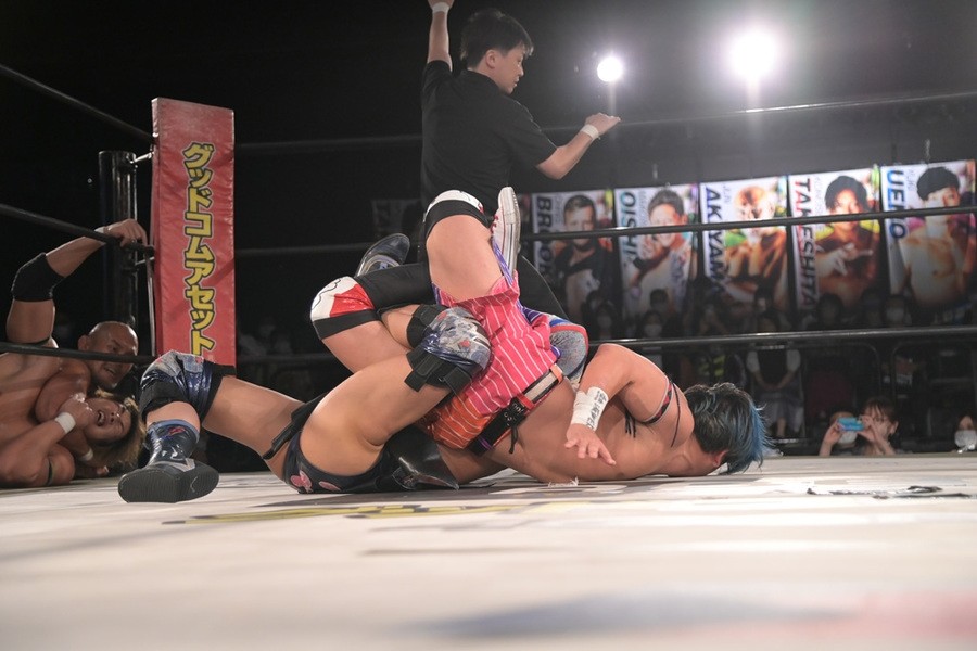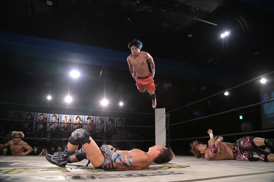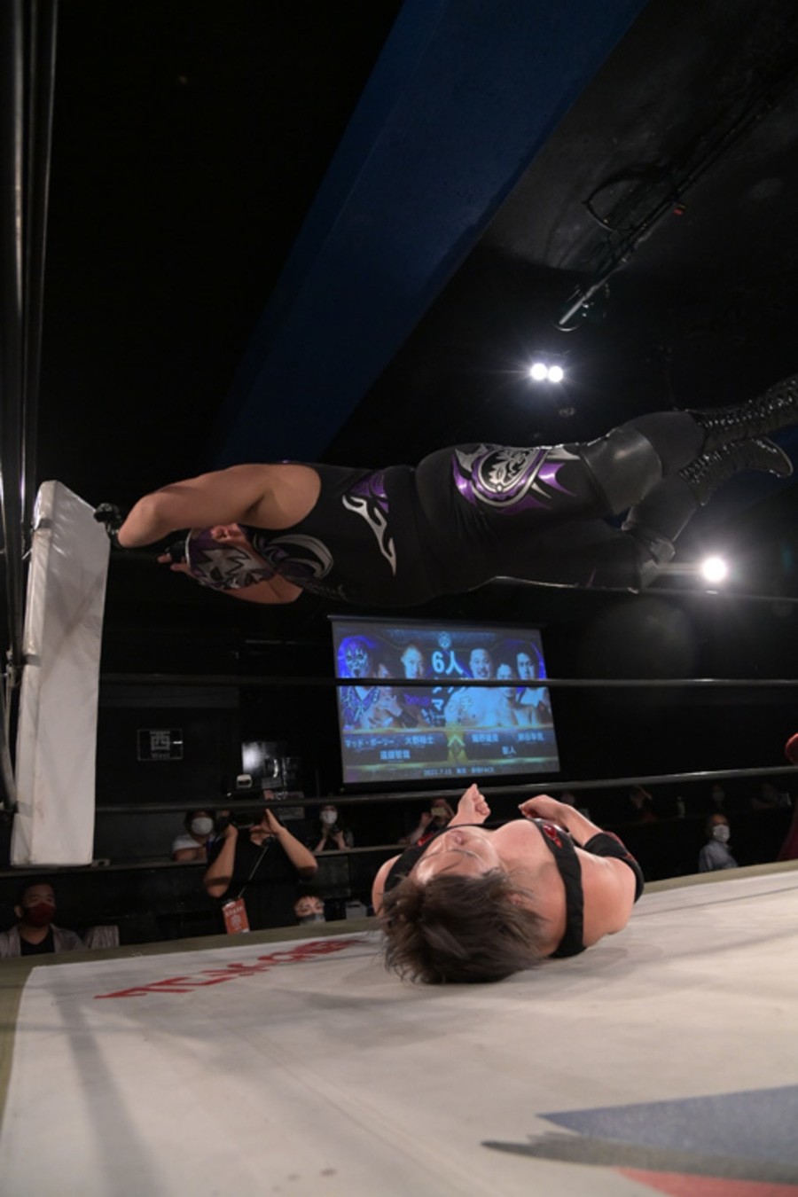 8・21富士通スタジアム川崎でのKO-D無差別戦の前哨戦。試合前勝俣とMAOが「熱波WER!!」を決めると、秋山は拍手。秋山と竹下で試合開始のゴング。いきなり激しいショルダータックル合戦。竹下が倒す。竹下が秋山の腕を取っていくと、秋山が取り返し岡田にタッチ。岡田がタックルを狙うと、竹下が自陣に引き込みMAOにタッチ。MAOがヘッドロックで岡田を追い込む。ビッグブーツの蹴り合いになるがMAOが蹴り勝つ。MAOから勝俣に代わるとコーナーからタオルを使ってのハンマーパンチ。竹下に代わると、岡田がエルボー連打で向かって行くが、竹下はエルボーから強烈なボディスラム。勝俣に代わると、勝俣はタオルで何度も殴打。岡田が自陣へ勝俣を引き込むと、秋山にタッチ。ここで勝俣を場外に出すと、秋山がビッグブーツから大石とハイジャック式のパイルドライバーを決める。勝俣は大ダメージ。ここから秋山組がタッチを繋ぎながら勝俣を捕える展開となる。秋山は「熱波WER!!」と言いながらエルボースマッシュをぶち込む。苦しい勝俣だったが、秋山にミサイルキックを決めると逆転に成功。竹下にタッチを繋ぐ。竹下が串刺しのエルボーを連発しフライング・ラリアットを決める。さらに秋山にDDTから変形チキンウィングの体勢に入ると大石と岡田がカット。向かって来る竹下を捕らえた秋山がエクスプロイダー2連発。カウント2でMAOがカット。ここで岡田がタッチを求めて秋山に代わり飛び込むと、竹下にエルボー連打からランニングエルボー。カウント1で竹下が返す。岡田のヘッドバット連発に竹下は強烈なエルボー。それでも耐えた岡田がブレーンバスターを決める。カウント2。岡田がバックを取るも、抜け出した竹下がジャーマン狙い。岡田も抜け出す。竹下が高角度のショルダースルーからラリアットを決める。MAOに代わると、串刺しの掌底からハリウッドスター・プレス。カウント2。みちのくドライバー狙いは岡田が着地。エルボーの打ち合いになるが、MAOはストレートナックル。MAOがムーンサルトダブルニー狙いも、岡田が回避しバックを取る。しかしMAOが体をくねらせ抜け出るが、岡田がドロップキックを決める。代わった大石がナックル連発。MAOがミラクルエクスタシーを狙うが、大石がウラカンラナ。これをヘッドスプリングで抜け出たMAOは控える秋山に一撃。突っ込む大石をマトリックスで回避すると、後方回転エビ固め。大石が返した勢いで勝俣にブラインドタッチ。MAOと勝俣がダブルのスワンダイブ式ミサイルキックを決める。竹下が飛び込み串刺しのブーツから投げっ放しジャーマン。MAOのフロッグ・スプラッシュから勝俣がととのえスプラッシュ。カウント2で岡田がカット。再度のカバーは秋山がカット。勝俣がムーンサルトを狙うと、大石は回避し勝俣着地。大石の低空ドロップキックから秋山がランニング・ニーバット。岡田がダイビング・ヘッドバット。大石がブルーダリアを決めるもカットされカウント2。ならばとミラクルエクスタシーの体勢も勝俣が脱出。バックの取り合いから、竹下が飛び込み眉山の体勢もこれは未遂。勝俣のトラースキックが竹下に誤爆。秋山が竹下を排除すると、大石が裏拳からミラクルエクスタシー。カウント2で勝俣が返すと、大石がフジヤマ・ニーロックの体勢。勝俣が押さえ込み、カウント2。すると向かって来る勝俣を大石がローリングクレイドルで捕らえる。カウント2で勝俣が返すとそのままフジヤマ・ニーロックへ。ガッチリと決まると勝俣もなすすべなくギブアップ。