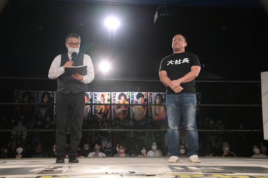青木がクリスと健闘を称え合う。そこに今林GMがやって来ると青木を祝福。今林GMが「次のタイトルマッチ、誰か闘いたい相手いますでしょうか?」と聞くと青木は「100万円が4カ月で2.5倍になる詐欺に引っ掛かって人生ボロボロなんだよ! もうもらう側じゃなくて取られる側の人生でボロボロなんだよ! しばらく休ませてください」と宣言。それでも今林GMが「そこを何とか……チャンピオンの宿命ですので誰かいないですかね?」と食い下がると青木は「誰か色っぽい、今売り出し中の誰かいませんか?」と聞く。今林GMが「若手でガッと来てる選手、色々いますよ?」と聞くと青木は「中村とか?」と言うも今林GMは「中村はちょっと……ごめんなさい!」と却下。続けて青木は「MAOとか?」と聞くと、今林GMは乗り気に。次の試合のMAOをリング内に呼び出す。MAOに挑戦の意欲があるか聞くと、MAOは「いつ何時でも、誰の挑戦でも受ける、それがオラのポリシーてもんだ!」と一言。これを受けて今林GMが8月15日後楽園ホール大会での青木vsMAOのダブルタイトルマッチを正式決定。2人は拳を突き合わせた。