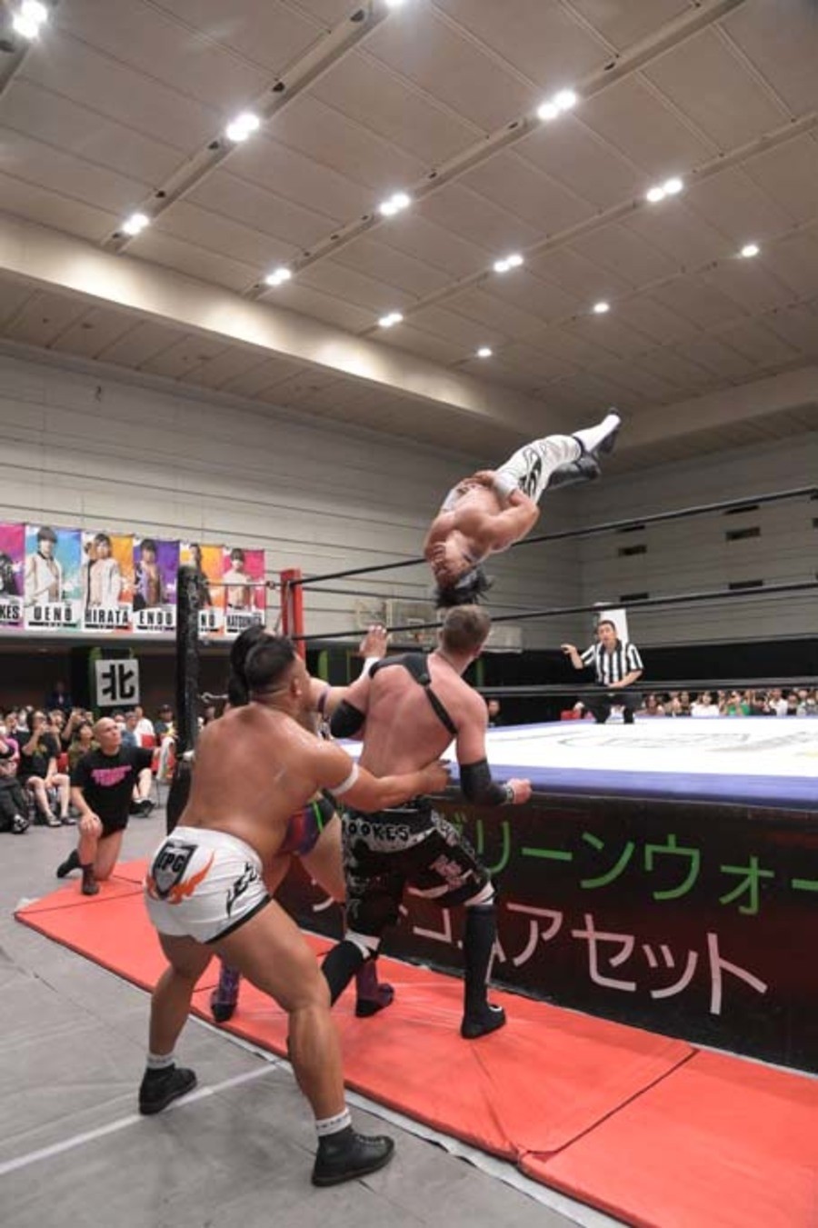 正田は遠藤にミドルキックを連打すれば、飯野とクリスがチョップ合戦。遠藤は変型デスロックで正田の足を絞め上げる。遠藤と正田がエルボーの打ち合いに発展。飯野が正田にバックフリップ、すかさず遠藤がスワンダイブ式ファイアーバードスプラッシュも、クリスがカット。遠藤が正田に旋回式ト―チャーラックボム狙いも、クリスが阻止してパイルドライバー。正田が遠藤に鋭角なジャーマンを決めるもカウントは2。遠藤は場外の2人めがけてサスケスペシャルを敢行。正田が雪崩式ブレーンバスター、正田のチカラKOBUムキムキからクリスがダイビング・ダブルニーも飯野がカット。クリスが遠藤にプレイングマンティスボムもカウント2で返す。遠藤は正田に変型スープレックス、クリスに旋回式トーチャーラックボムも決まらず。ならばとバーニングスター・プレスを投下も、クリスが回避。クリスは遠藤をオクトパス・ストレッチでグラウンドに移行し、絞り上げると遠藤がたまらずギブアップ。クリス組はベルトを戴冠し、正田は地元・大阪での「2周年記念試合」を勝利で飾った。