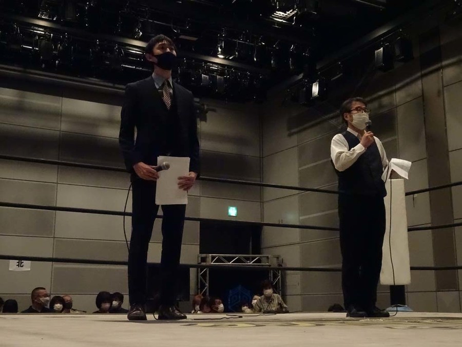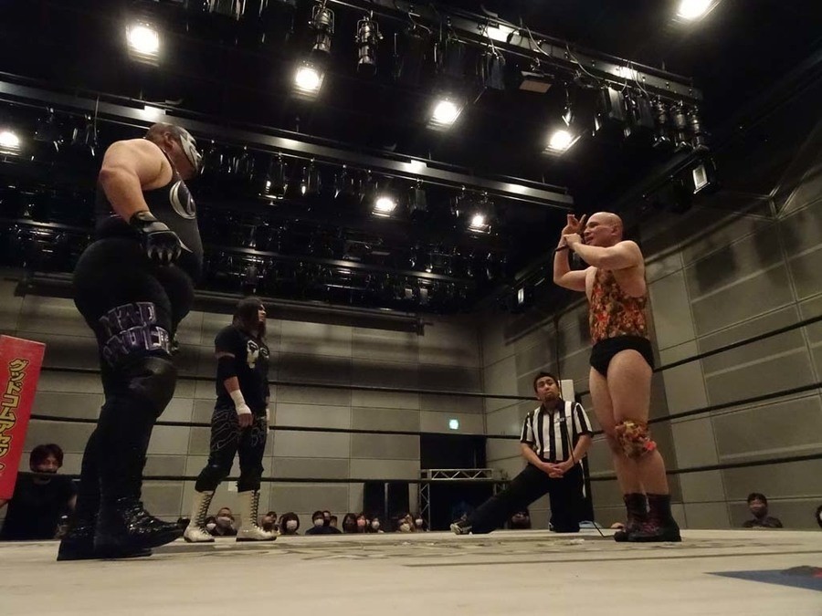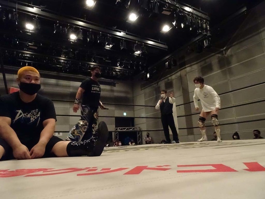 1年半ぶりとなる広島大会、昼夜大会の昼の部。今林GMと小菅リングアナがリングに登場し観戦に当たっての諸注意をアナウンス。そして本日メインでThe 37KAMIINAと6人タッグで対戦するDISASTER BOXが登場。メインでの勝利を誓い、3人によるオープニングコールで広島大会が幕を開けた。