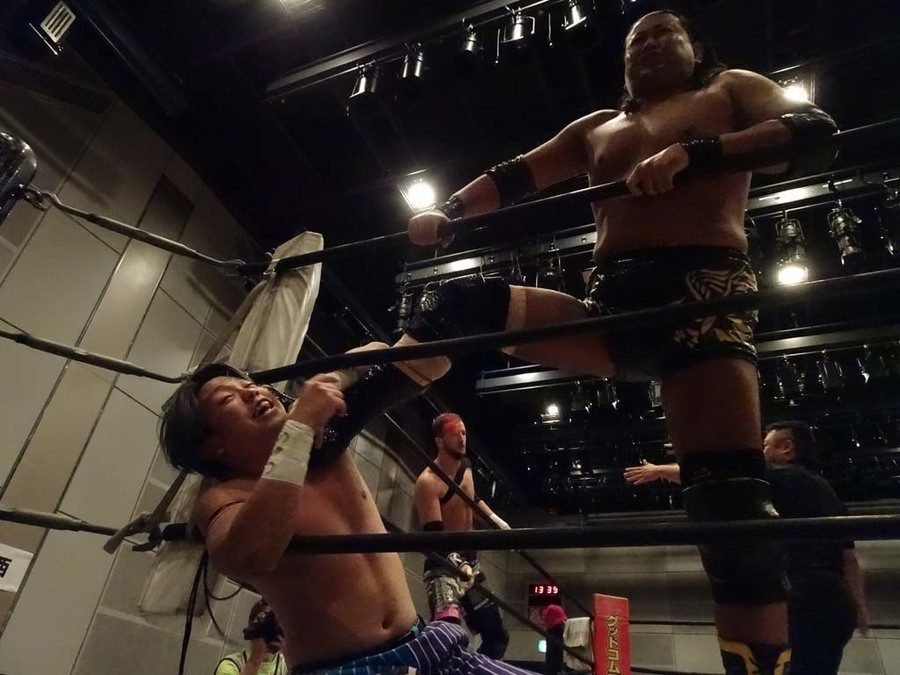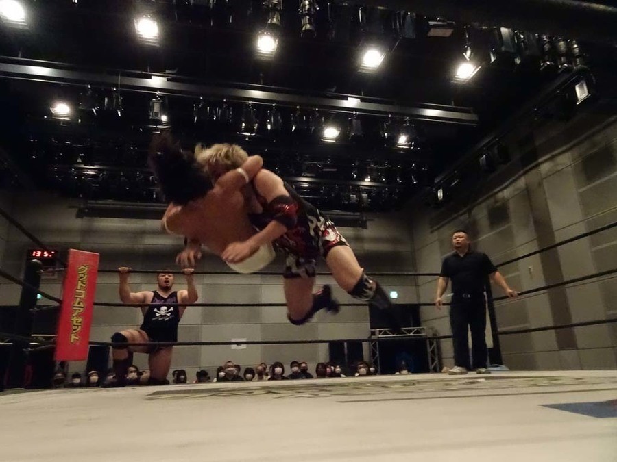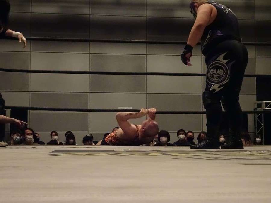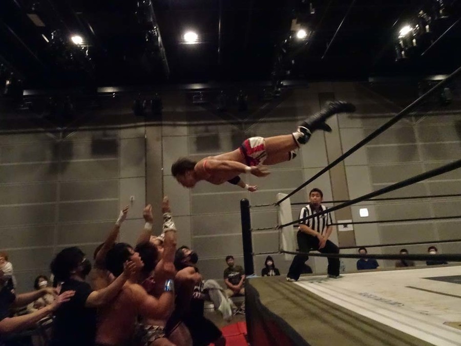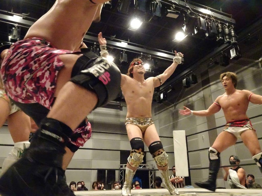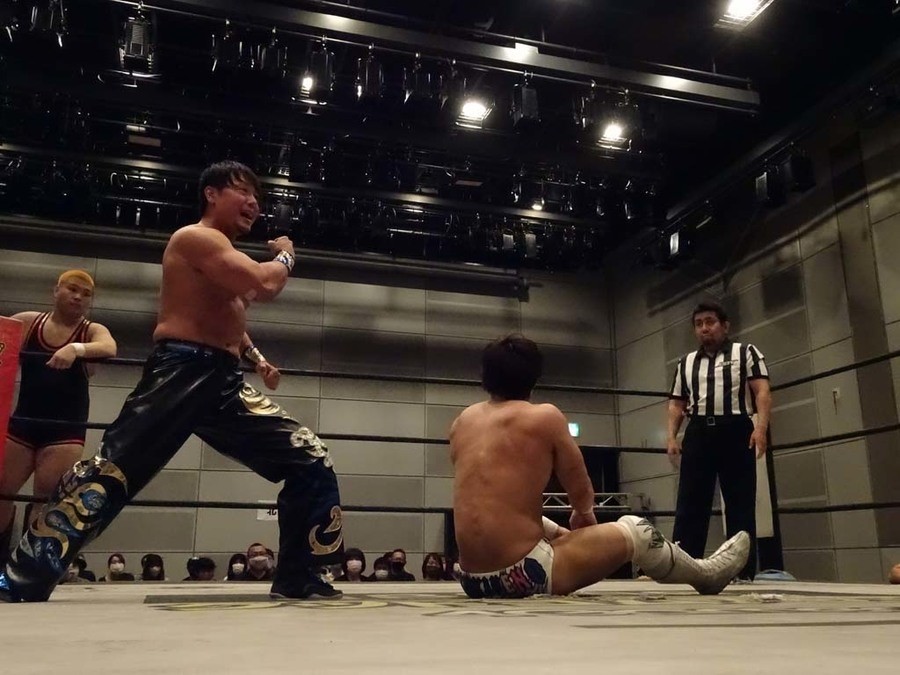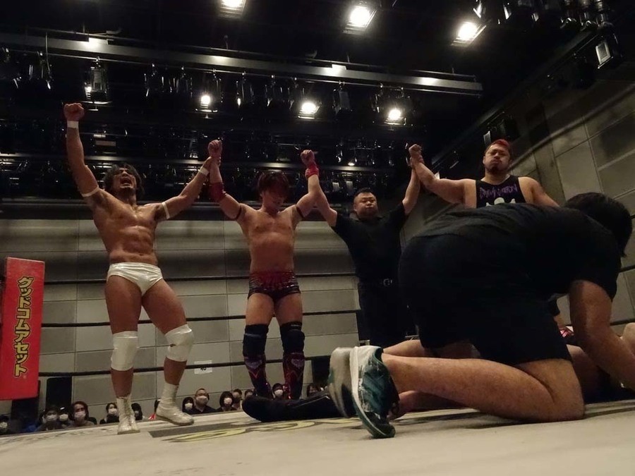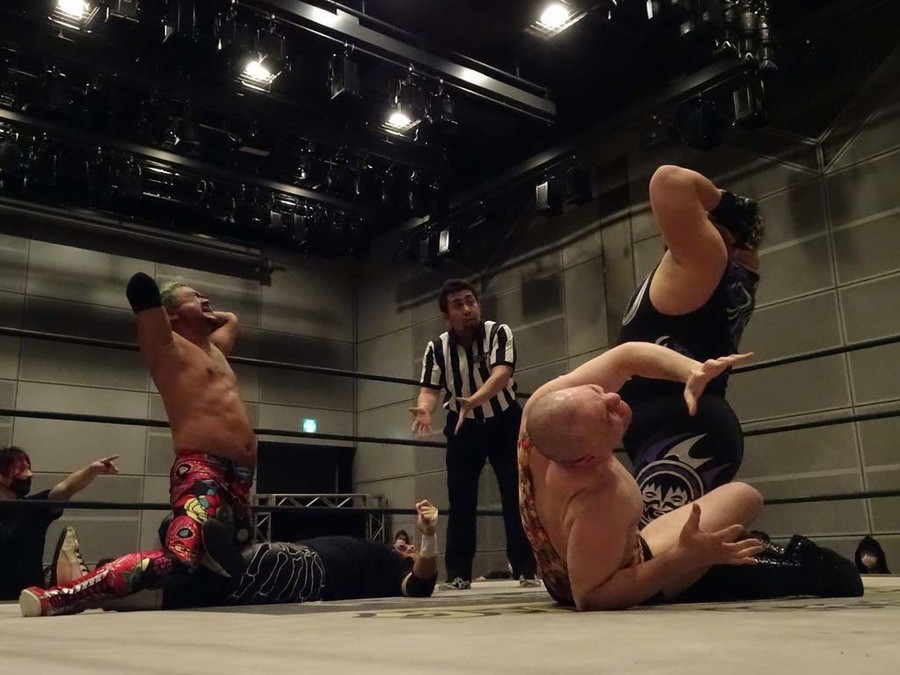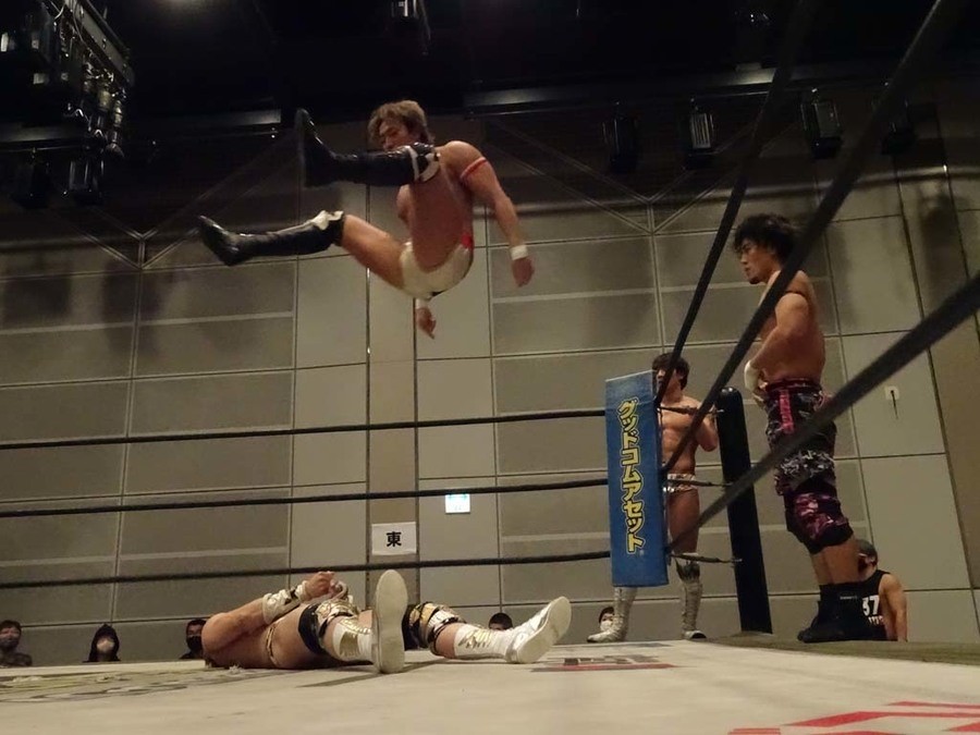 序盤は彰人がDAMNATIONに代わる代わる捕まる展開。しかし彰人がドラゴンスクリューを連発で決め逆転に成功すると、岡田にタッチ。岡田が串刺しのエルボーやランニング・エルボーで高尾に迫る。ダイビング・ヘッドバットを放つもカウント2。高尾もディープインパクトを決め、大和に繋ぐ。大和が岡田にスピアからスライディングX。エルボーの打ち合いになるも岡田が打ち勝ちドロップキック。岡田から納谷へ。納谷が串刺しのボディアタックからDDT、スクラップバスターで大和を追い込む。大和がカウンターのゼロ戦キックを決めると、火野にタッチ。火野が逆水平を連発し納谷を攻め立てる。納谷がエルボーを放っていくも火野は逆水平。納谷がキチンシンクを決め、ラリアットを狙うもキャッチした火野は投げっ放しのキャプチュード。それでも向かって行く納谷だが、火野はショートレンジのラリアット、カウント2。火野が納谷をロープに走らせてからラリアットをぶち込むも、納谷はカウント2で返す。ならばと火野が重い納谷を抱え上げ、FuckingBOMBで叩き付けると納谷も返せず3カウント。