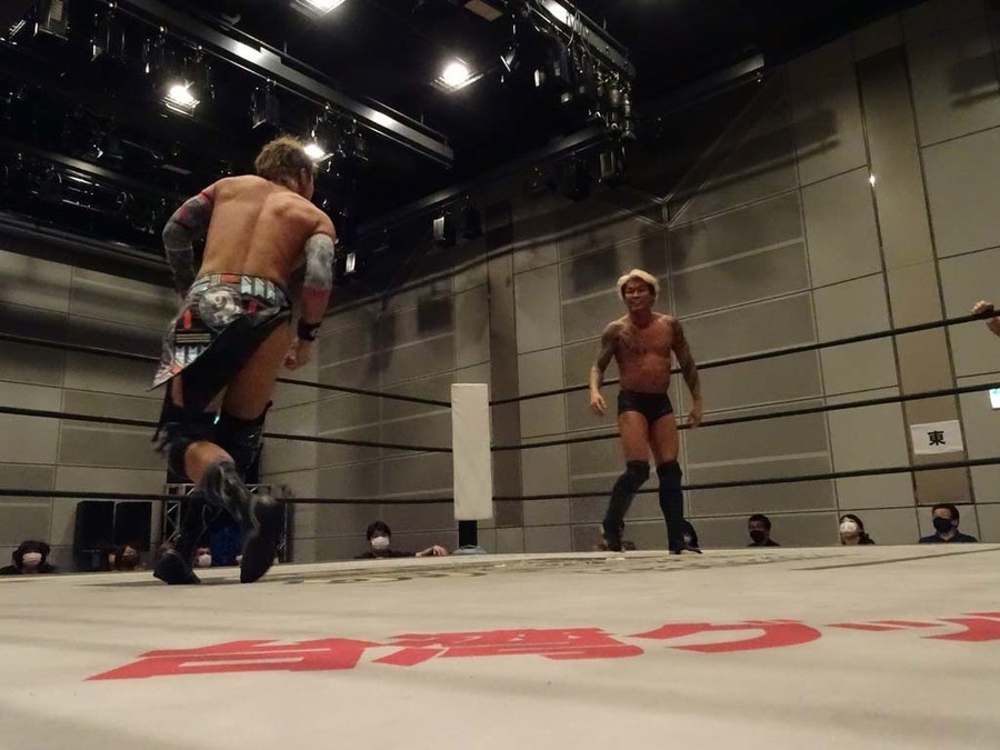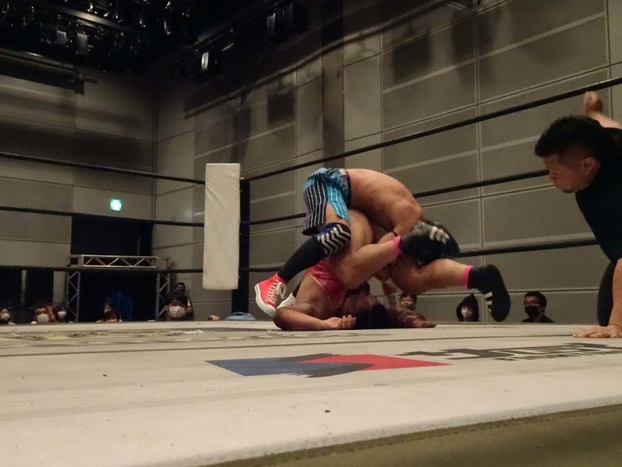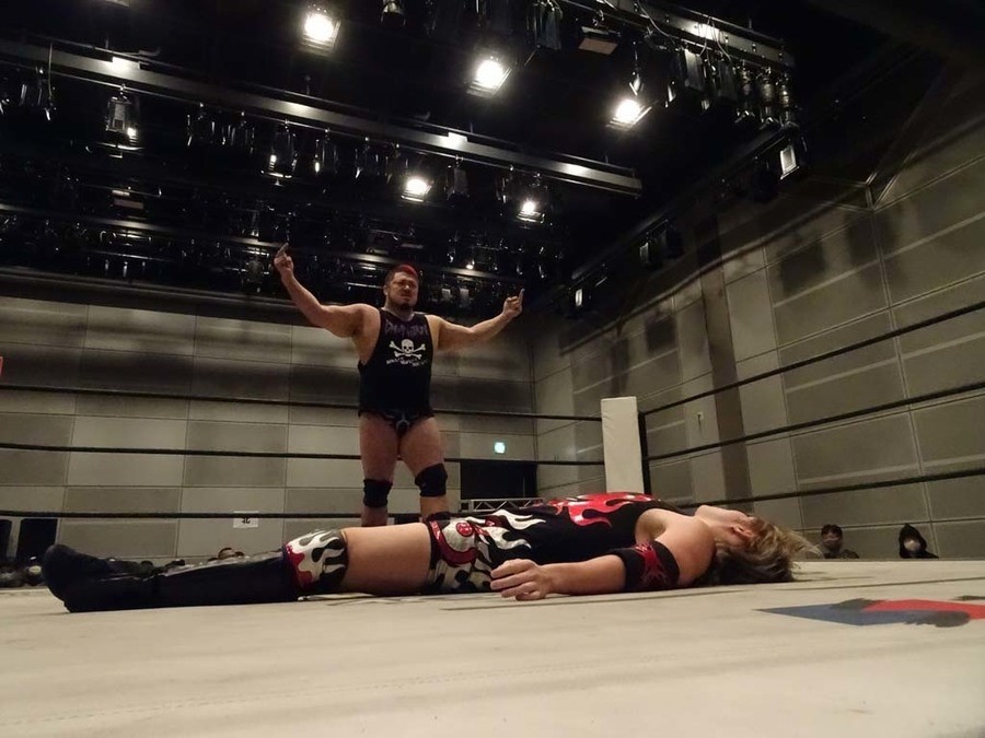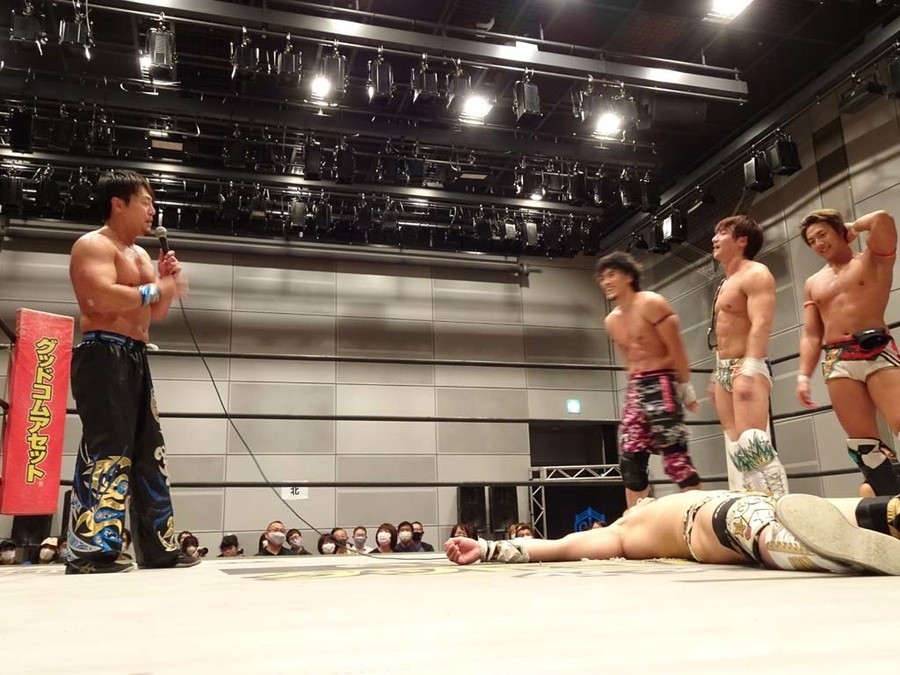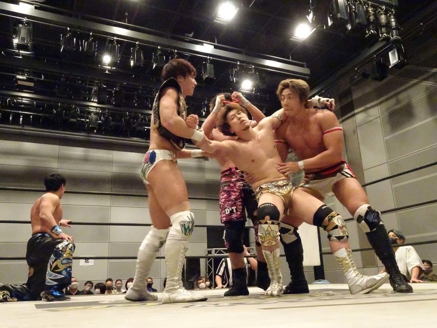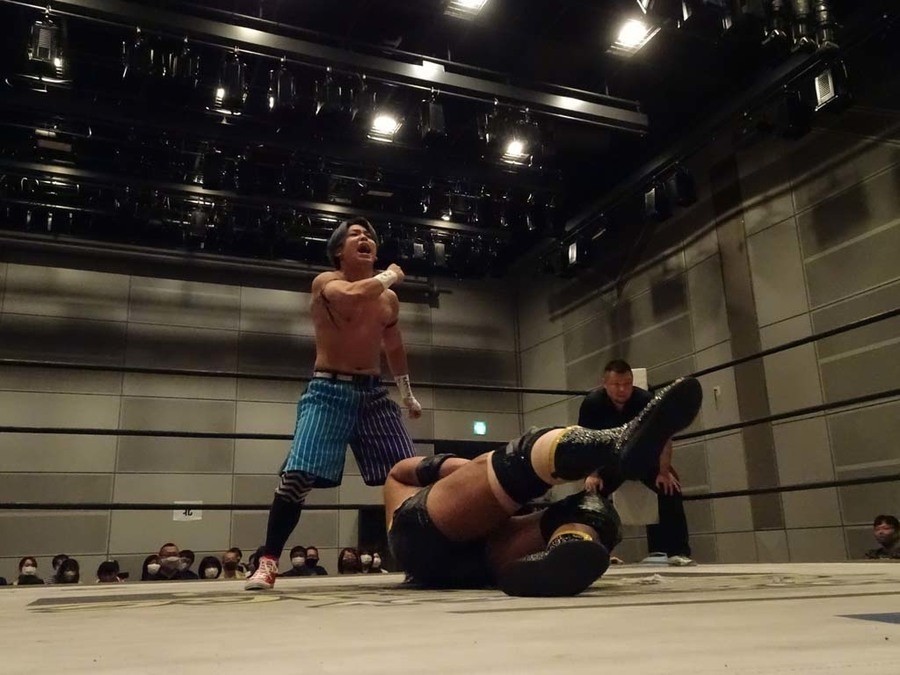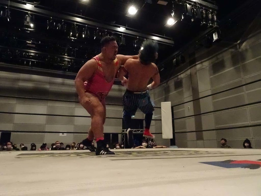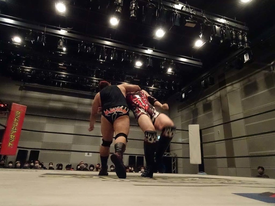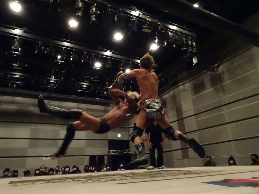 序盤は彰人がDAMNATIONに代わる代わる捕まる展開。しかし彰人がドラゴンスクリューを連発で決め逆転に成功すると、岡田にタッチ。岡田が串刺しのエルボーやランニング・エルボーで高尾に迫る。ダイビング・ヘッドバットを放つもカウント2。高尾もディープインパクトを決め、大和に繋ぐ。大和が岡田にスピアからスライディングX。エルボーの打ち合いになるも岡田が打ち勝ちドロップキック。岡田から納谷へ。納谷が串刺しのボディアタックからDDT、スクラップバスターで大和を追い込む。大和がカウンターのゼロ戦キックを決めると、火野にタッチ。火野が逆水平を連発し納谷を攻め立てる。納谷がエルボーを放っていくも火野は逆水平。納谷がキチンシンクを決め、ラリアットを狙うもキャッチした火野は投げっ放しのキャプチュード。それでも向かって行く納谷だが、火野はショートレンジのラリアット、カウント2。火野が納谷をロープに走らせてからラリアットをぶち込むも、納谷はカウント2で返す。ならばと火野が重い納谷を抱え上げ、FuckingBOMBで叩き付けると納谷も返せず3カウント。