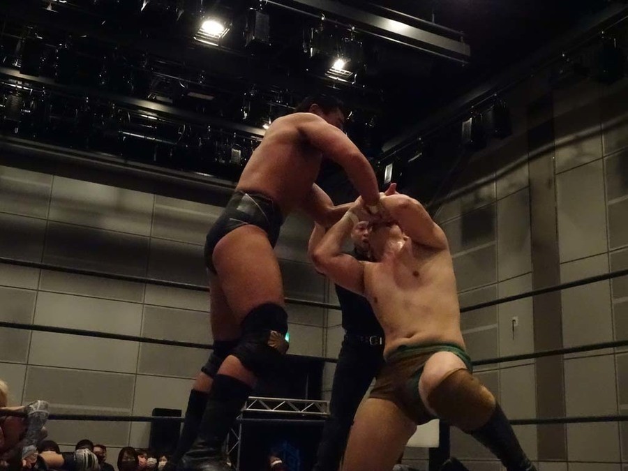 Eruptionと準烈によるユニット対抗戦。樋口&坂口がキャリアで劣る岡谷を捕まえる展開となる。防戦一方の岡谷だったが、向かって来る樋口を迎撃しランニング・エルボーを決めて逆転に成功。大石に代わるとランニング・フォアアームを連発し試合を優位に進める。樋口のカナディアン・バックブリーカーは大石がパロ・スペシャルで切り返す。樋口はこれを再度カナディアン・バックブリーカーに。これは岡谷がカット。大石から岡谷に代わると、ミサイルキックで飛び込む。得意のブルドッキング・ヘッドロックを狙うと、樋口がブレーンクロー。大石がカット。大石の援護から岡谷がブルドッキング・ヘッドロック、ランニング・ネックブリーカーを決めるがカウント2。岡谷が変形のストレッチプラムを決めるが、坂口にカットされてしまう。追撃を狙う岡谷に樋口がブレーンクロー。一気に絞り上げるとお方もギブアップ。