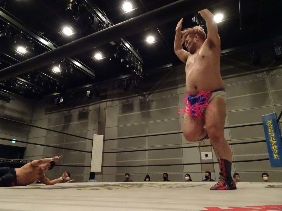 異常なやる気を見せるアントンだったが、DAMNATIONの猛攻に遭い防戦一方に。それでもアントンがボーン・トマホークで一矢報いると、パロマに繋ぐ。パロマがラリアットをポーリーに連発するもポーリーは効かない。ならばとコルバタを決めると、パロマはアンダータイツ姿に。パロマが低空ドロップキックから顔面ドロップキック、カバーは佐々木がカット。パロマが佐々木に監獄固めから腰をくねらせる恍惚を決めると、なぜか呼応したポーリーがアントンに恍惚を決める。パロマがポーリーの恍惚をカットすると、ポーリーはテーズプレスで圧殺。ポーリーから佐々木に代わり、パロマがカウンターのドロップキック。そしてアントンにタッチを繋ぐと、アントンがロープに足を引っかけ転倒。ギブアップしかけるも、創作昔話『ごんぎつね』の朗読を懇願。結果揚げ玉ではなく下ネタ。サミングを狙うもあっけなく阻止されてしまう。パロマが飛び込み、ダブルのバイオニックエルボーを決める。アントンがダイビング・フィストドロップを放つも、佐々木がブロック。そこからクロス・フェースロックへと繋ぐとアントンもギブアップ。DAMNATIONが退場するとアントンがマイクを持ち「チクショウ……畜産の“畜”に“生きる”と書いて畜生……。負けた上にこんな姿にさせられちまって、恥ずかしい……。パロマさん大丈夫ですか? パロマさん今日の試合が数カ月ぶりの復帰戦ですよね? それにしては結果はどうあれ、パロマさんの動きだけはキレキレでしたよ!(会場拍手)キレキレでビックリしました。そうですよね?(会場拍手)今日はありがとうございました!」と言ってパロマにマイクを渡す。パロマが「何とかコロナウィルスから回復して、今俺はTバックを履いている……(会場笑)コロナウィルスを俺も舐めてたけどよ、あいつら案外強かった。だけど、俺たちレスラーはこうやってリングでTバックを履いているから、みんなも用心して、あともうちょっとの辛抱だと思うからよ、またDDT広島大会、来てくれ!(会場拍手)」とセミファイナルを締めくくった。