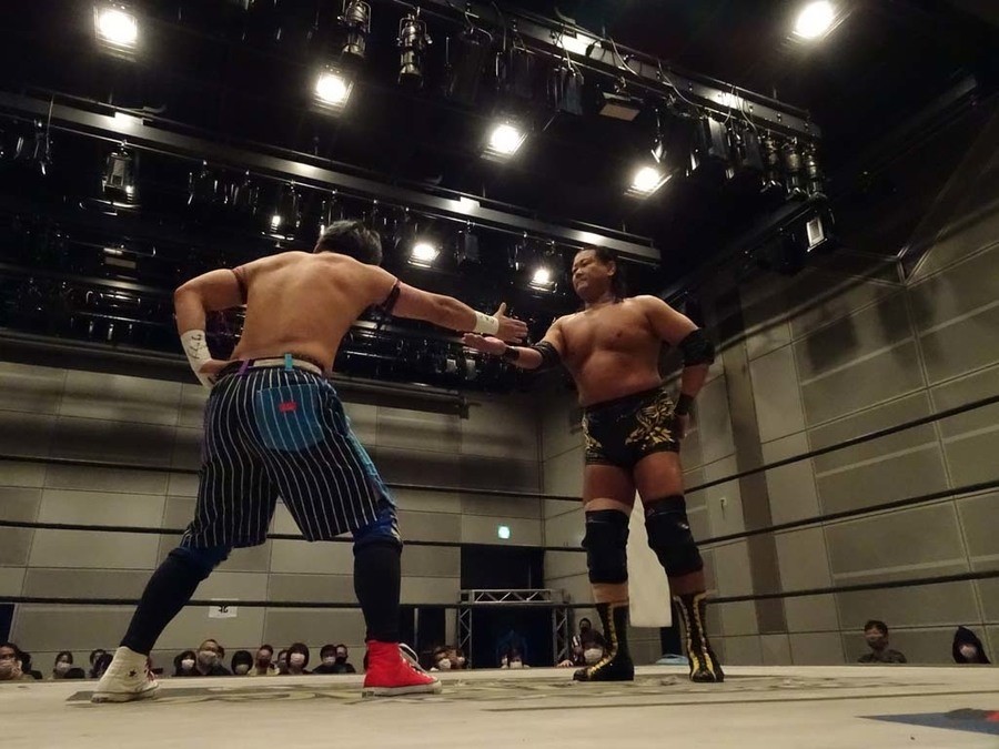 竹下 そんなThe 37KAMIINAですけど、僕とMAOさん次の後楽園でね、シングルマッチするんで。最近だとD王GPで昨年末に当たったんですけど、あん時左腕怪我してて本調子じゃなかったし。若干スランプで楽しく試合出来なかったんで。次は楽しく試合が出来たらいいなと。