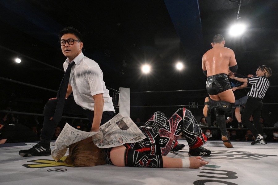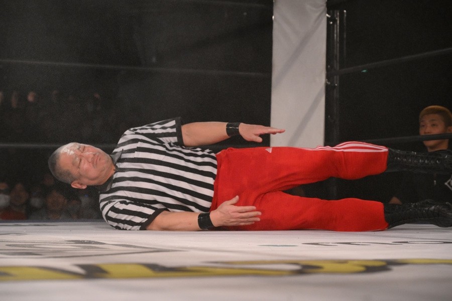セミファイナルで発表されていた対戦カードは、里村vsシン・髙木三四郎 with 髙木三四郎。シン・髙木の正体が誰なのか注目を集めていたが、どうやら髙木に扮した広田のもよう。
