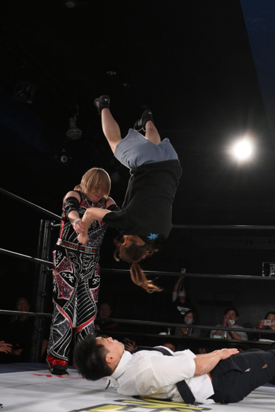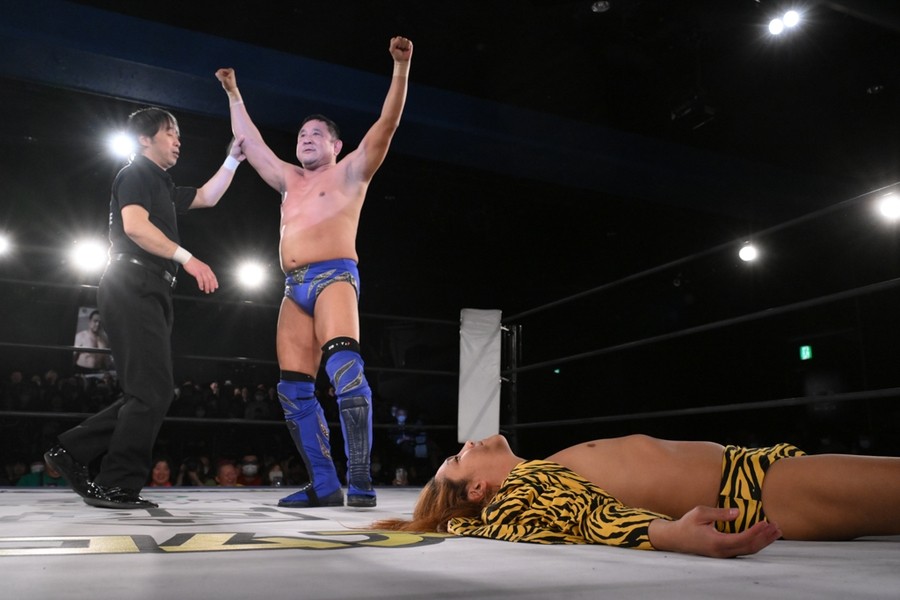 永田はまたもやショルダータックルからのエクスプロイダーで決めにいくが、黒潮はなんとかカウント2でクリア。永田はナガタロックⅡも、エスケープした黒潮はジャケットパンチ連打で反撃。スワントーンボムは自爆し、永田が腕固めで絞め上げるも黒潮はロープへ。黒潮は掟破りの腕固め、バズソーキック、イケメンサルトでたたみかけるもフォールは奪えず。永田はフロント・ハイキック、ジャンピング・ハイキックからバックドロップホールドでトドメを刺した。