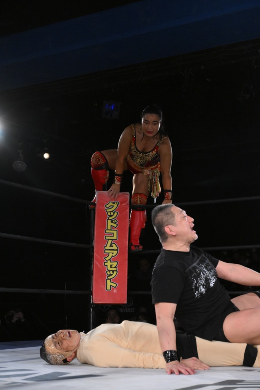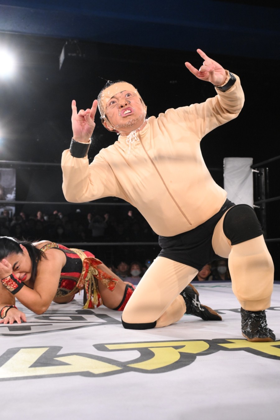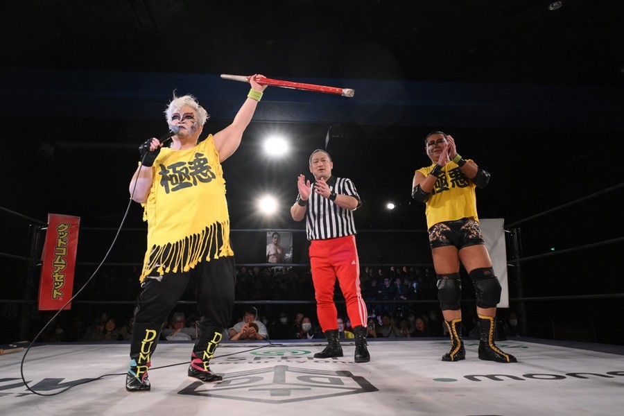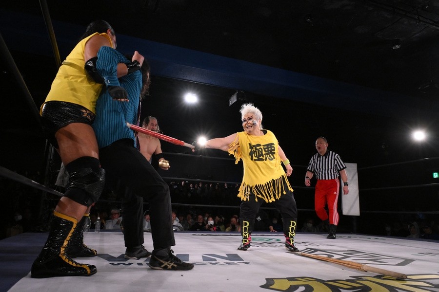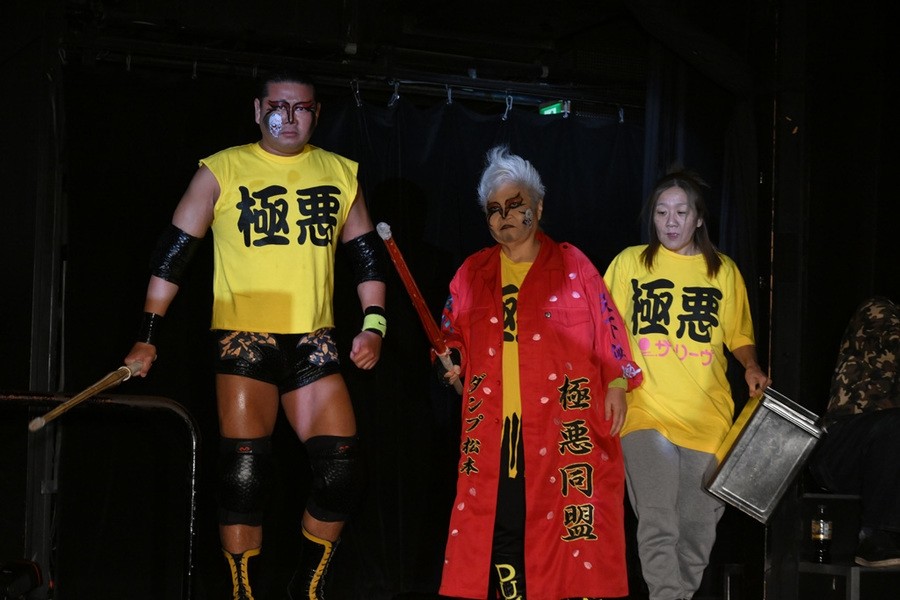 “極悪女王”ダンプ松本が降臨し、阿部三四郎レフェリーのアシストを得て、バラモン兄弟(バラモンシュウ&バラモンケイ)を制した。