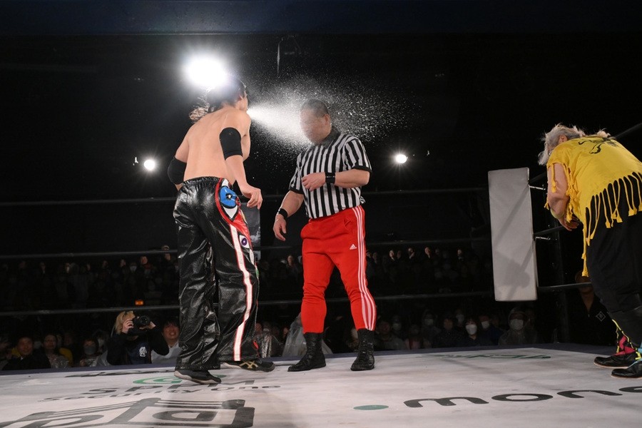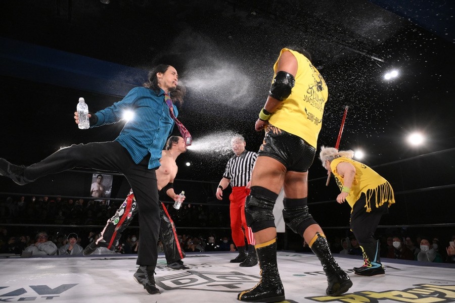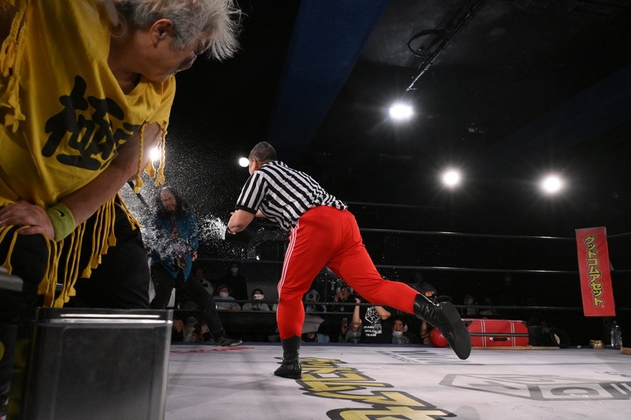 バラモン兄弟は大御所のダンプにも容赦なく水を浴びせる。さらにボーリング攻撃とやりたい放題。ダンプは竹刀で応戦も、大鷲に誤爆してしまう。シュウの鉄板攻撃がケイに誤爆すると、阿部レフェリーがケイに水をぶっかける。すかさずダンプがケイを一斗缶で殴打し、ボディプレスで圧殺すると、阿部レフェリーが本家もビックリの超高速カウントでスリーが入った。