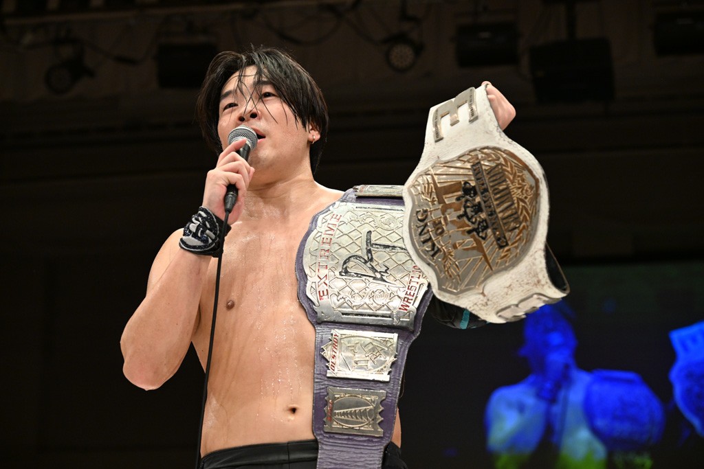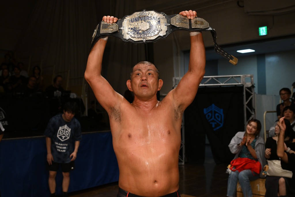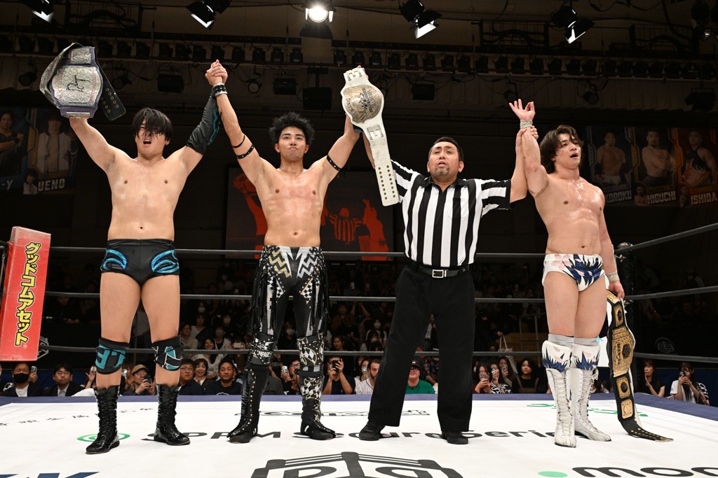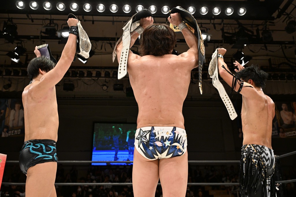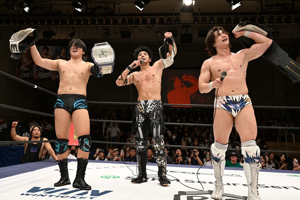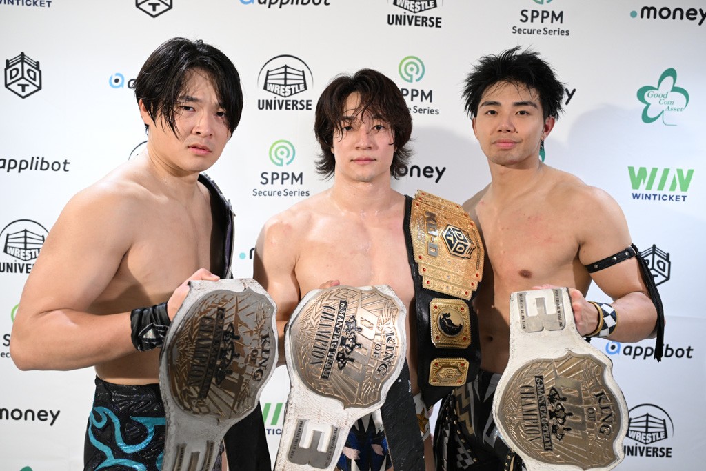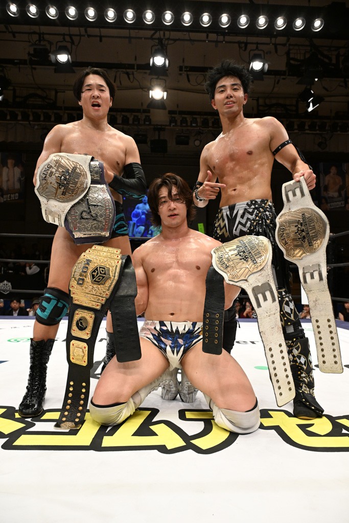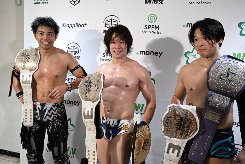 チームリーダーの上野は「こうやって、チームで進んでいく力を見せられるのは大変光栄。今日の試合を武知海青が乗り越えたということは、痛みと恐怖と…。この数戦ですべての値のマックスを体験しています。海青は最強の男に近づいておりまして、鈴木さんと戦い、いつか僕と戦うことがあれば、このベルト(無差別級)に近づくことでしょう。まずは6人タッグのベルト、3人で無限防衛」と永久保持も視野に入れた。15日後に迫った鈴木戦については「僕は世界の鈴木みのるにUNIVERSALを獲られて、これが世界だ。世界がUNIVERSALを持てば、こんなに広がって面白くなるのかと思いました。僕はDDTプロレスの王様です。それで、世界の鈴木みのるに勝つことで、僕がDDTにいながら世界に届けられる。そんな、世界に響くチャンピオンになってみせます。僕が鈴木みのるに勝ちたいのは鈴木みのるがすごいから。鈴木みのるのようになりたいから。でも、僕は僕だから、鈴木みのるに勝って、UNIVERSALも無差別も6人タッグのチャンピオンでもあって、このDDTを、プロレス界を盛り上げちゃうぞ」と3冠王宣言。