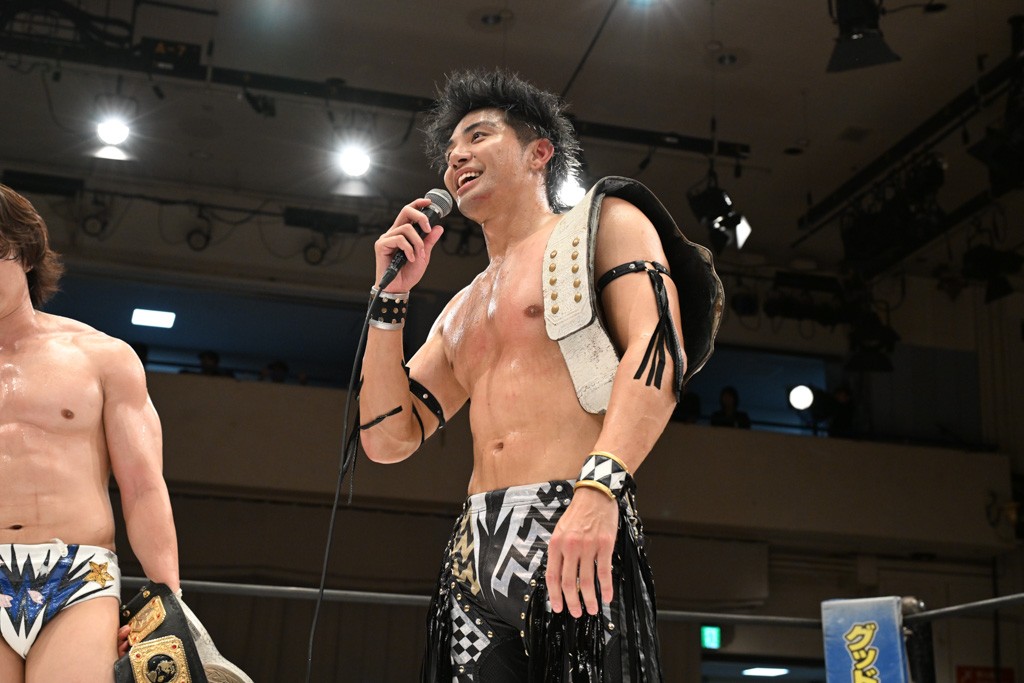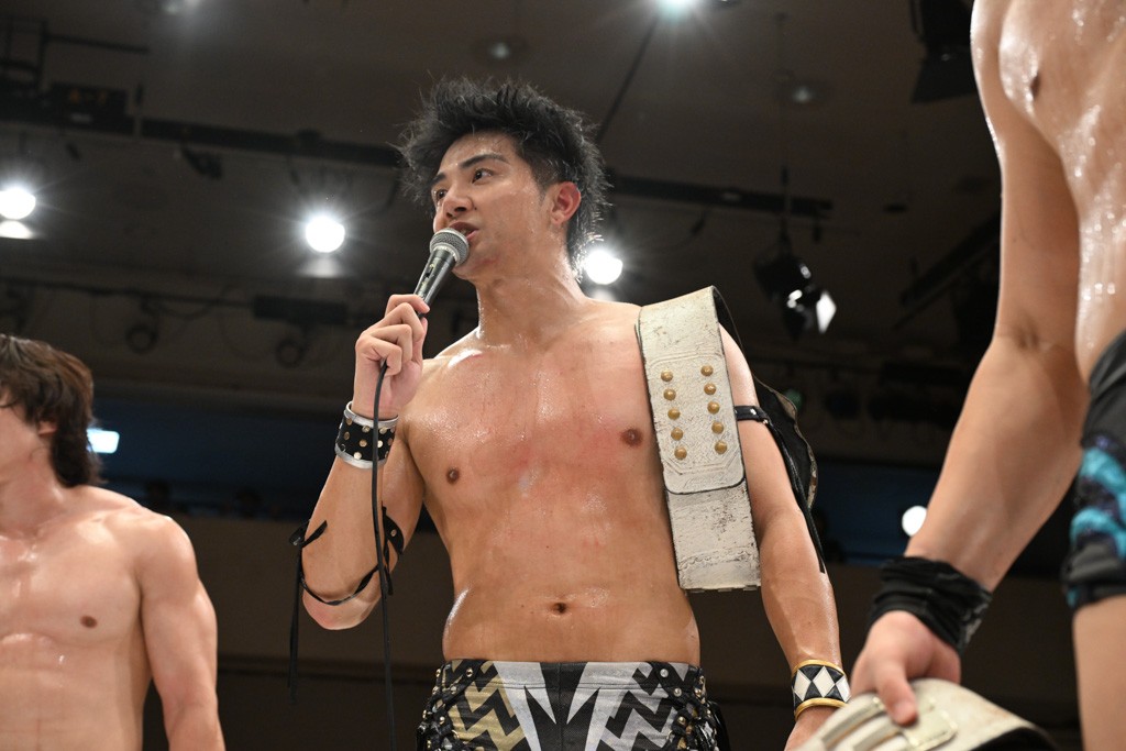 バックステージで武知は「初めて防衛することができました。人生で一度しかない経験だったので楽しかったですね。今日は初めてのことだらけで、もちろん恐怖もすごかったし、痛かったし、それを乗り越えた先に、初めて上野さんと強力な連係技ができたというのは、自分の中ですごく成長というか…。プロレスって、もっと僕が知らない面白さがあるんだなって、深いところまで少し気づいた気がします。まだまだ僕が知らない楽しさだったりとか、悔しさも含めて、幸せもそうですけど、いろいろなものがあると思うんで、プロレスには。そこに自分から足を踏み込んで、これからもたくさん浸っていきたいなって思います」と試合を振り返った。