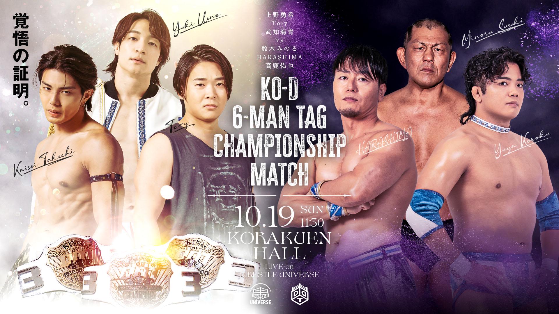 10月19日、東京・後楽園ホールで「WRESTLING HARVEST ~ 茜色に染まる空 ~」が開催。16人組ダンス&ボーカルグループTHE RAMPAGE・武知海青が上野勇希、To-yとのトリオで保持するKO-D6人タッグ王座の初防衛戦に臨み、“プロレス王”鈴木みのる、HARASHIMA、高鹿佑也組の挑戦を退け王座を死守し、初防衛に成功した。