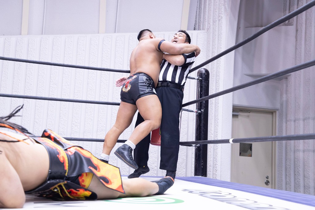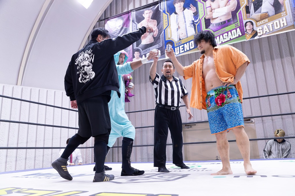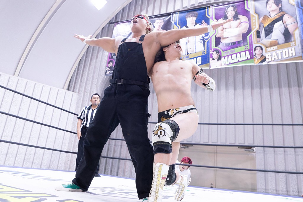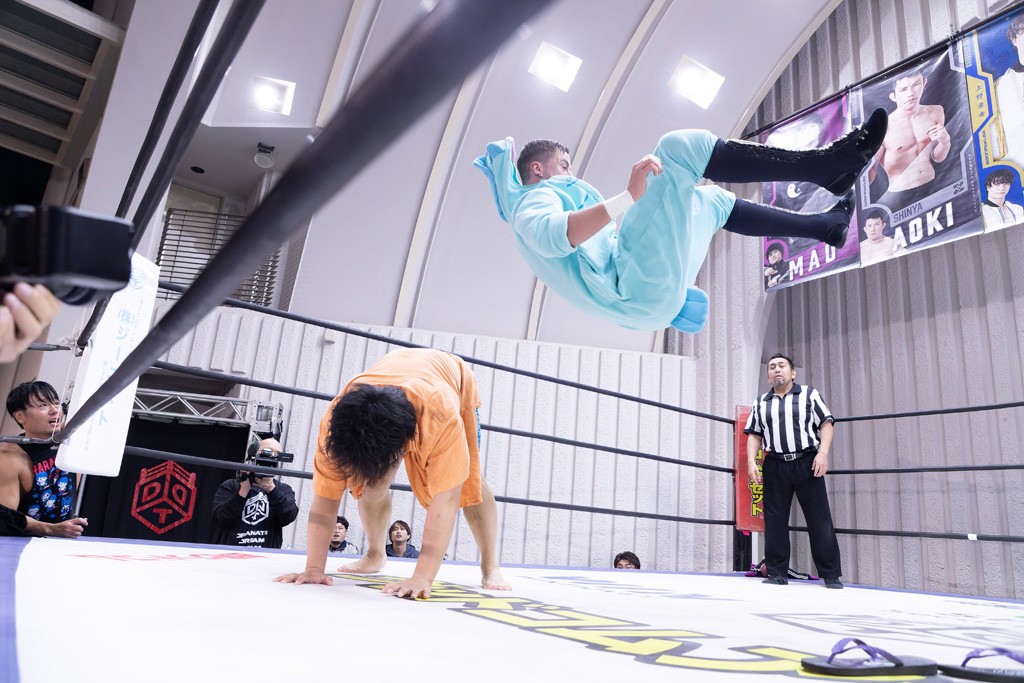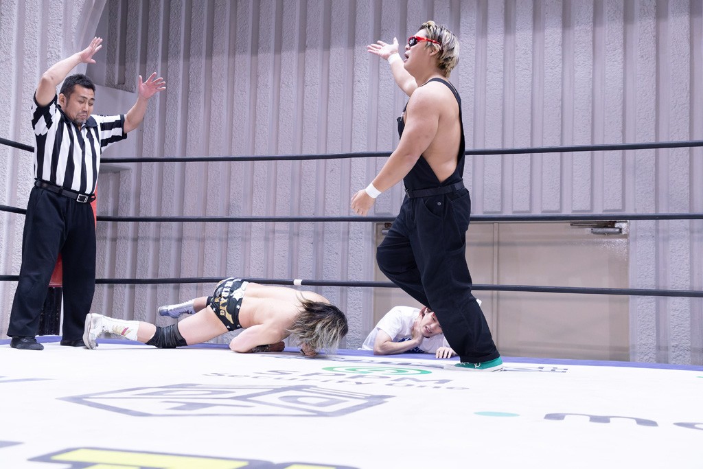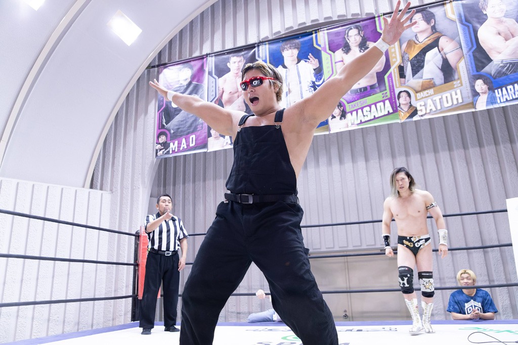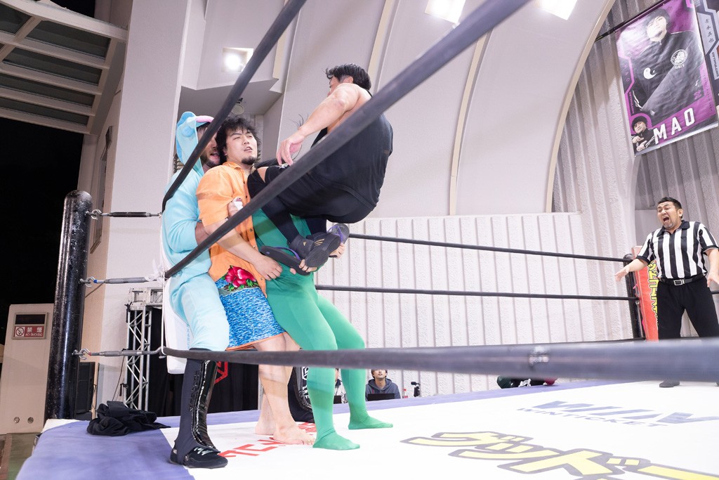 10月23日「ビアガーデンプロレス 2025 〜 THE FINAL 〜」東京・上野恩賜公園野外ステージ大会が開催。この日のセミファイナルは「KING OF DRUNK 2025 FINAL~年間王者決定戦~」と題し、3月27日上野大会で春の王者となったMAO、7月16日新宿大会でトリプルフォールにより3者同時で夏の王者となったHARASHIMA、佐々木大輔、クリス・ブルックスの計4人がドランクマッチ年間王者の座を懸けて激突した。今回の試合は、通常のプロレスルールに加え、試合中のランダムなタイミングで曲が流れ、その度にお酒を1杯飲み干さなくては失格となるルールで行われた。4選手が入場してくると、すでに全員泥酔状態。乾杯からビールを飲み干すと試合開始のゴングが鳴らされた。試合はいきなりの泥試合。グダグダな展開から曲が流れビールを4人、さらに松井レフェリーまでも飲み干し次第に仕上がっていく。松井レフェリーに一同がゴムパッチンを狙う展開になるが、松井レフェリーの逆襲に遭いクリス、MAO、HARASHIMAがゴムパッチンを被弾。中盤に差し掛かると、酒がテキーラに変更。4人の泥酔度合いが加速していく。場外に戦場を移すと、HARASHIMAが蒼魔刀を狙ったところで「爆乳戦隊パイレンジャー」がかかり、踊り出してしまい蒼魔刀は出来ず。増量したビールを4人が飲み干すと試合続行。リングに戻るとMAOが蒼魔刀を狙うが、またも「パイレンジャー」がヒット。ビールを飲み干した後に試合再開。クリスが蒼魔刀を狙うもまたまた「パイレンジャー」がヒットし中断。何とか4人が飲み干し試合を再開すると、佐々木が蒼魔刀狙うもまたまたまた「パイレンジャー」。4人が酒を飲み干そうとしたところ、突如今林GMが「いくらビアガーデンでもふざけ過ぎだろ!」とブチギレ。お客さんにも悪態をつくと、松井レフェリーをリングから追放。怒りの収まらない今林GMが「酒飲んでふざけてる奴らを見て喜んでる時代じゃねぇんだよ! 学生じゃねぇんだからさ!」と言うと、4人を次々と叱責していき「お前らもうちょっとプロレスに真摯に向き合えよ! ちゃんとプロレスしようぜ!」と叫んだところで「パイレンジャー」がヒット。すると今林GMもこの曲の魔力は打ち勝てず、踊り始める。今林GMがクリス、MAO、佐々木と裏拳で蹴散らすが、避けたHARASHIMAがアームブリーカーで今林GMの腕を破壊。今林GMが排除されると、コーナーで折り重なった佐々木&MAO&クリスにHARASHIMAがついに串刺し式の蒼魔刀を決めるもそのままダウン。するとHARASHIMAの上に3人が次々とダウン。松井レフェリーが3カウントを叩き試合は終了。松井レフェリーが折り重なった選手を1人ずつ剥がしていくと、HARASHIMAの真上で覆い被さりフォールの状態になっていたのは佐々木。松井レフェリーが佐々木を勝者と認定し、KING OF DRUNK 2025の年間王者は佐々木となった。バックステージで佐々木は「俺がKING OF DRUNK 2025覇者だ。俺は常識人だ。俺たちの飲み方を見てこんな飲み方をしてはいけないと学んで、家でやれ。ゲロぶち撒けるぞ、この野郎……!」と注意喚起なのか何なのかわからないことを叫び消えていった。