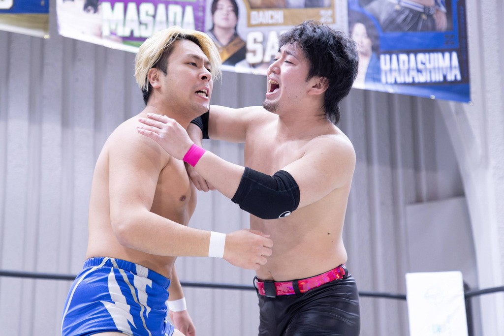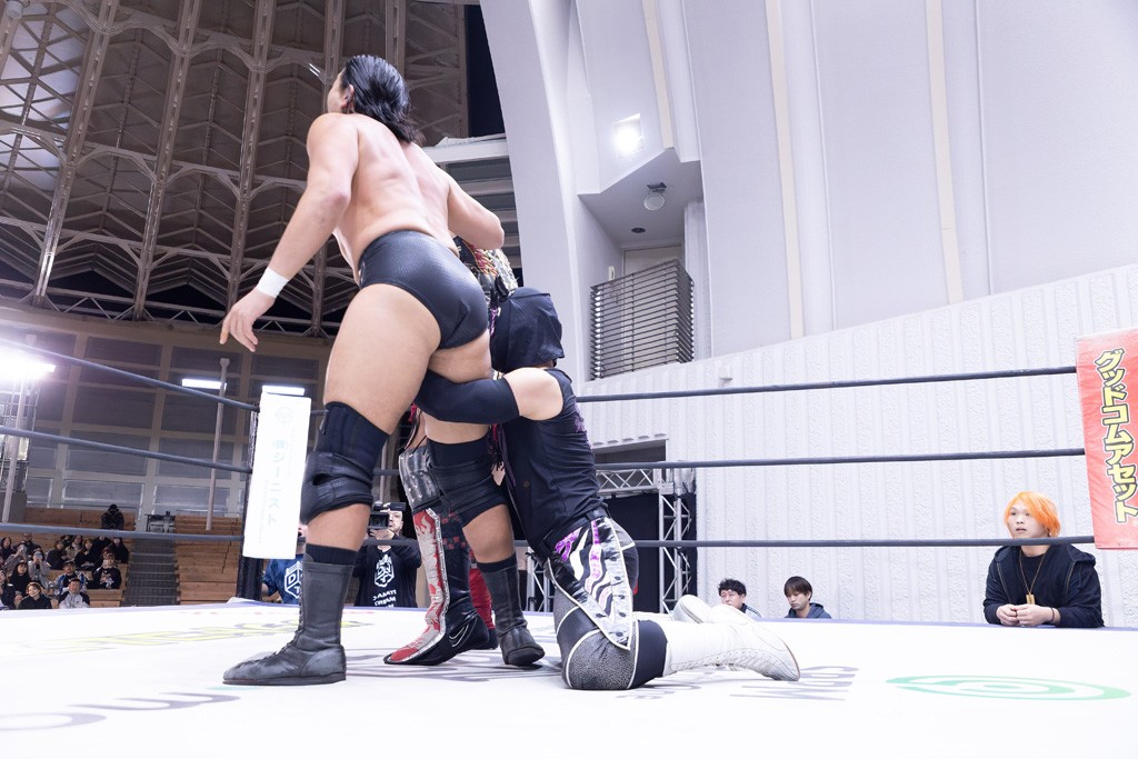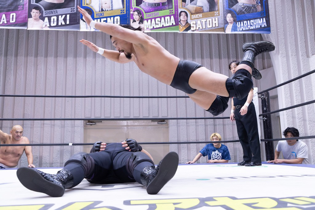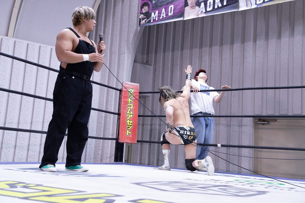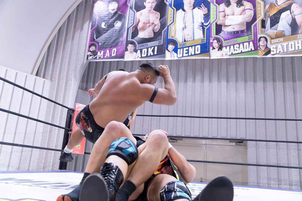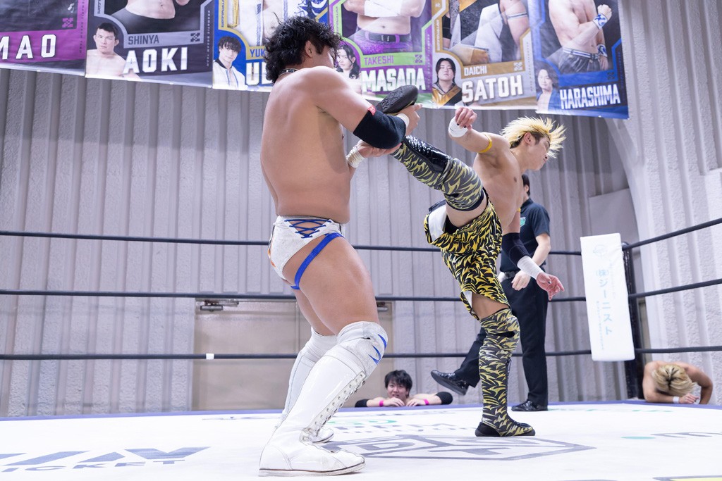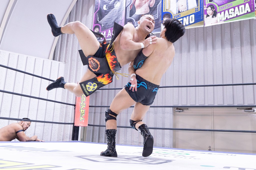 10月23日「ビアガーデンプロレス 2025 〜 THE FINAL 〜」東京・上野恩賜公園野外ステージ大会が開催。この日のセミファイナルは「KING OF DRUNK 2025 FINAL~年間王者決定戦~」と題し、3月27日上野大会で春の王者となったMAO、7月16日新宿大会でトリプルフォールにより3者同時で夏の王者となったHARASHIMA、佐々木大輔、クリス・ブルックスの計4人がドランクマッチ年間王者の座を懸けて激突した。今回の試合は、通常のプロレスルールに加え、試合中のランダムなタイミングで曲が流れ、その度にお酒を1杯飲み干さなくては失格となるルールで行われた。4選手が入場してくると、すでに全員泥酔状態。乾杯からビールを飲み干すと試合開始のゴングが鳴らされた。試合はいきなりの泥試合。グダグダな展開から曲が流れビールを4人、さらに松井レフェリーまでも飲み干し次第に仕上がっていく。松井レフェリーに一同がゴムパッチンを狙う展開になるが、松井レフェリーの逆襲に遭いクリス、MAO、HARASHIMAがゴムパッチンを被弾。中盤に差し掛かると、酒がテキーラに変更。4人の泥酔度合いが加速していく。場外に戦場を移すと、HARASHIMAが蒼魔刀を狙ったところで「爆乳戦隊パイレンジャー」がかかり、踊り出してしまい蒼魔刀は出来ず。増量したビールを4人が飲み干すと試合続行。リングに戻るとMAOが蒼魔刀を狙うが、またも「パイレンジャー」がヒット。ビールを飲み干した後に試合再開。クリスが蒼魔刀を狙うもまたまた「パイレンジャー」がヒットし中断。何とか4人が飲み干し試合を再開すると、佐々木が蒼魔刀狙うもまたまたまた「パイレンジャー」。4人が酒を飲み干そうとしたところ、突如今林GMが「いくらビアガーデンでもふざけ過ぎだろ!」とブチギレ。お客さんにも悪態をつくと、松井レフェリーをリングから追放。怒りの収まらない今林GMが「酒飲んでふざけてる奴らを見て喜んでる時代じゃねぇんだよ! 学生じゃねぇんだからさ!」と言うと、4人を次々と叱責していき「お前らもうちょっとプロレスに真摯に向き合えよ! ちゃんとプロレスしようぜ!」と叫んだところで「パイレンジャー」がヒット。すると今林GMもこの曲の魔力は打ち勝てず、踊り始める。今林GMがクリス、MAO、佐々木と裏拳で蹴散らすが、避けたHARASHIMAがアームブリーカーで今林GMの腕を破壊。今林GMが排除されると、コーナーで折り重なった佐々木&MAO&クリスにHARASHIMAがついに串刺し式の蒼魔刀を決めるもそのままダウン。するとHARASHIMAの上に3人が次々とダウン。松井レフェリーが3カウントを叩き試合は終了。松井レフェリーが折り重なった選手を1人ずつ剥がしていくと、HARASHIMAの真上で覆い被さりフォールの状態になっていたのは佐々木。松井レフェリーが佐々木を勝者と認定し、KING OF DRUNK 2025の年間王者は佐々木となった。バックステージで佐々木は「俺がKING OF DRUNK 2025覇者だ。俺は常識人だ。俺たちの飲み方を見てこんな飲み方をしてはいけないと学んで、家でやれ。ゲロぶち撒けるぞ、この野郎……!」と注意喚起なのか何なのかわからないことを叫び消えていった。
