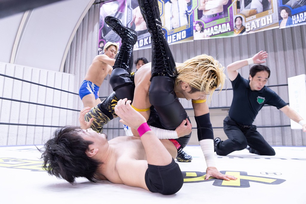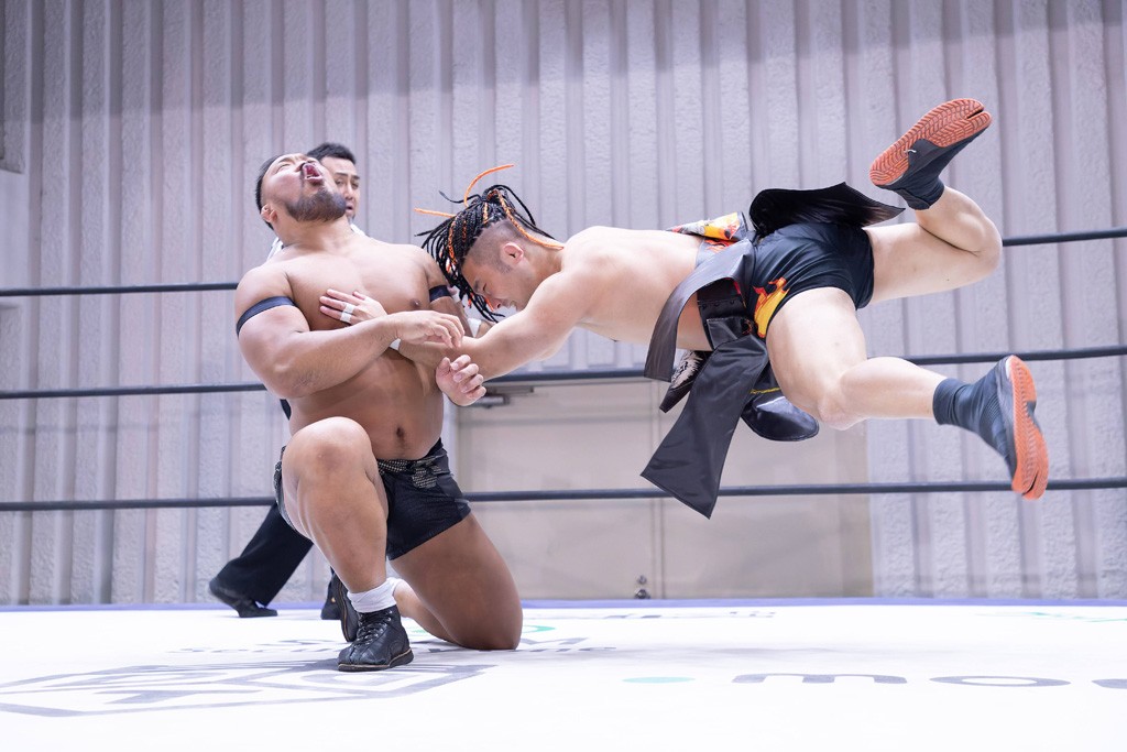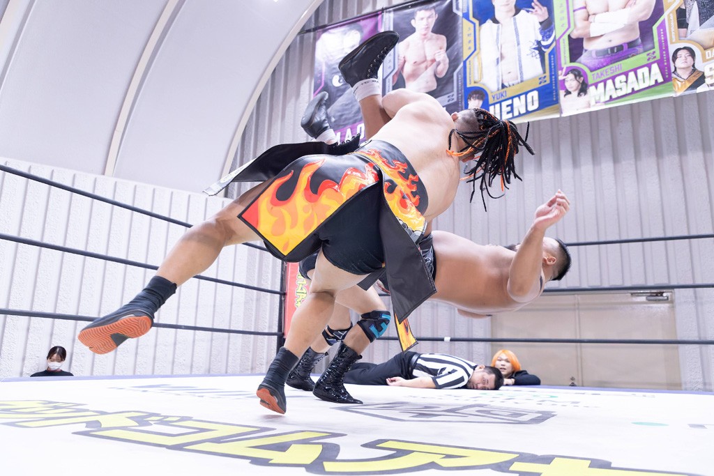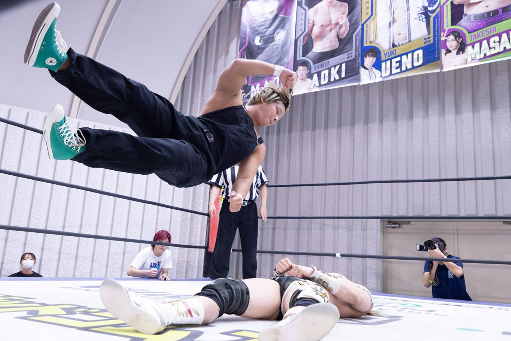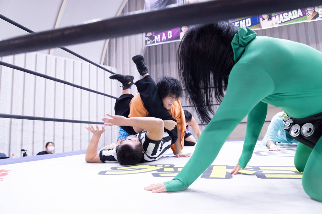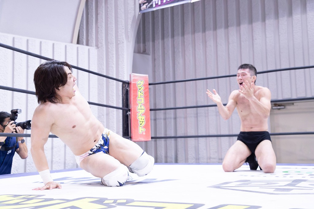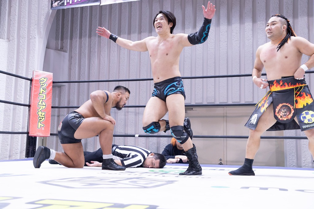 10月23日「ビアガーデンプロレス 2025 〜 THE FINAL 〜」東京・上野恩賜公園野外ステージ大会が開催。この日のセミファイナルは「KING OF DRUNK 2025 FINAL~年間王者決定戦~」と題し、3月27日上野大会で春の王者となったMAO、7月16日新宿大会でトリプルフォールにより3者同時で夏の王者となったHARASHIMA、佐々木大輔、クリス・ブルックスの計4人がドランクマッチ年間王者の座を懸けて激突した。今回の試合は、通常のプロレスルールに加え、試合中のランダムなタイミングで曲が流れ、その度にお酒を1杯飲み干さなくては失格となるルールで行われた。4選手が入場してくると、すでに全員泥酔状態。乾杯からビールを飲み干すと試合開始のゴングが鳴らされた。試合はいきなりの泥試合。グダグダな展開から曲が流れビールを4人、さらに松井レフェリーまでも飲み干し次第に仕上がっていく。松井レフェリーに一同がゴムパッチンを狙う展開になるが、松井レフェリーの逆襲に遭いクリス、MAO、HARASHIMAがゴムパッチンを被弾。中盤に差し掛かると、酒がテキーラに変更。4人の泥酔度合いが加速していく。場外に戦場を移すと、HARASHIMAが蒼魔刀を狙ったところで「爆乳戦隊パイレンジャー」がかかり、踊り出してしまい蒼魔刀は出来ず。増量したビールを4人が飲み干すと試合続行。リングに戻るとMAOが蒼魔刀を狙うが、またも「パイレンジャー」がヒット。ビールを飲み干した後に試合再開。クリスが蒼魔刀を狙うもまたまた「パイレンジャー」がヒットし中断。何とか4人が飲み干し試合を再開すると、佐々木が蒼魔刀狙うもまたまたまた「パイレンジャー」。4人が酒を飲み干そうとしたところ、突如今林GMが「いくらビアガーデンでもふざけ過ぎだろ!」とブチギレ。お客さんにも悪態をつくと、松井レフェリーをリングから追放。怒りの収まらない今林GMが「酒飲んでふざけてる奴らを見て喜んでる時代じゃねぇんだよ! 学生じゃねぇんだからさ!」と言うと、4人を次々と叱責していき「お前らもうちょっとプロレスに真摯に向き合えよ! ちゃんとプロレスしようぜ!」と叫んだところで「パイレンジャー」がヒット。すると今林GMもこの曲の魔力は打ち勝てず、踊り始める。今林GMがクリス、MAO、佐々木と裏拳で蹴散らすが、避けたHARASHIMAがアームブリーカーで今林GMの腕を破壊。今林GMが排除されると、コーナーで折り重なった佐々木&MAO&クリスにHARASHIMAがついに串刺し式の蒼魔刀を決めるもそのままダウン。するとHARASHIMAの上に3人が次々とダウン。松井レフェリーが3カウントを叩き試合は終了。松井レフェリーが折り重なった選手を1人ずつ剥がしていくと、HARASHIMAの真上で覆い被さりフォールの状態になっていたのは佐々木。松井レフェリーが佐々木を勝者と認定し、KING OF DRUNK 2025の年間王者は佐々木となった。バックステージで佐々木は「俺がKING OF DRUNK 2025覇者だ。俺は常識人だ。俺たちの飲み方を見てこんな飲み方をしてはいけないと学んで、家でやれ。ゲロぶち撒けるぞ、この野郎……!」と注意喚起なのか何なのかわからないことを叫び消えていった。