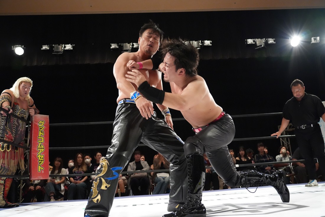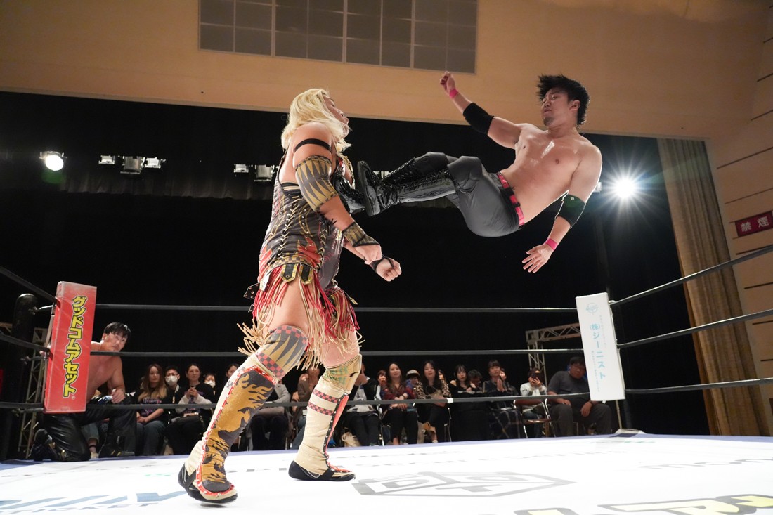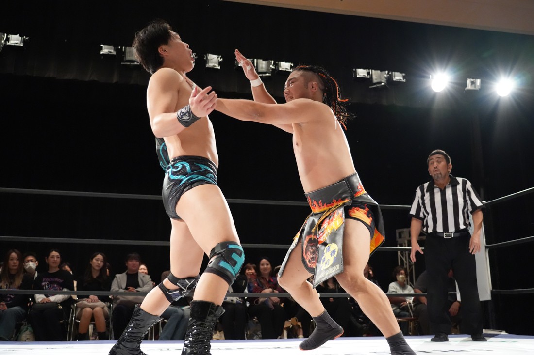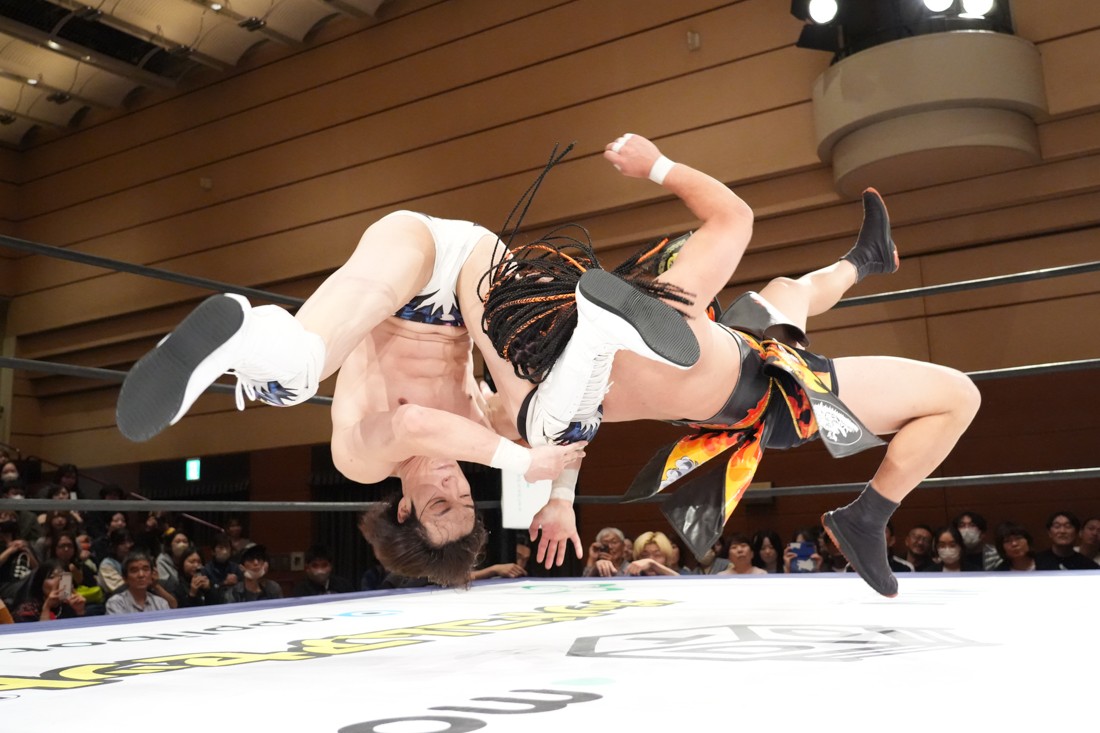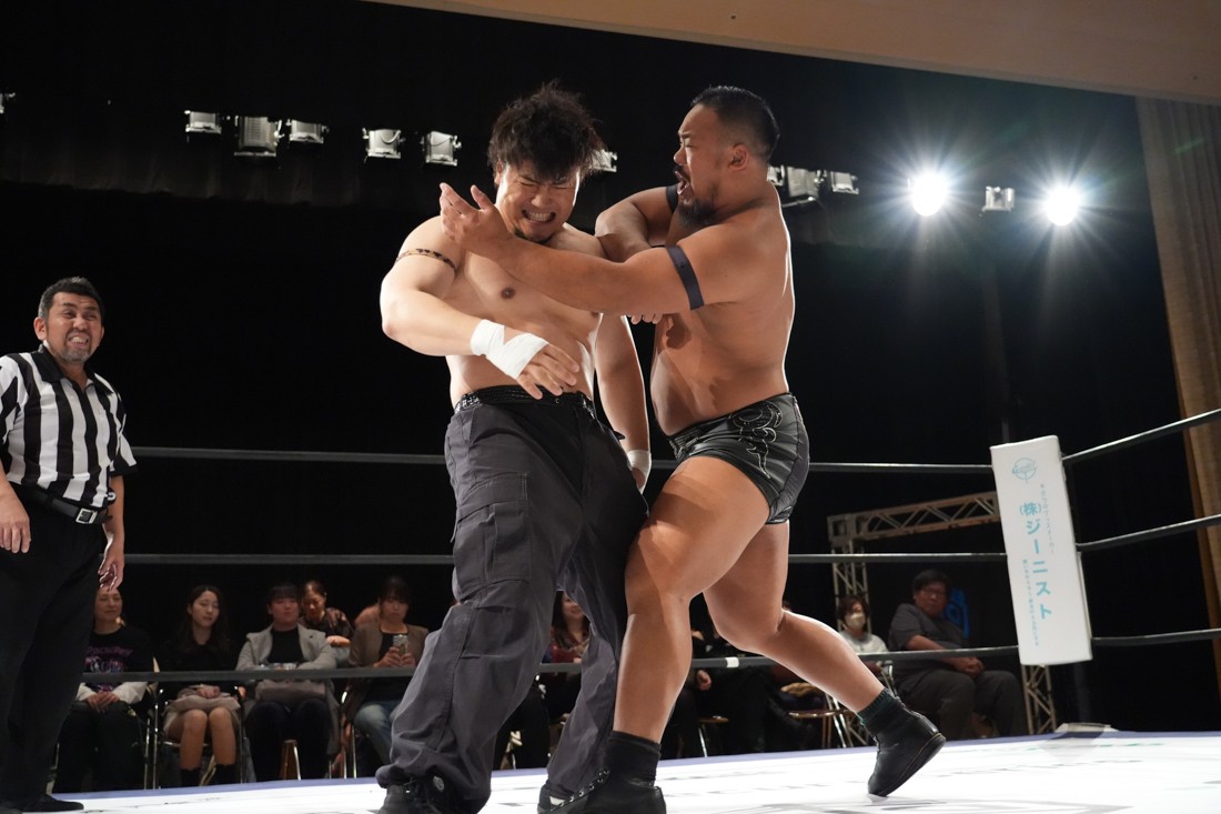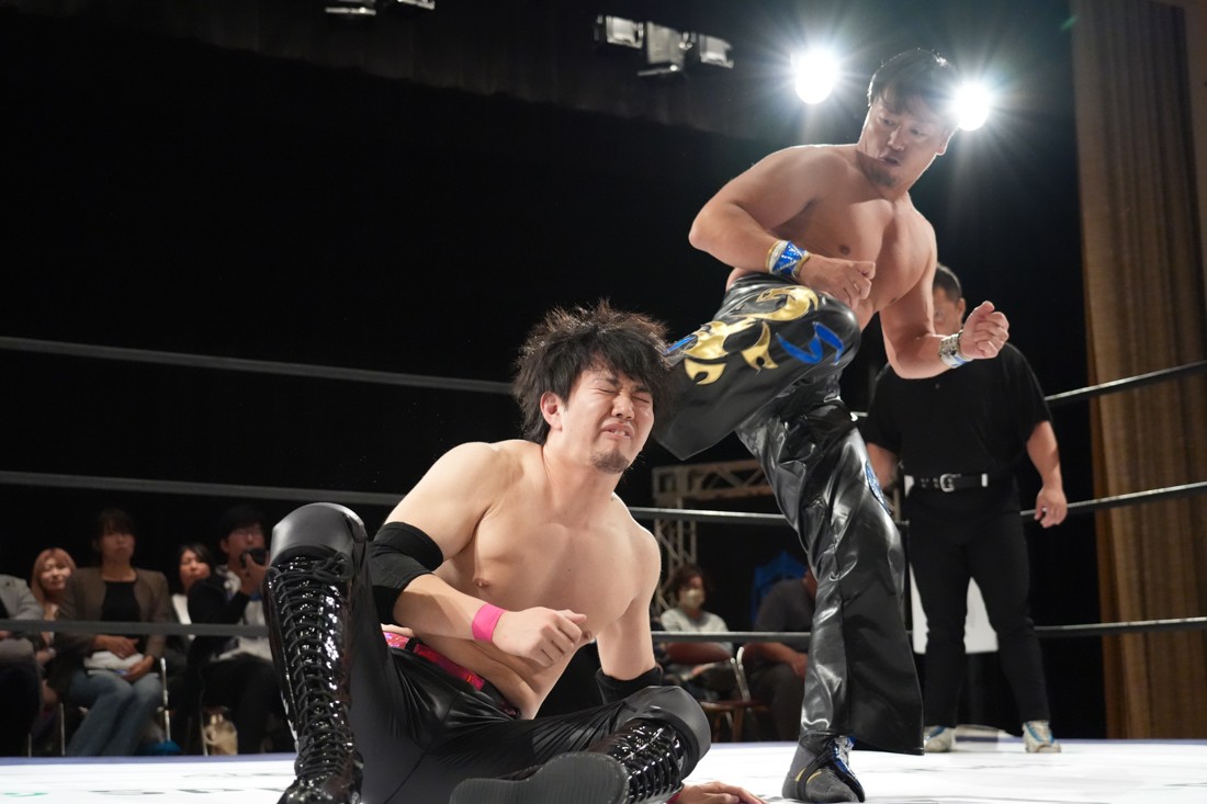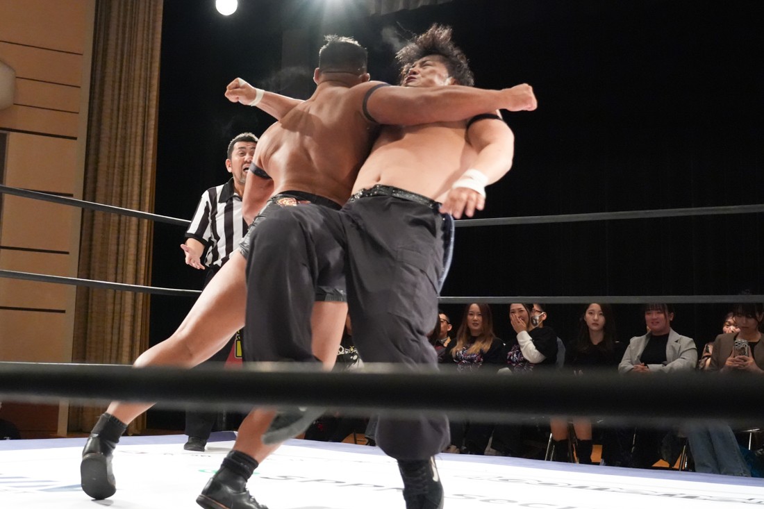 10月26日、愛知・今池ガスホールで「それいけ!イマイケモットイケ2025」が開催。セミファイナルでは前日の大阪大会に続き、11.3両国国技館大会でのKO-Dタッグ選手権の前哨戦として、今度は現タッグ王者・The Apexの飯野雄貴と、挑戦者組・STRANGE LOVE CONNECTIONのMAOがシングルマッチで対戦。