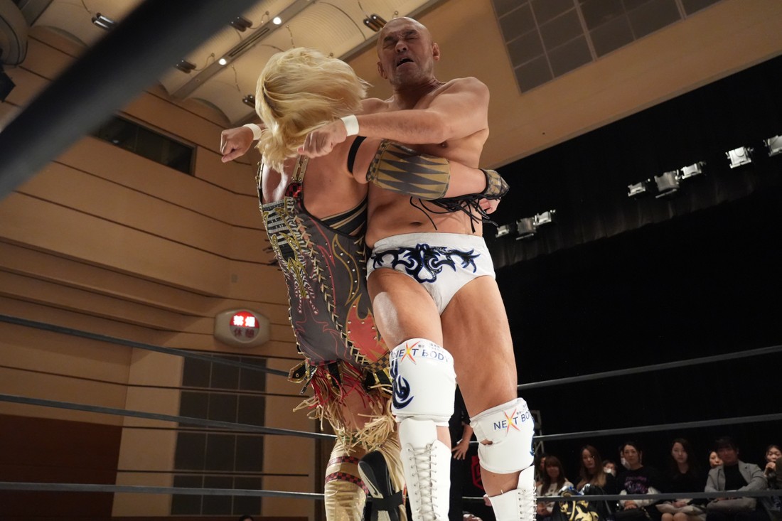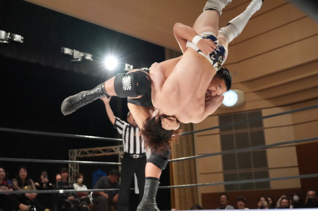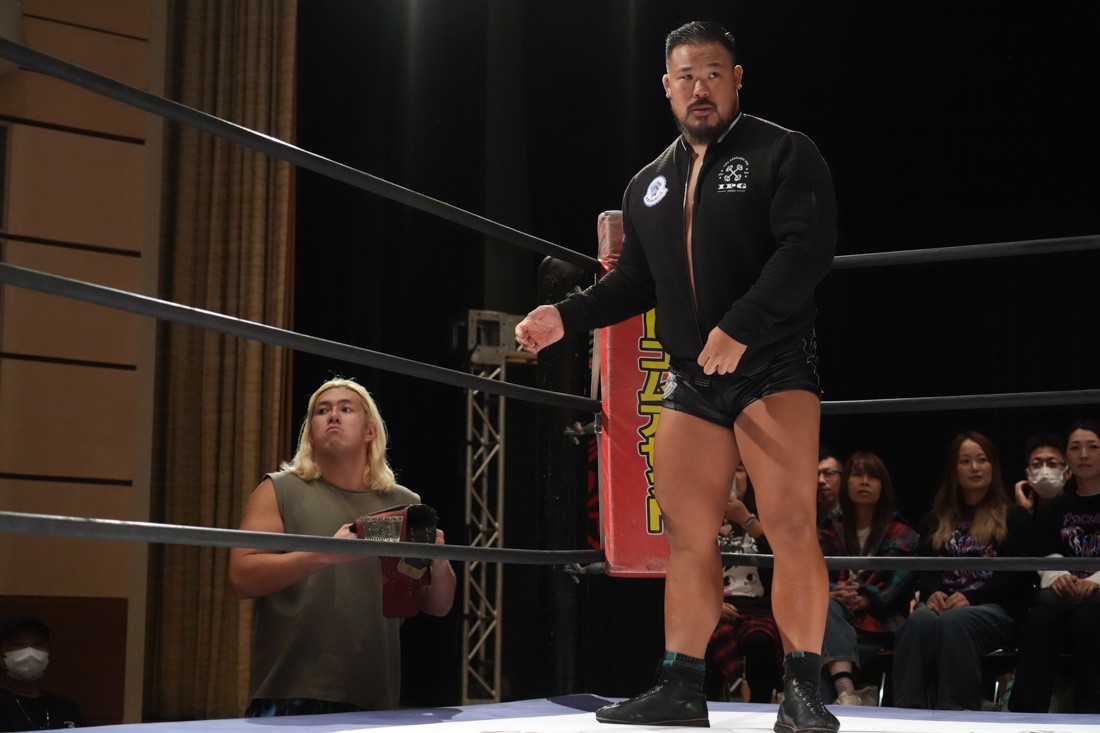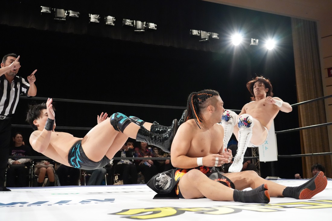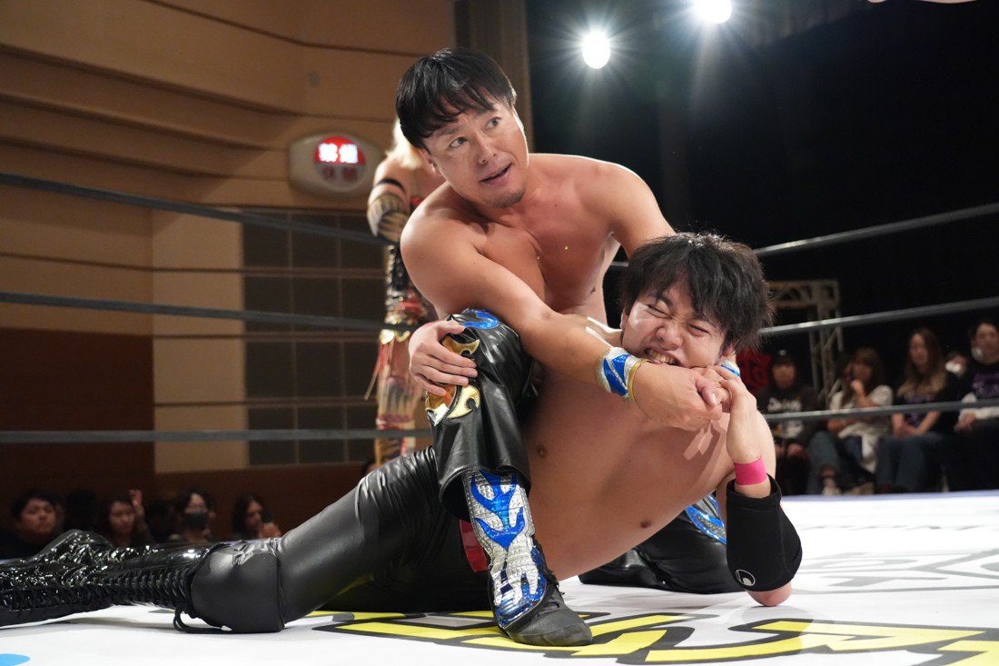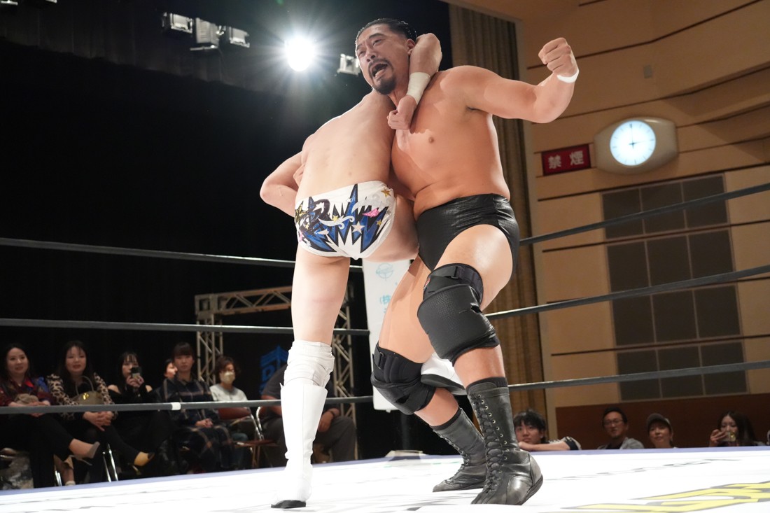 10月19日後楽園大会でThe Apexの持つKO-Dタッグ王座に挑戦し、惜しくも敗れた石田だったが、二冠王者タッグを相手にこの日も奮闘。上野とTo-y、二人まとめて小股すくいスープレックスで投げ、上野のフロッグスプラッシュもカウント2で返してみせたが、最後は上野のJul.2で無念の3カウント。
