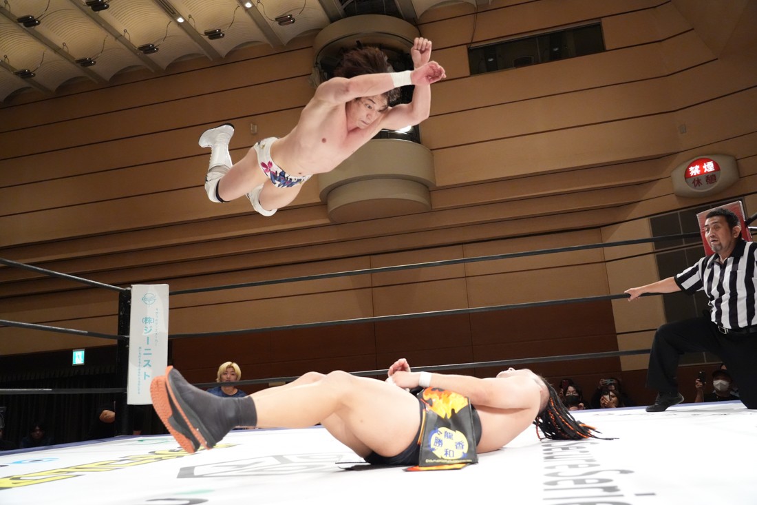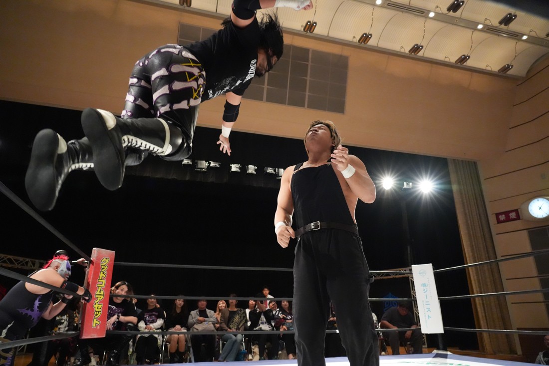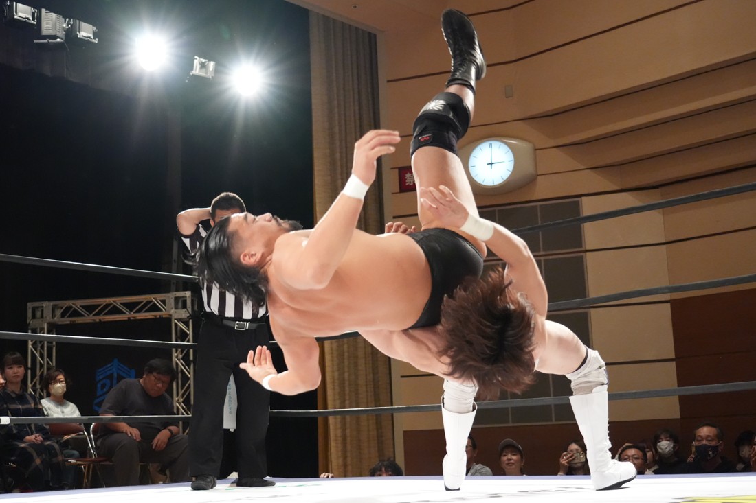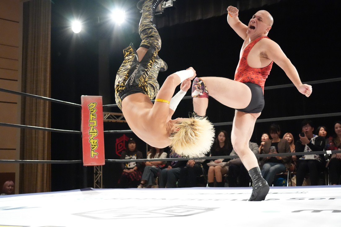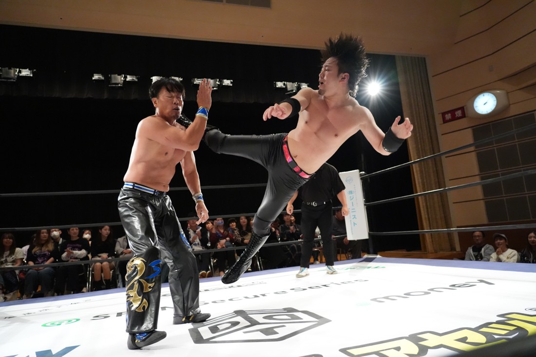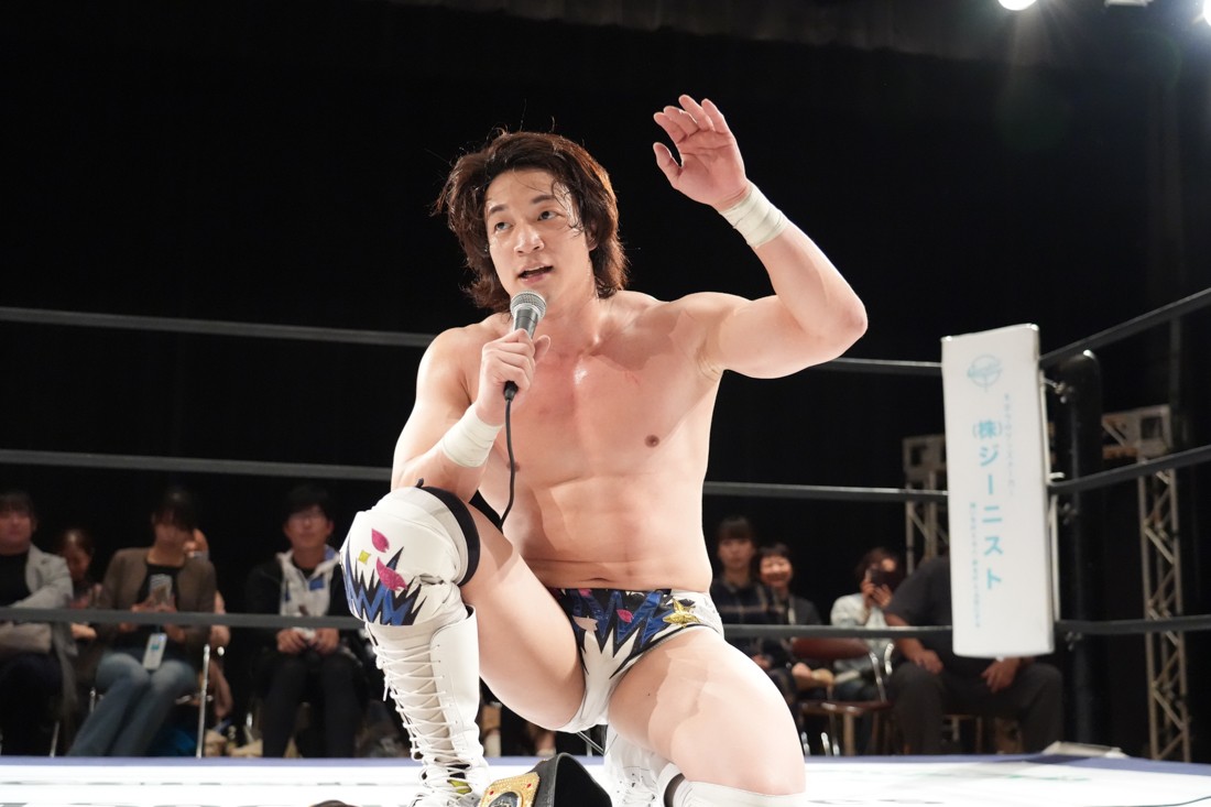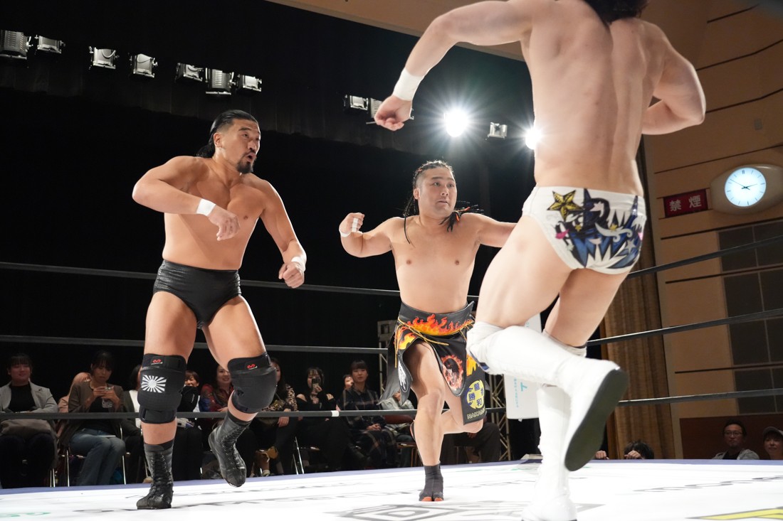 10月19日後楽園大会でThe Apexの持つKO-Dタッグ王座に挑戦し、惜しくも敗れた石田だったが、二冠王者タッグを相手にこの日も奮闘。上野とTo-y、二人まとめて小股すくいスープレックスで投げ、上野のフロッグスプラッシュもカウント2で返してみせたが、最後は上野のJul.2で無念の3カウント。
