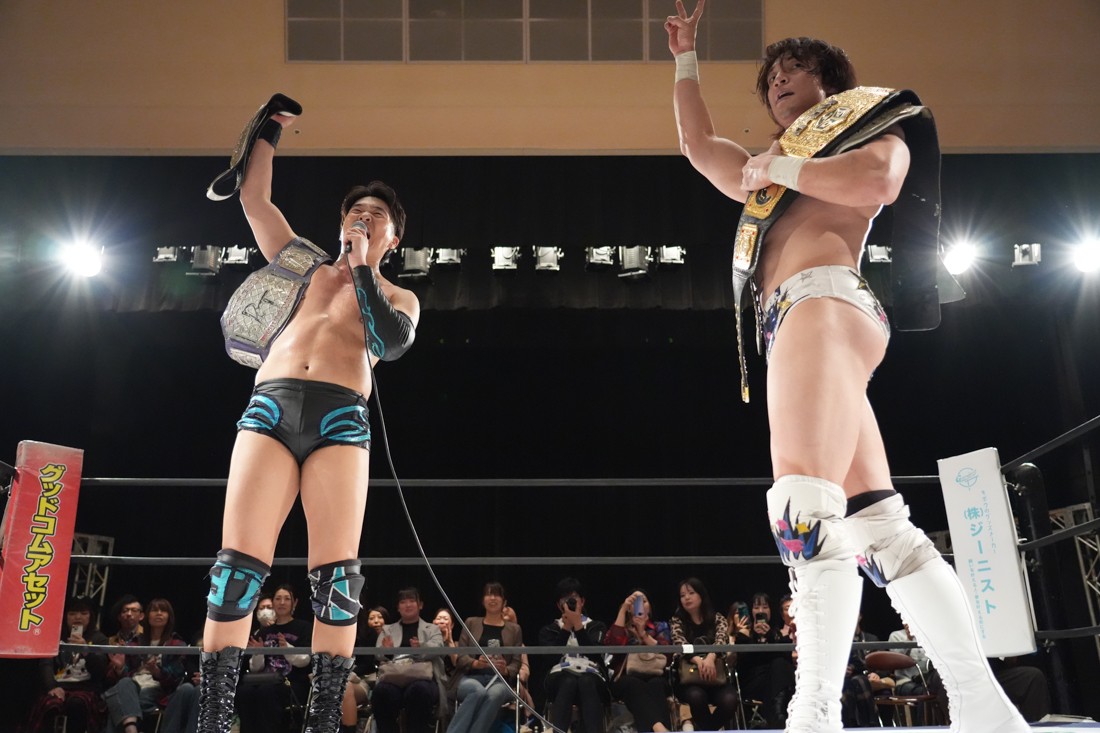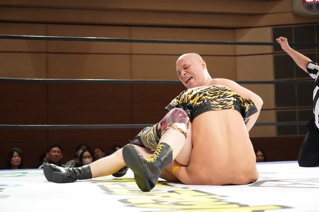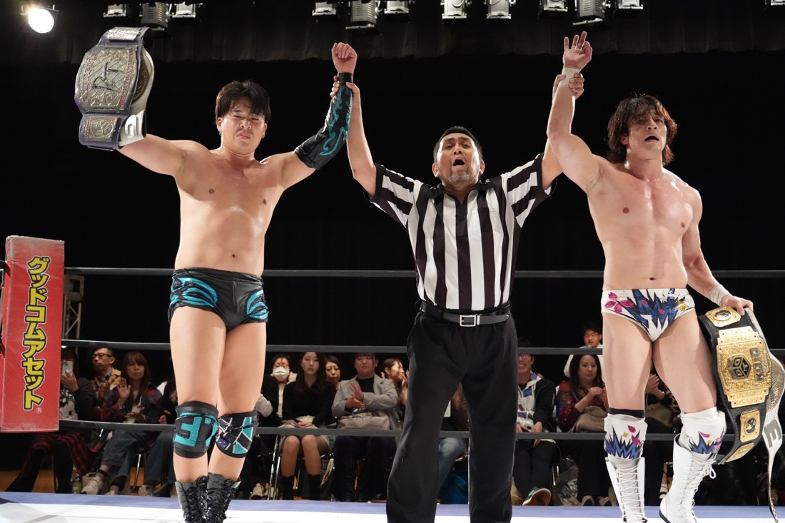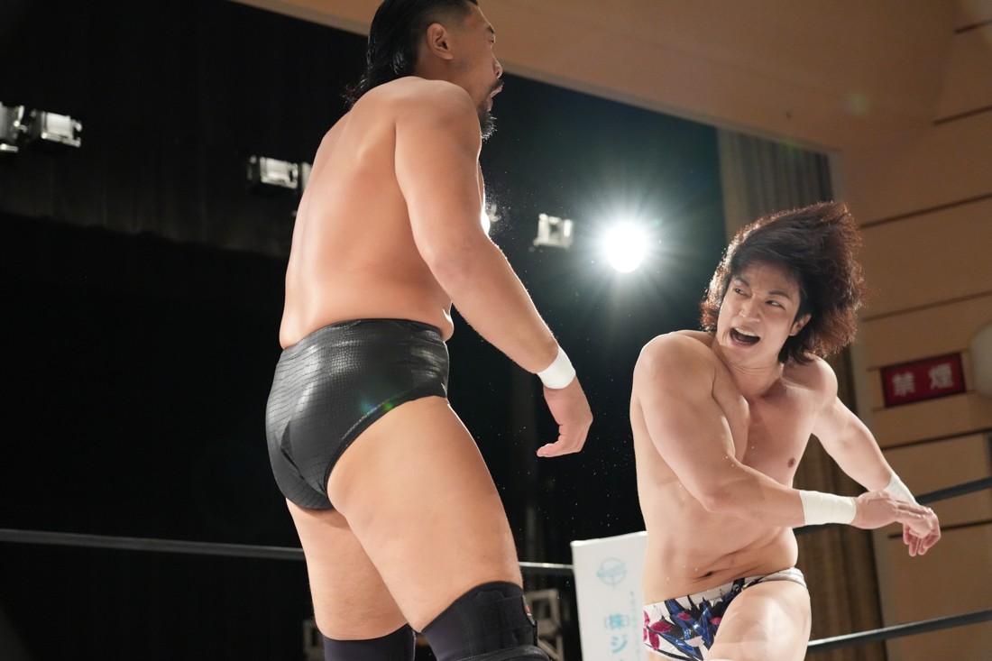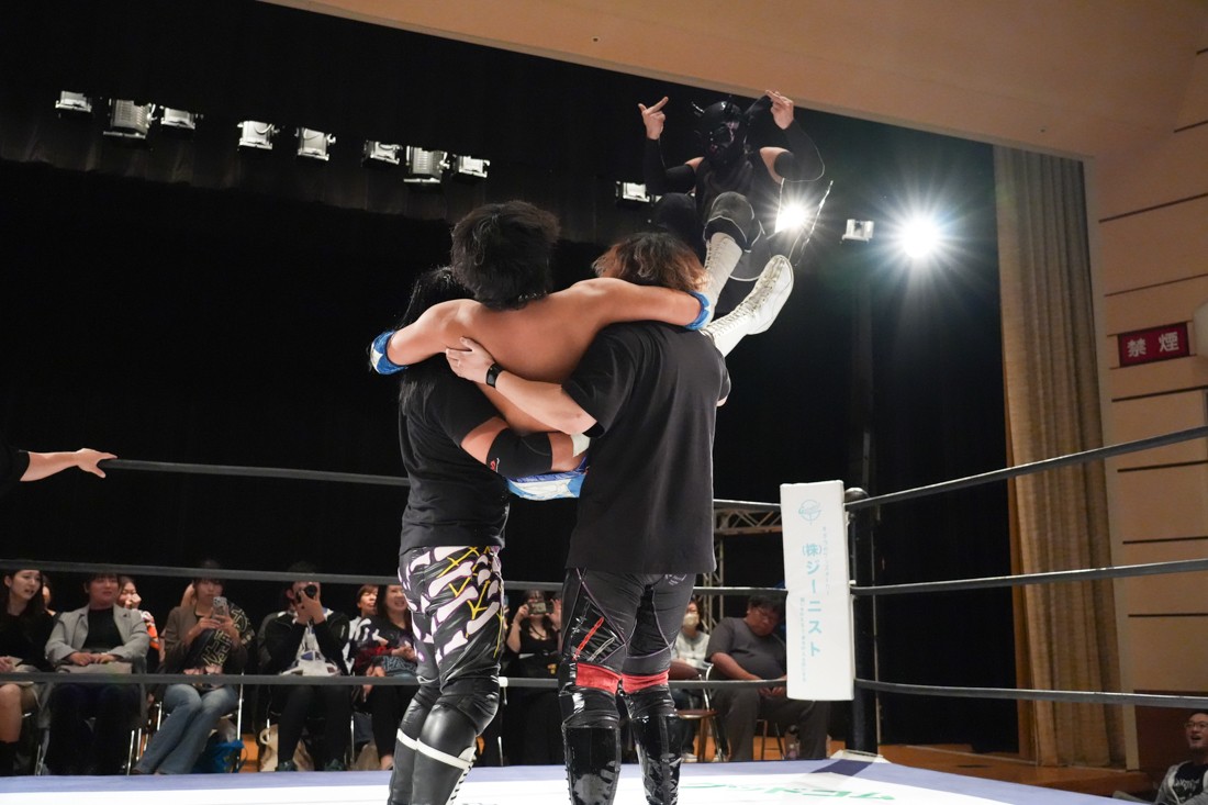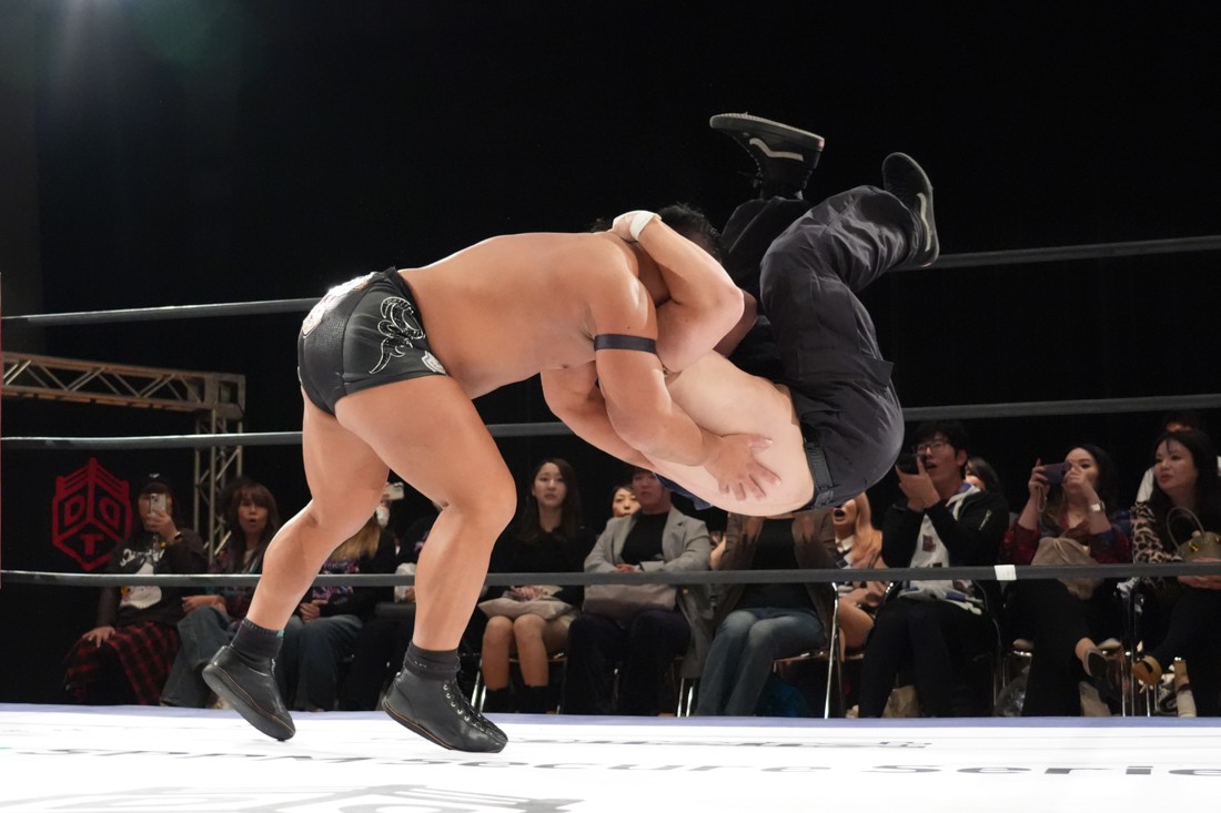10月19日後楽園大会でThe Apexの持つKO-Dタッグ王座に挑戦し、惜しくも敗れた石田だったが、二冠王者タッグを相手にこの日も奮闘。上野とTo-y、二人まとめて小股すくいスープレックスで投げ、上野のフロッグスプラッシュもカウント2で返してみせたが、最後は上野のJul.2で無念の3カウント。